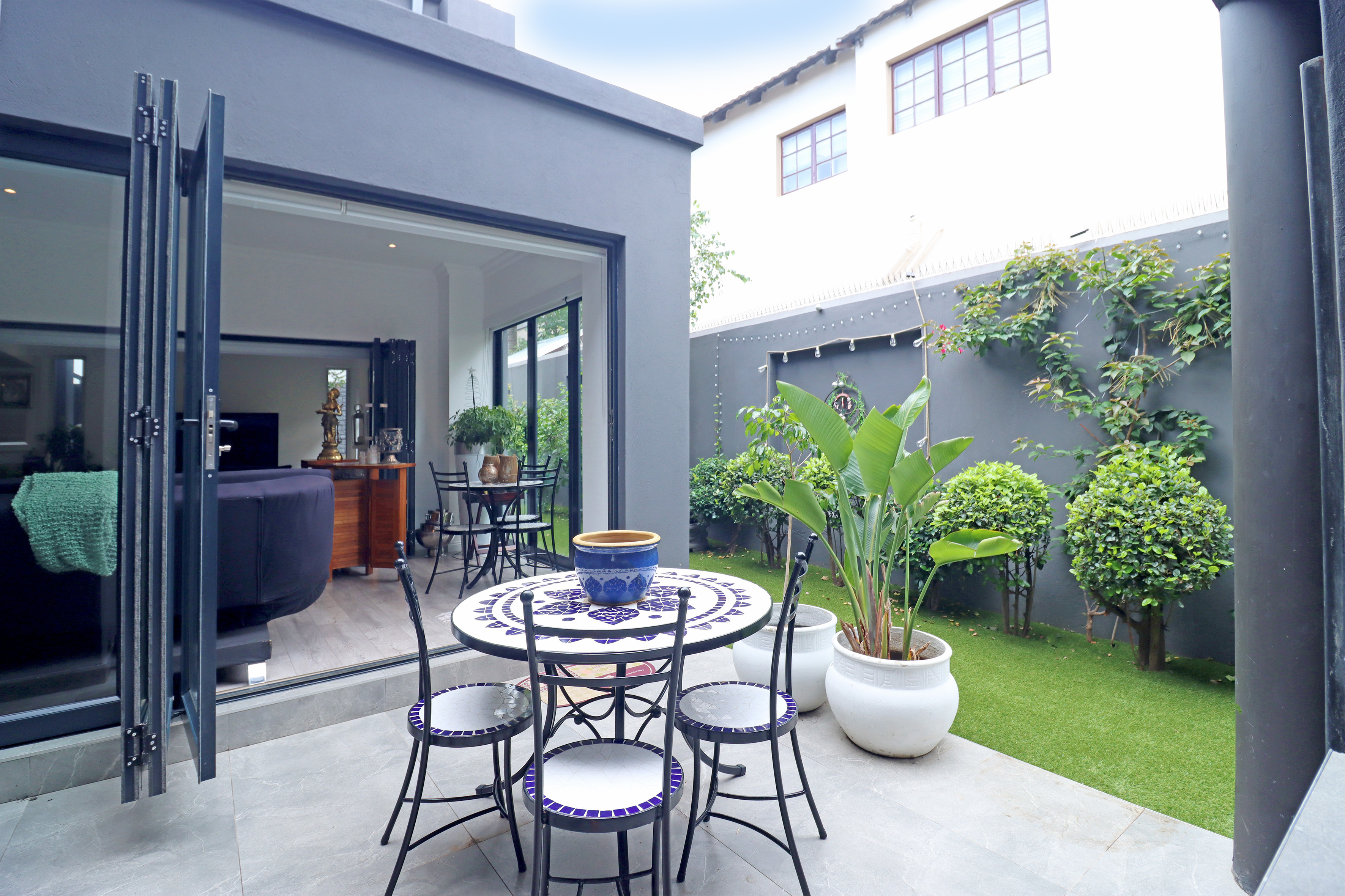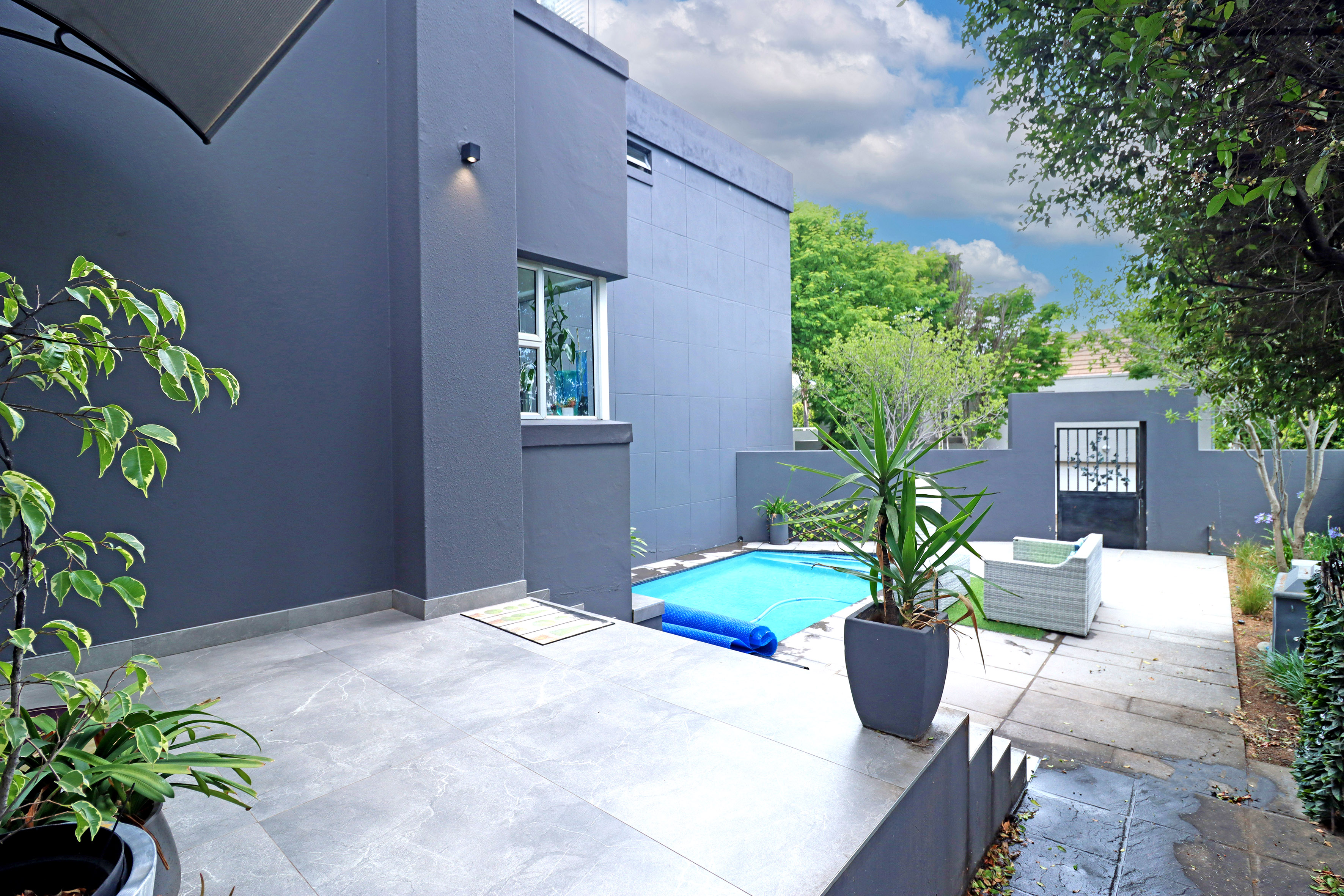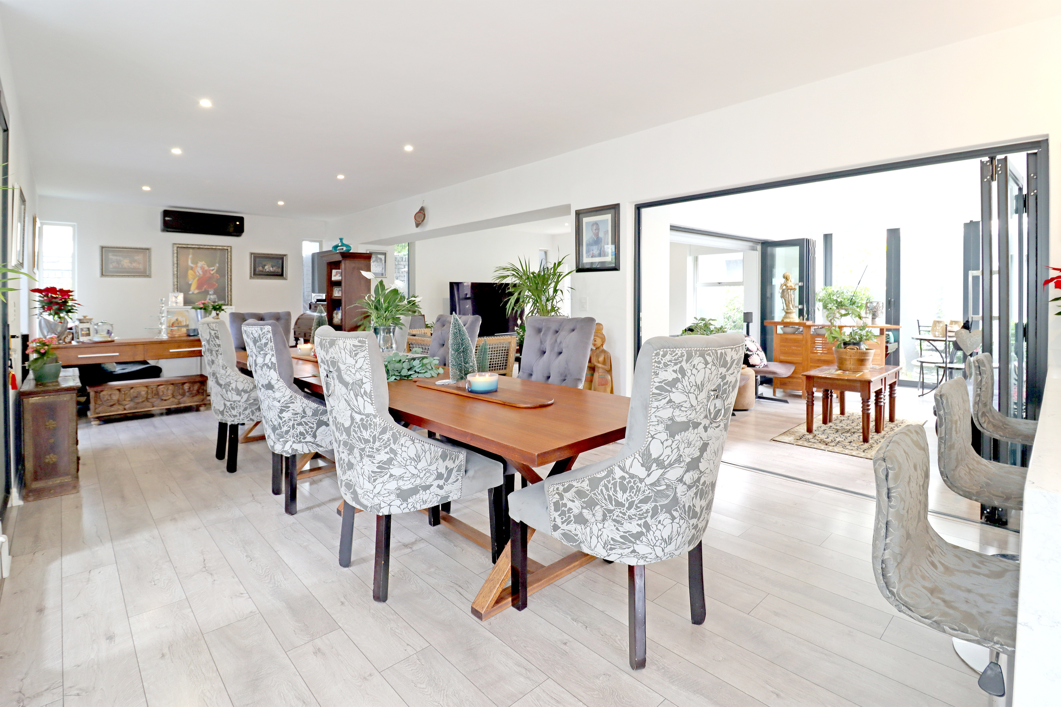 Easy maintenance garden with astroturf and newly built salt chlorinated heated pool completes the home.
