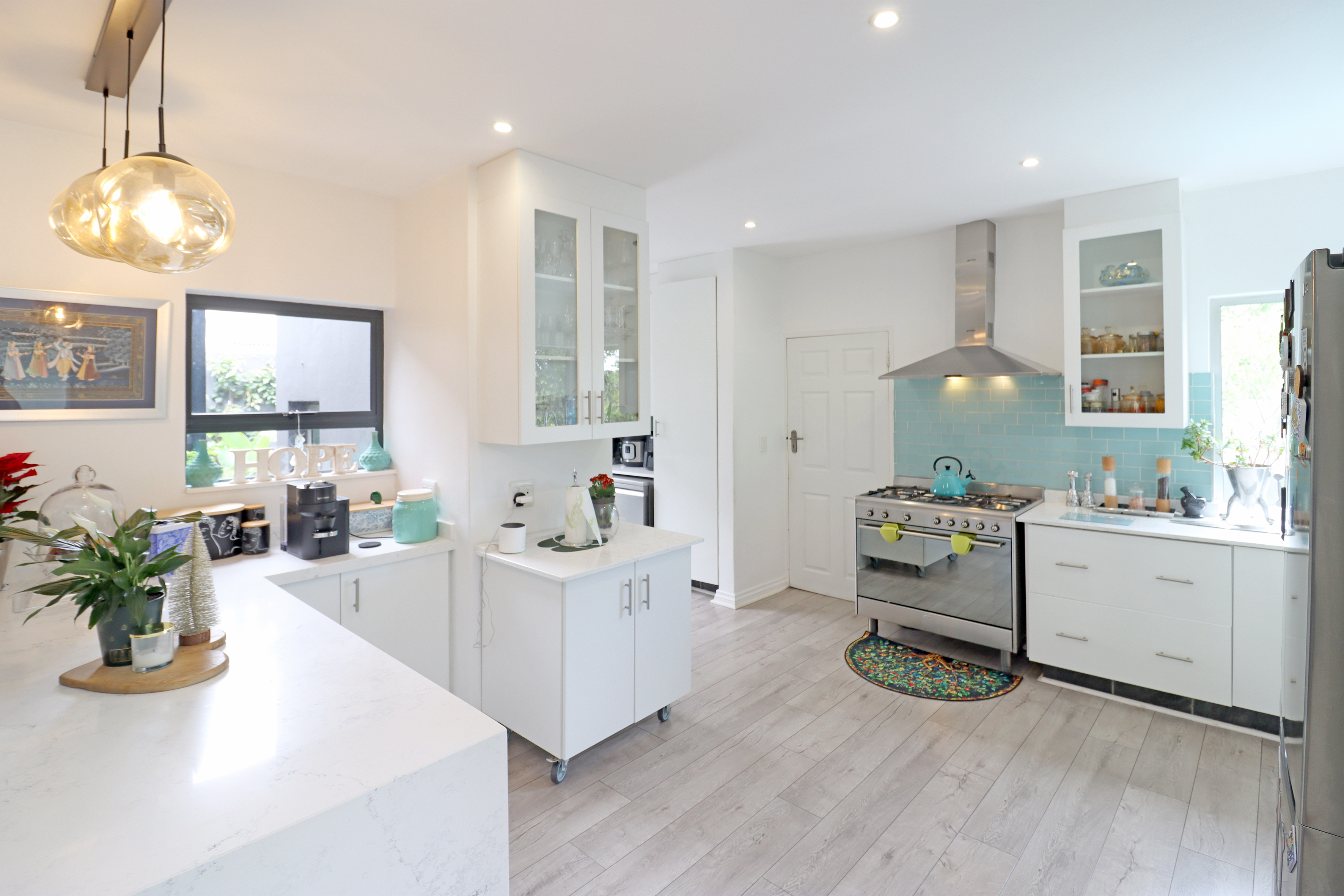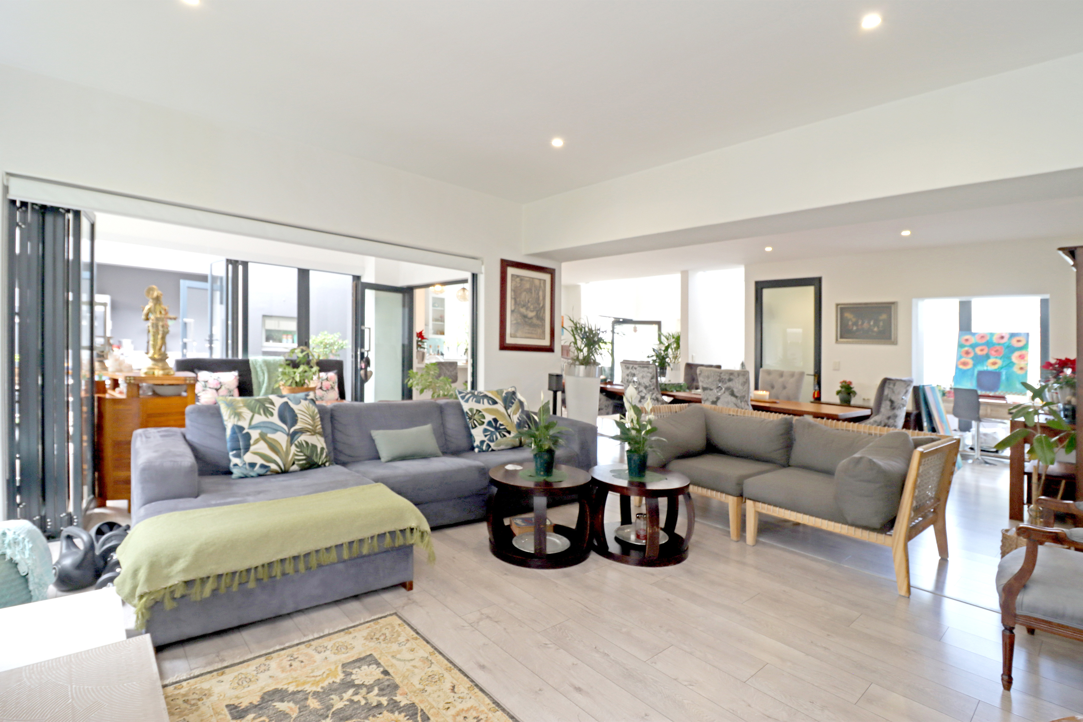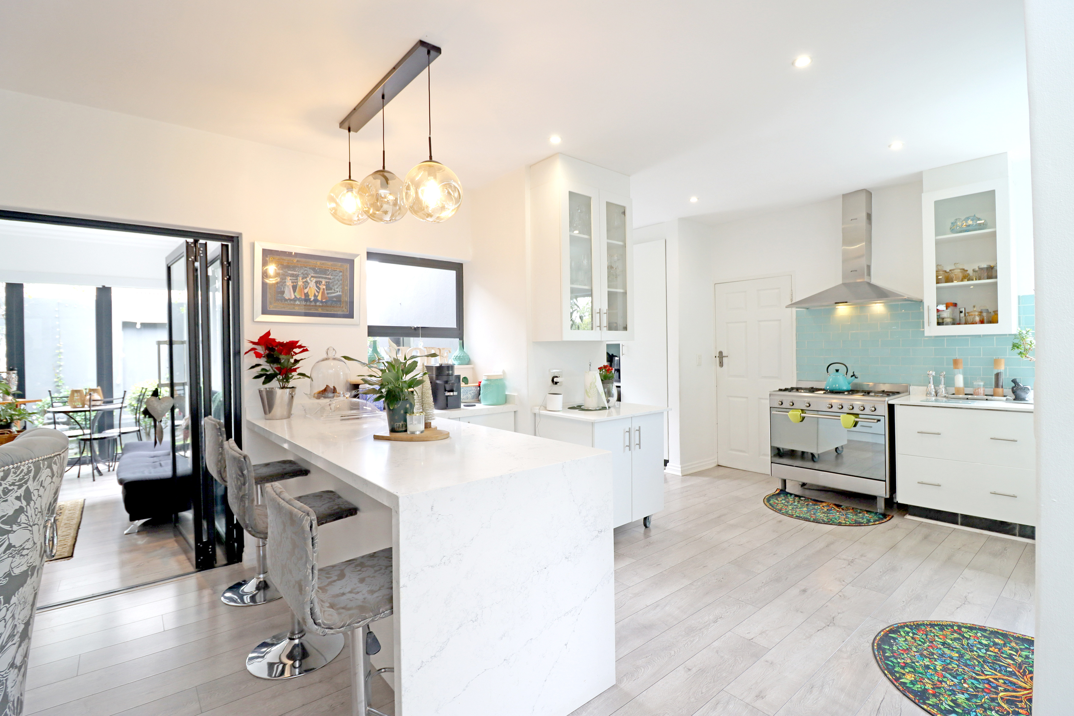 The living and entertainment areas are to die for and cater for year round entertaining! Fully open plan, lounge with fire place, dining area, kitchen and patio enclosed with stacker doors right the way round and opening out to an open area with a built in braai and prep bowl. Ultra modern kitchen featuring a smeg oven with gas hob, casual breakfast bar, butchers block and a separate scullery with space for all appliances. Study nook also with stacker doors to outside and a guest cloakroom completes the downstairs space.