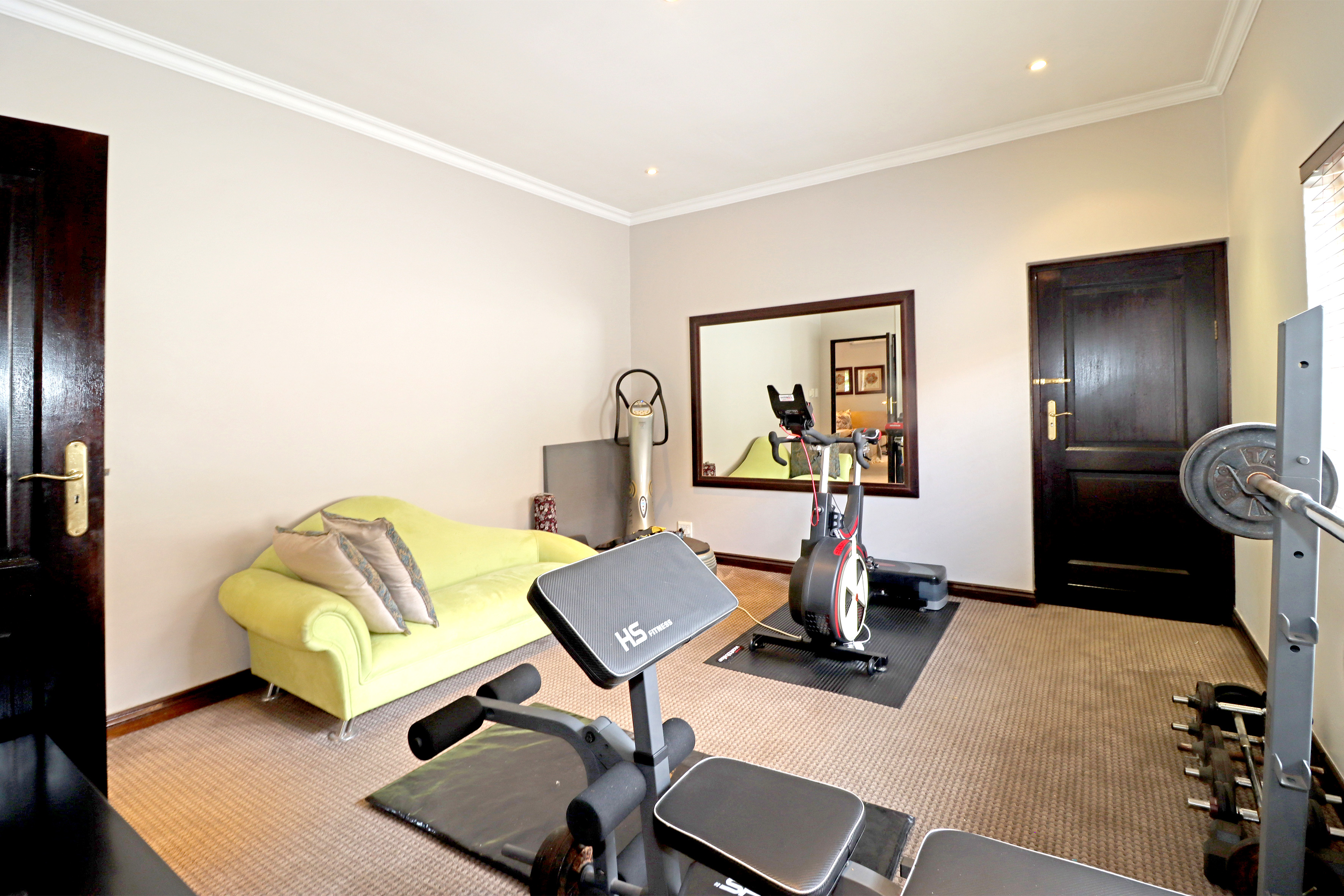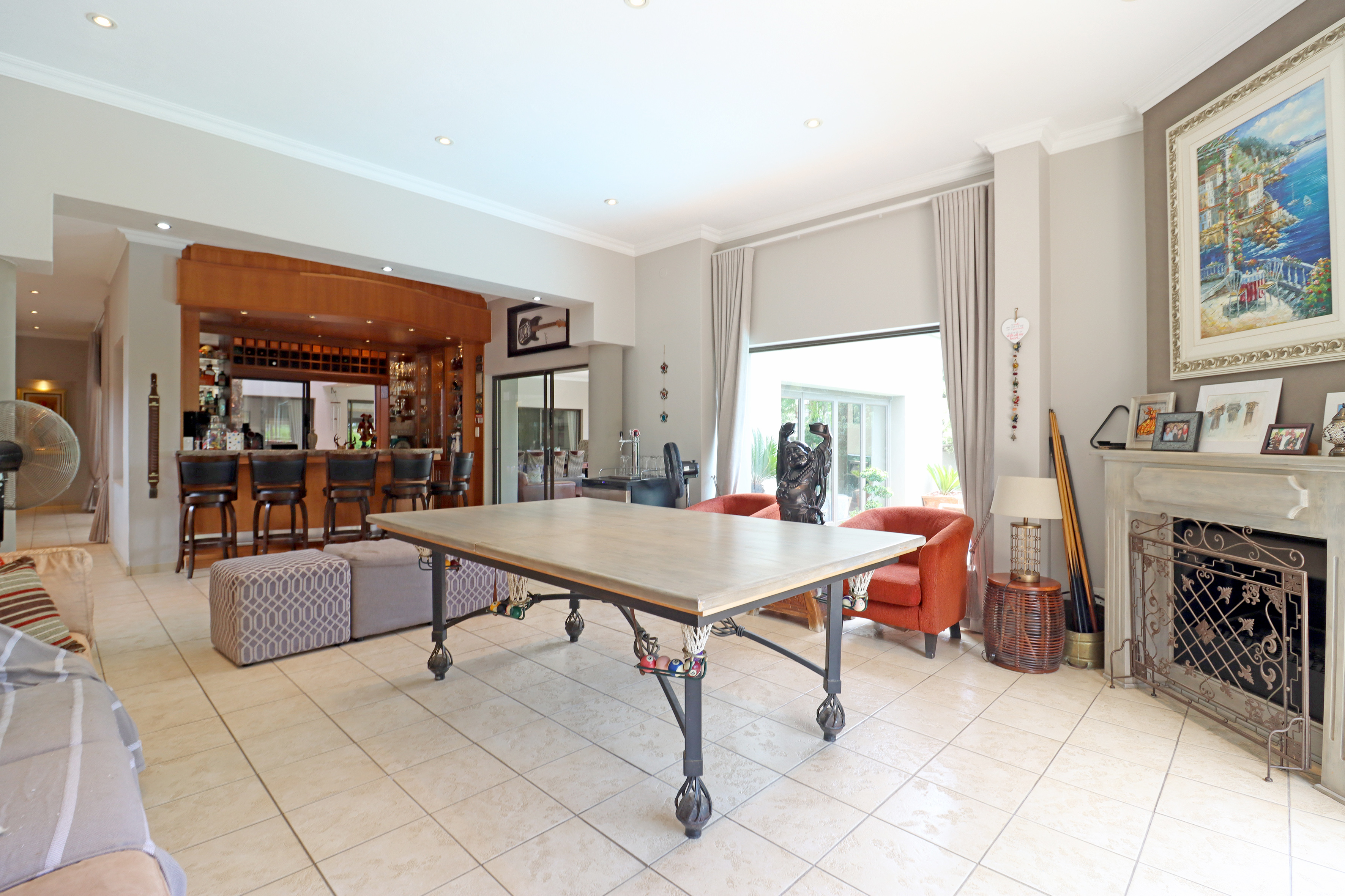 - The fully kitted bar and entertainment room, ideal to have your pool or snooker table and to watch the sports, leads out onto the extra-large patio and is the highlight of the entertainment space. Patio could easily host 50 people or more and offers a gas braai, fireplace and overlooks the manicured garden, koi pond and the sparkling pool.