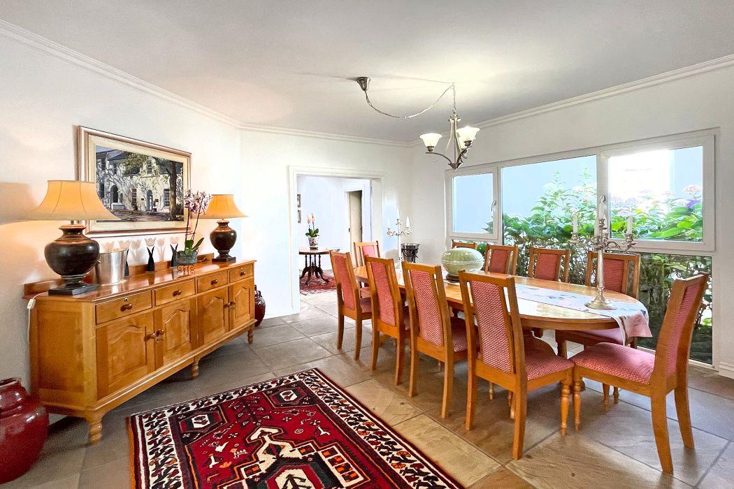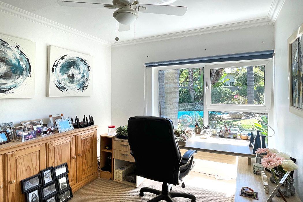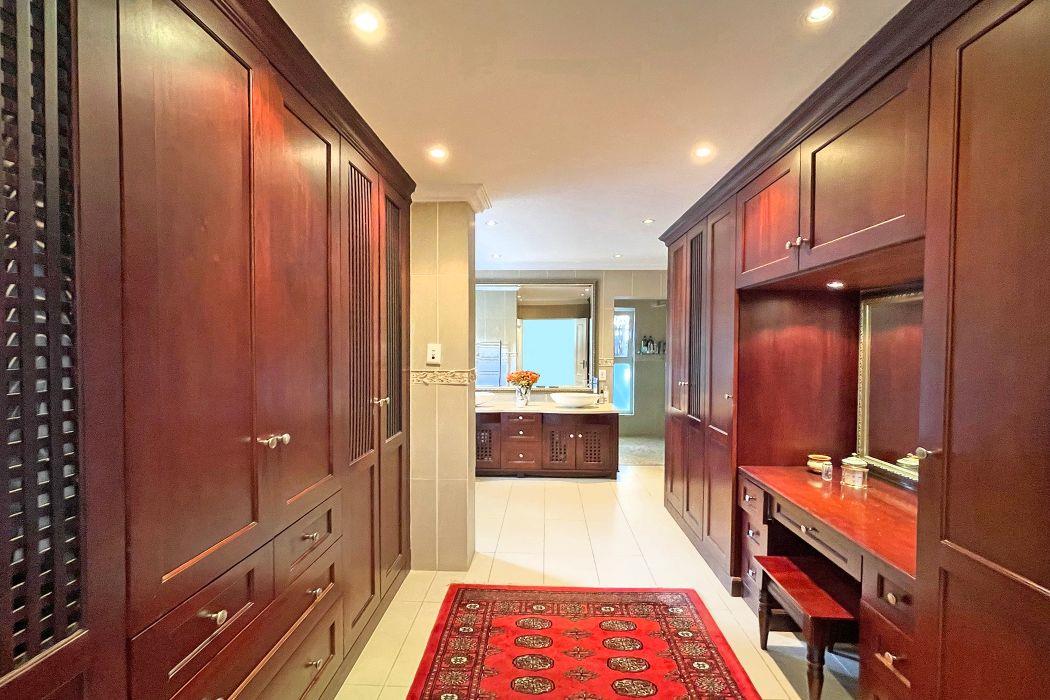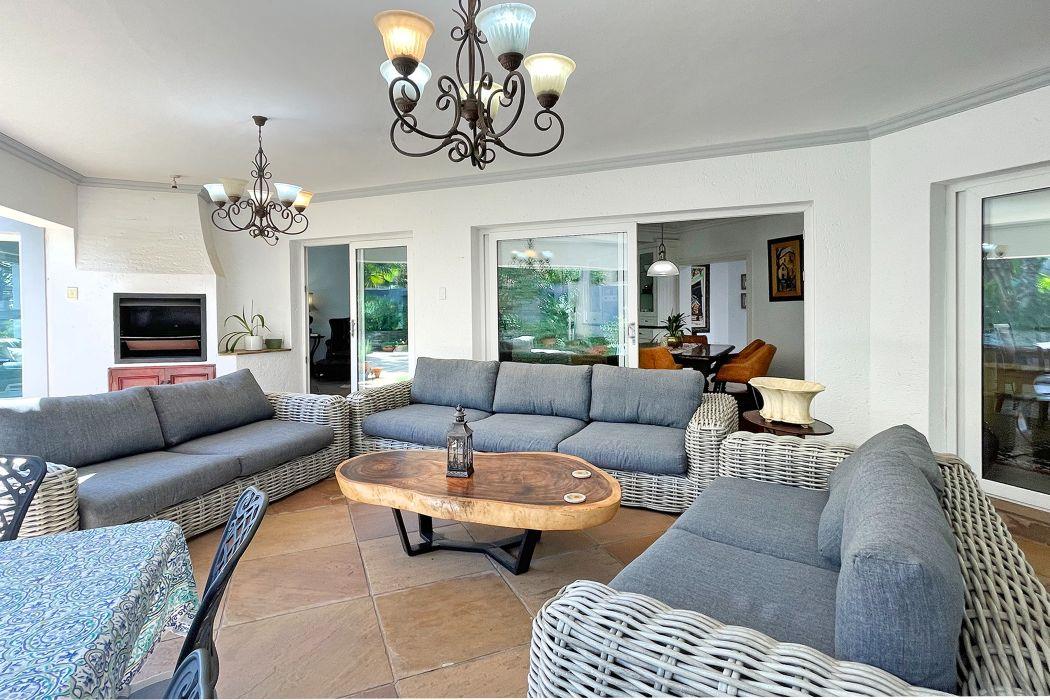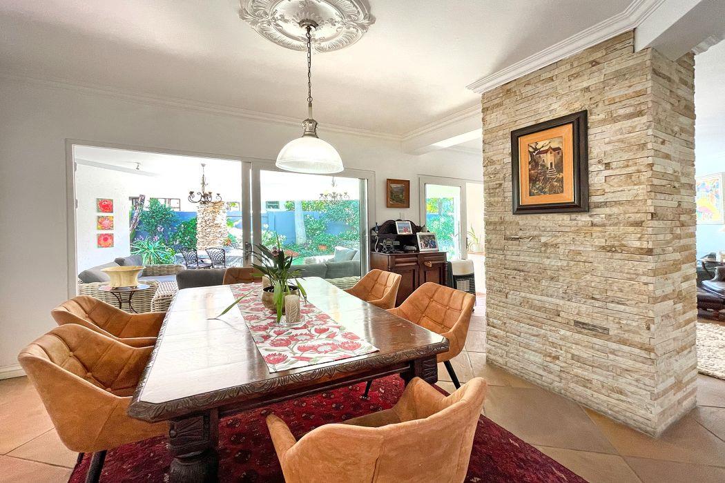 For entertaining, the formal lounge with its built-in bar, wood countertops, and Caesarstone feature wall provides a sophisticated space, complemented by a beautiful wine cellar. The covered patio with a built-in wood braai offers an ideal outdoor setting, overlooking the meticulously landscaped garden, which includes a sparkling heated pool surrounded by a secure fence.