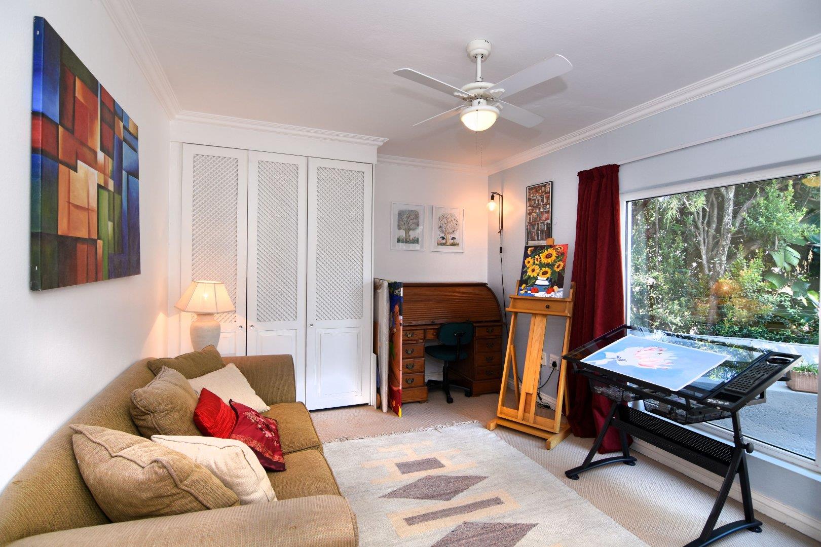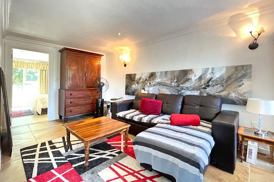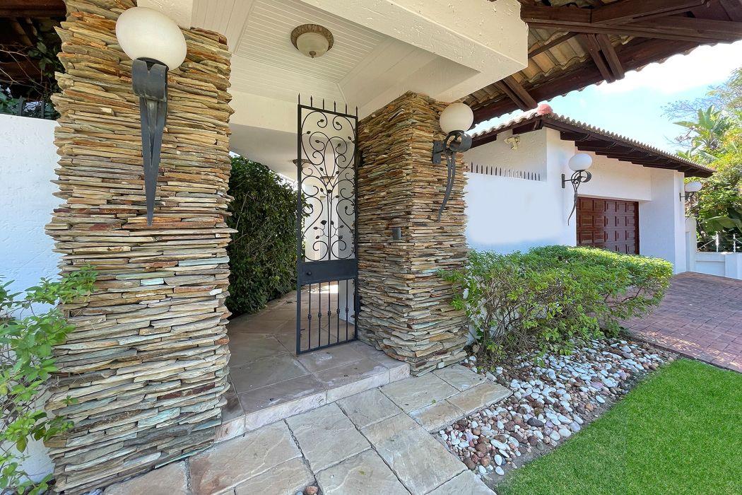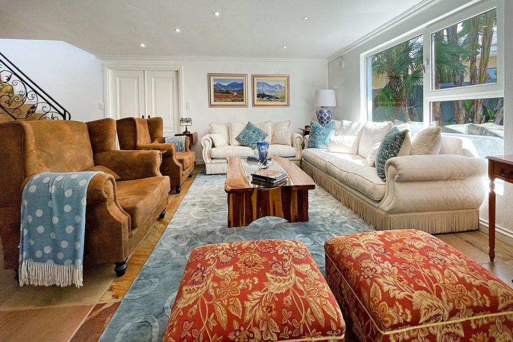 For entertaining, the formal lounge with its built-in bar, wood countertops, and Caesarstone feature wall provides a sophisticated space, complemented by a beautiful wine cellar. The covered patio with a built-in wood braai offers an ideal outdoor setting, overlooking the meticulously landscaped garden, which includes a sparkling heated pool surrounded by a secure fence.