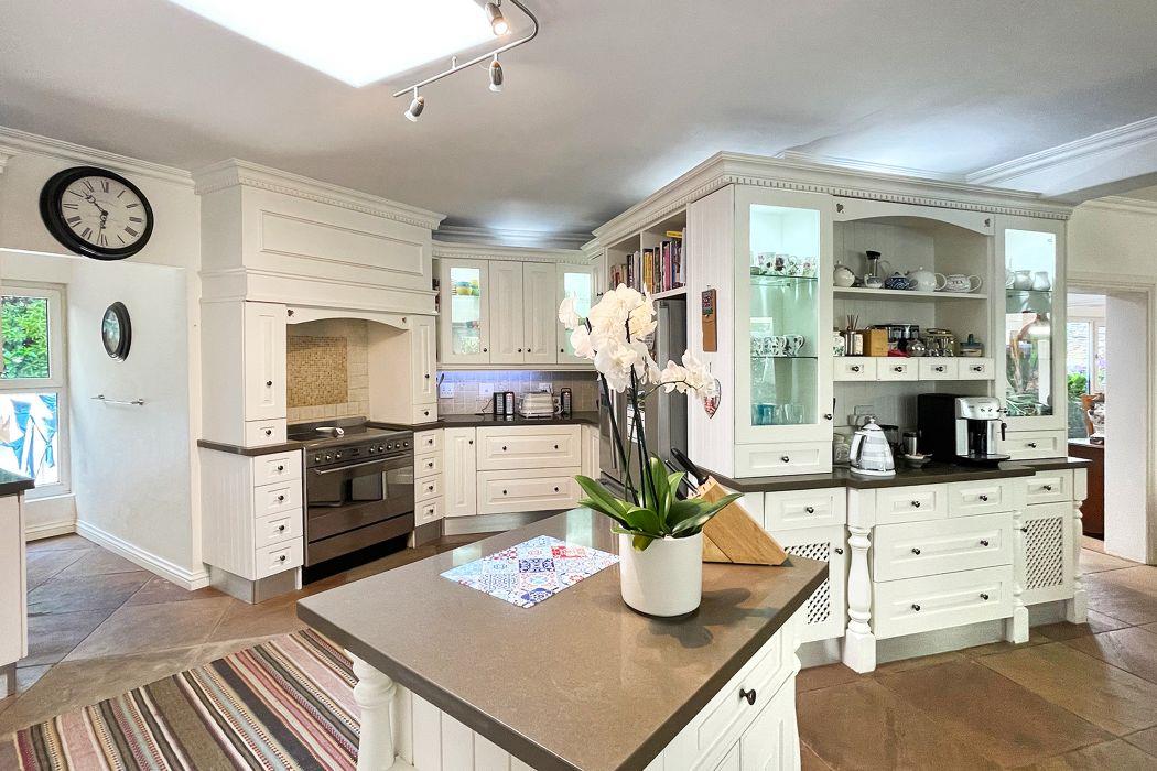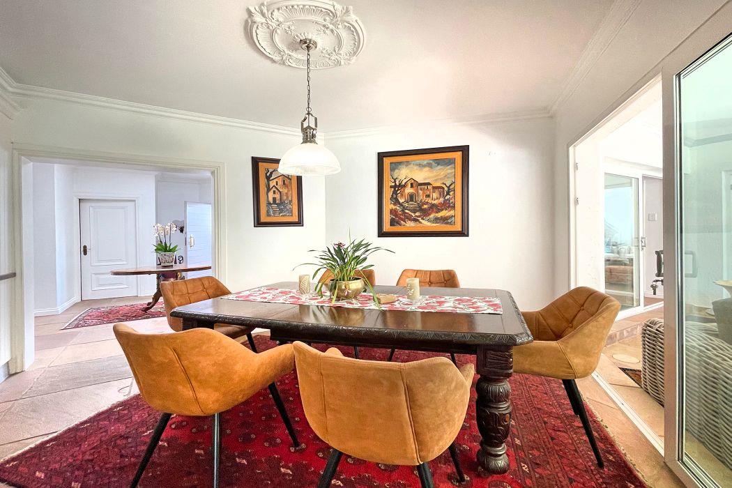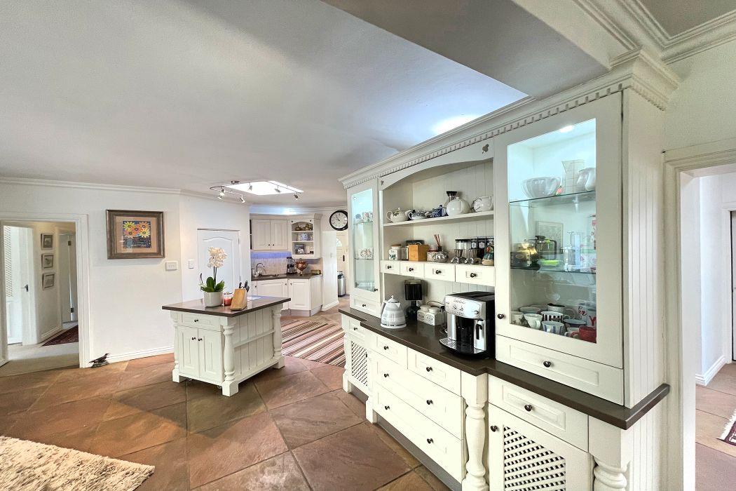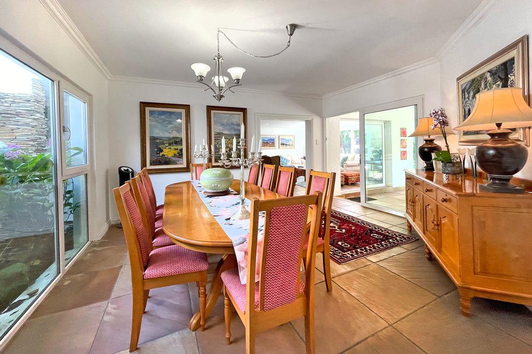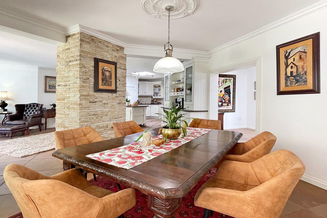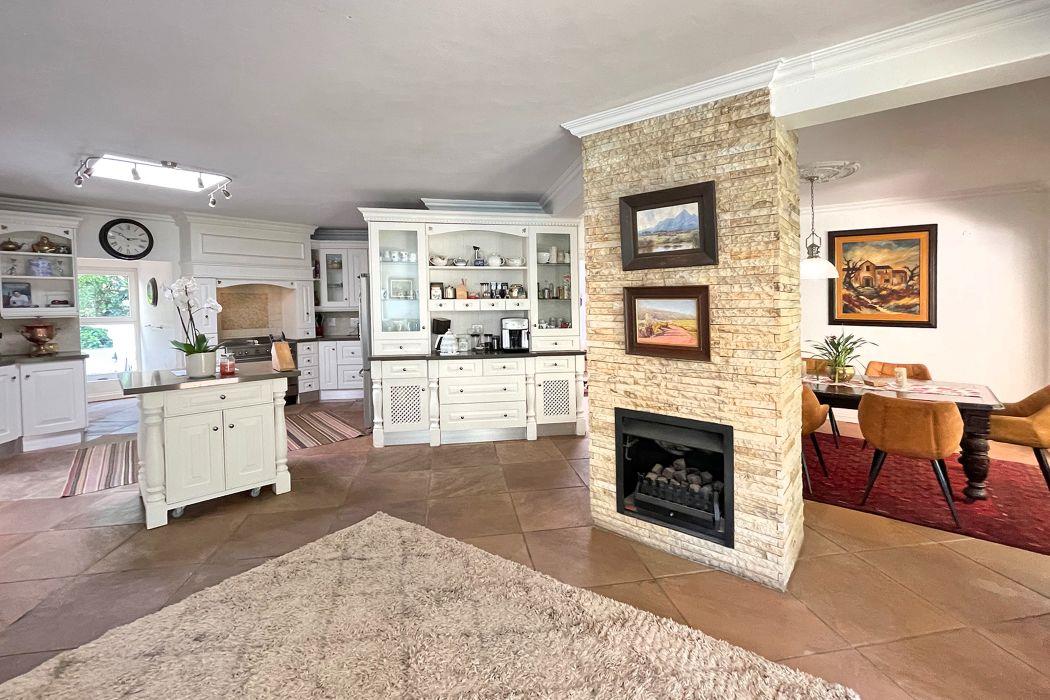 From the moment you enter, you're greeted by a grand entrance hall that leads to an open-plan breakfast lounge, seamlessly flowing into a solid wood, country-style kitchen. The kitchen boasts granite countertops, a central island, a separate pantry, and a scullery for added convenience. The adjoining TV lounge features a cozy gas fireplace and a stunning cladded wall, while the spacious dining area is bathed in natural light from large windows, offering a perfect space for family gatherings.