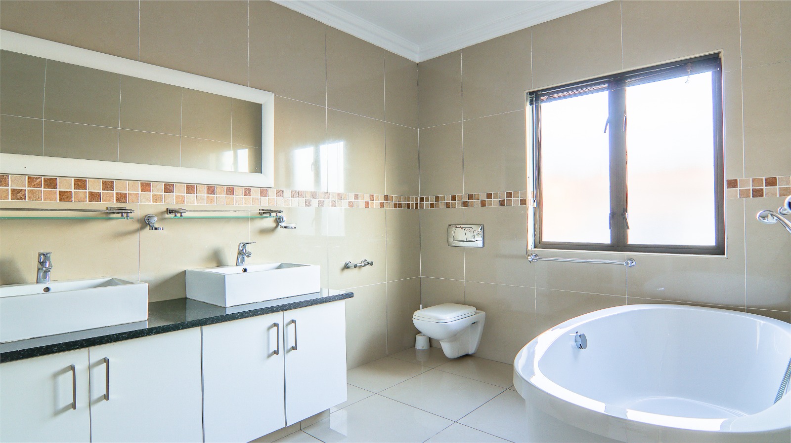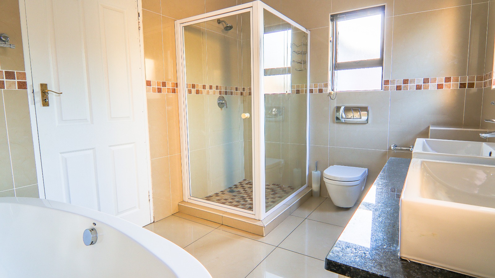 The main bedroom is a private sanctuary boasting a luxurious en-suite with his & hers showers, twin vanities, a large bathtub, and loo.