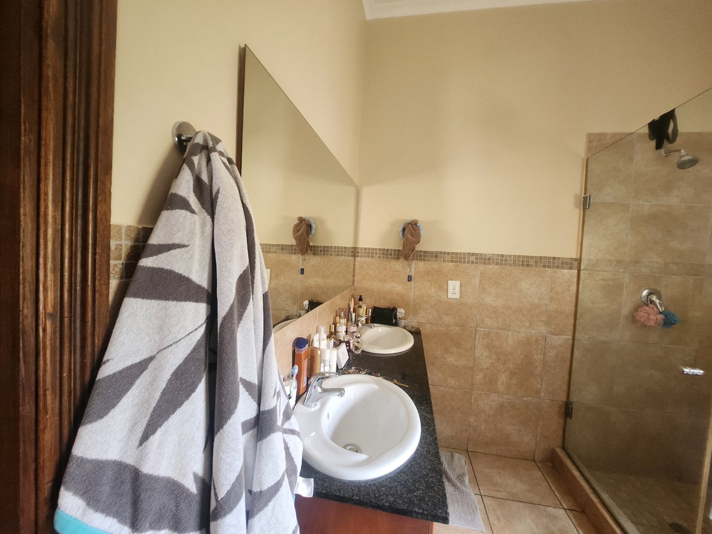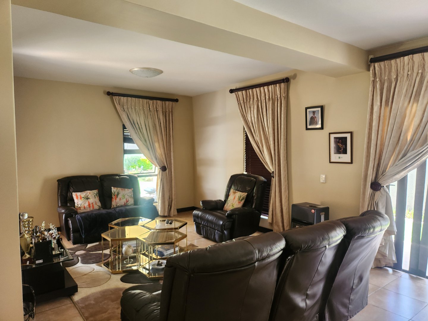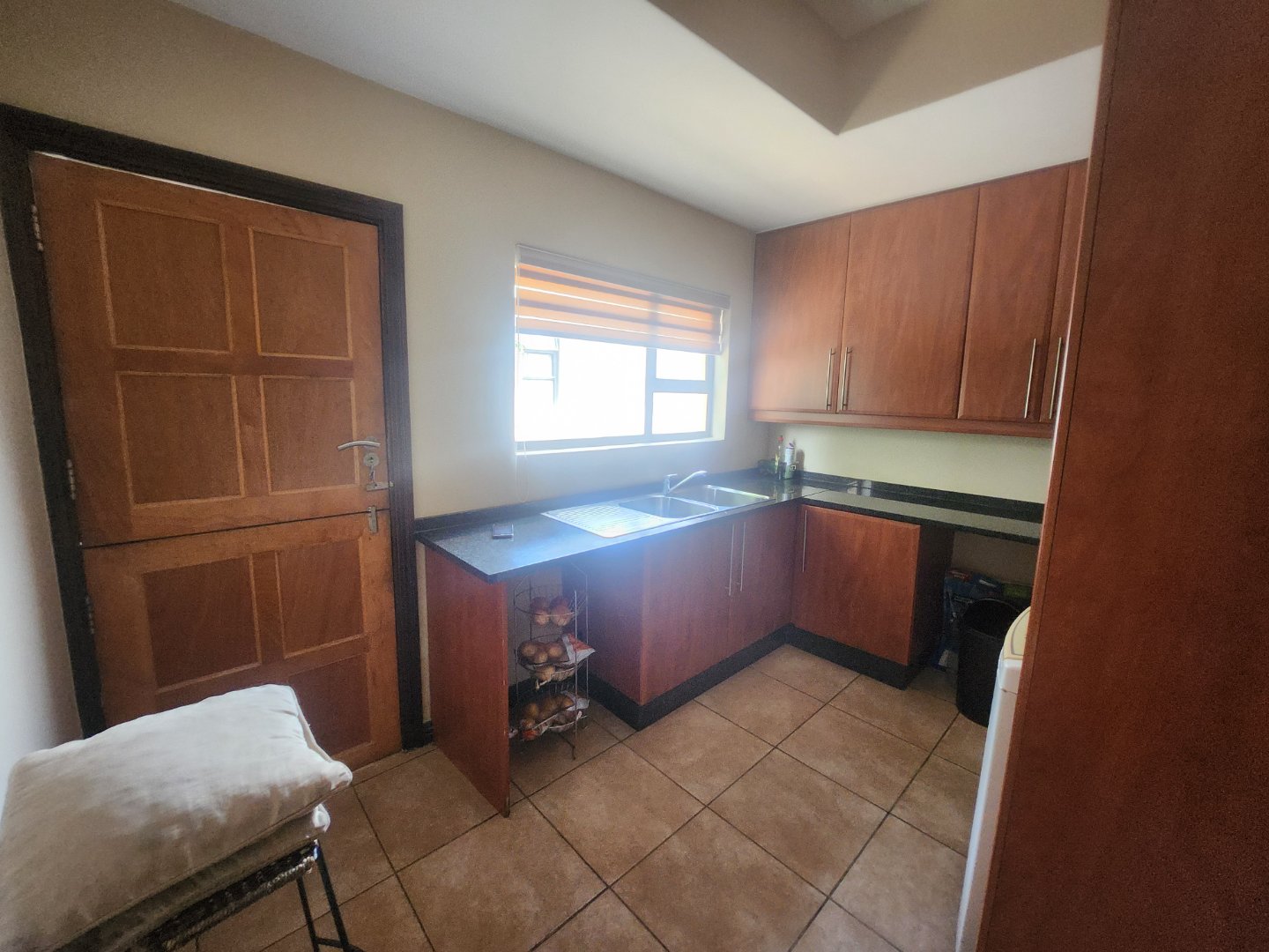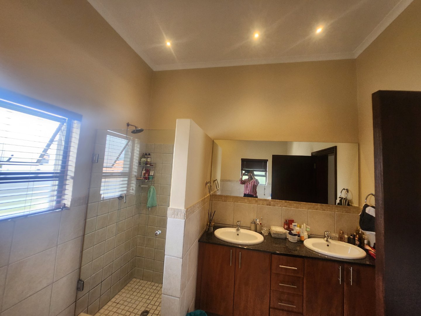 A spacious L-shaped kitchen with ample cupboard space seamlessly connects to two open-plan lounges and a dining area, creating a warm and inviting environment for relaxation and entertainment. Sliding doors from both lounges open onto the veranda, under cover braai area and well maintained garden. A conveniently located guest toilet is positioned near the main entrance. The property includes a secure double lock-up garage and features an inviting swimming pool set within a meticulously maintained garden. Additionally, a gardener’s shower is situated near the pool area for added convenience. The home has power back up!