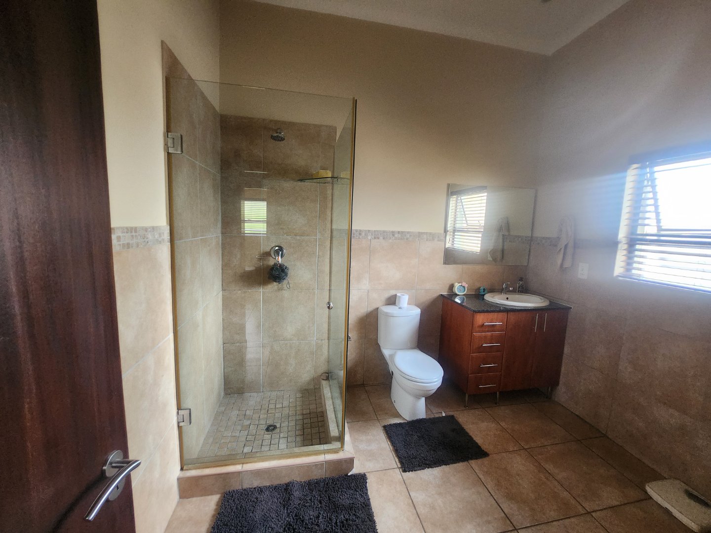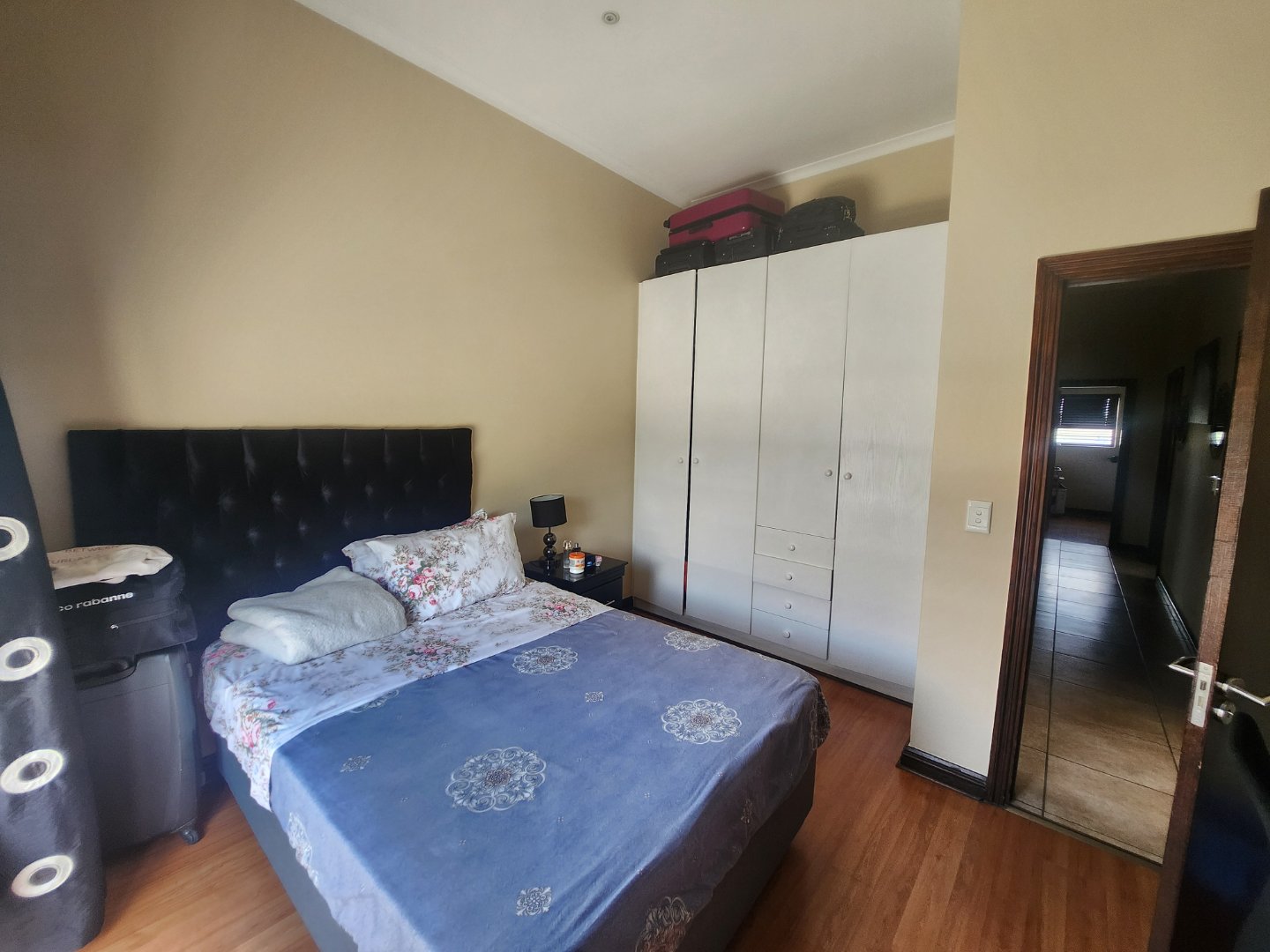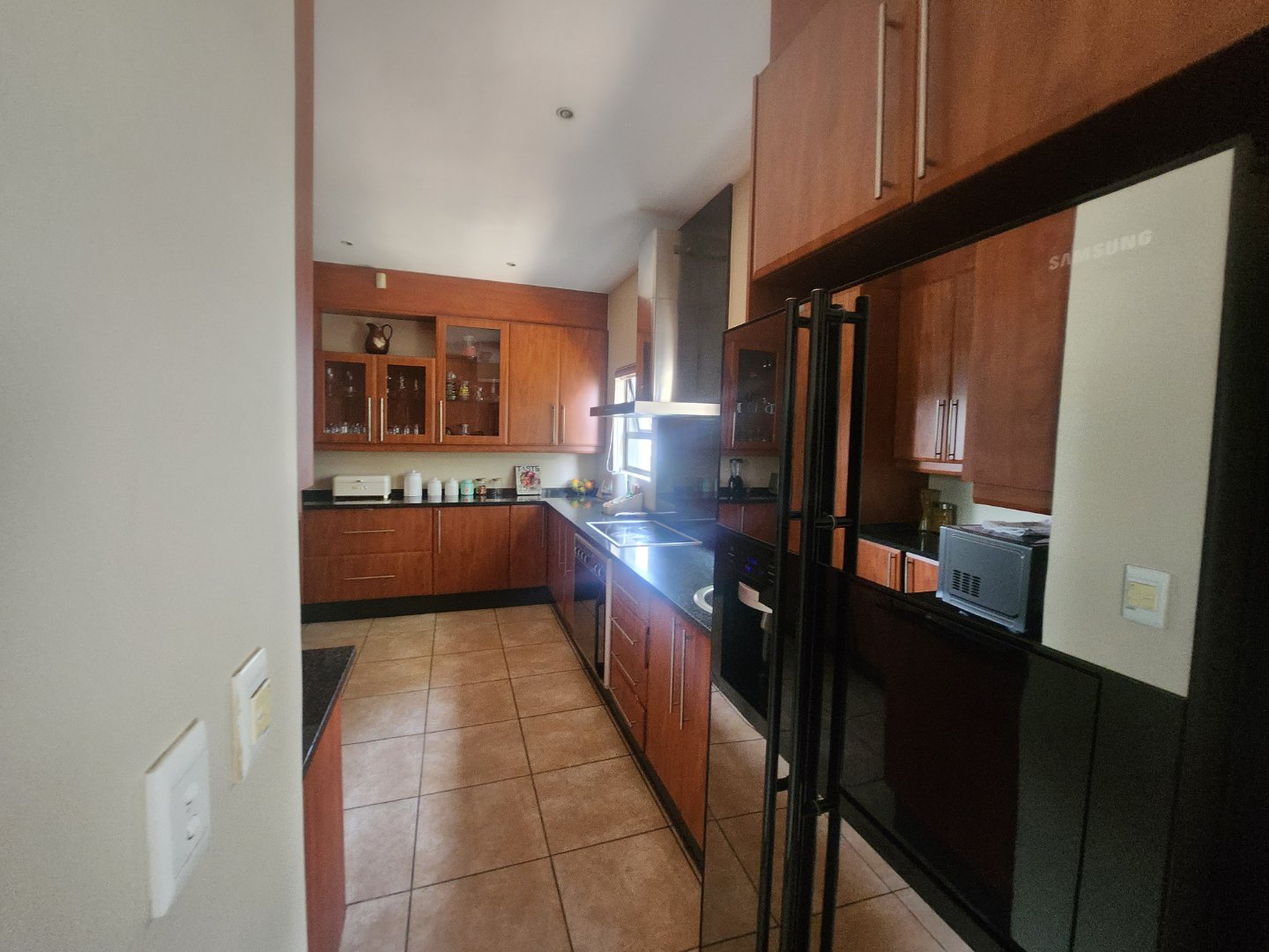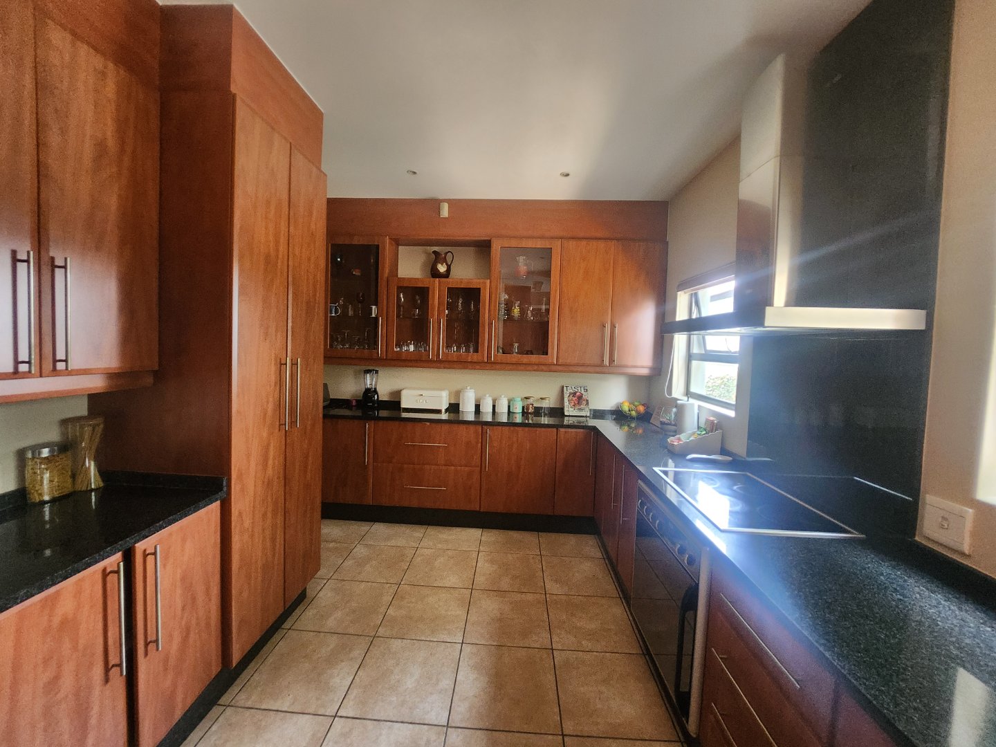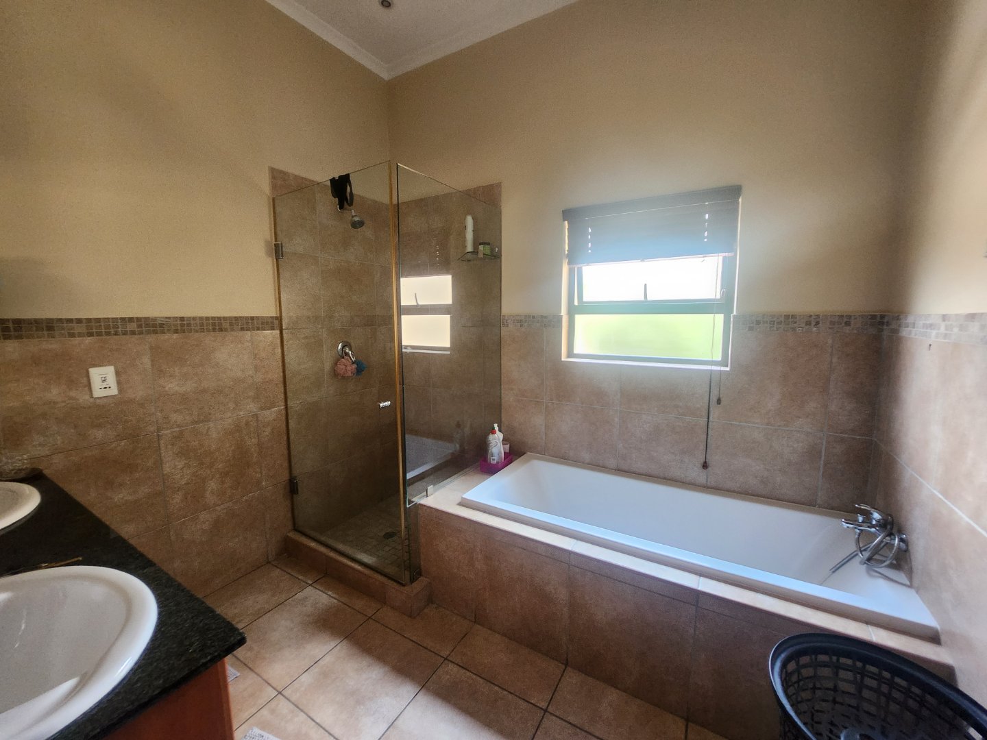 A spacious L-shaped kitchen with ample cupboard space seamlessly connects to two open-plan lounges and a dining area, creating a warm and inviting environment for relaxation and entertainment. Sliding doors from both lounges open onto the veranda, under cover braai area and well maintained garden. A conveniently located guest toilet is positioned near the main entrance. The property includes a secure double lock-up garage and features an inviting swimming pool set within a meticulously maintained garden. Additionally, a gardener’s shower is situated near the pool area for added convenience. The home has power back up!