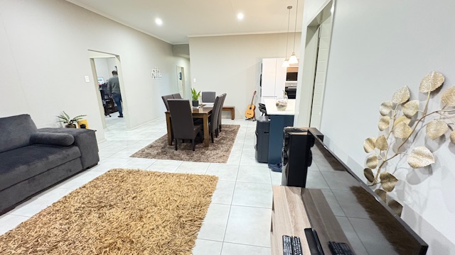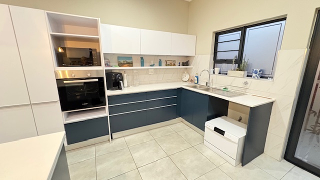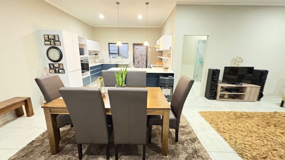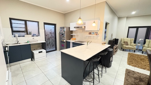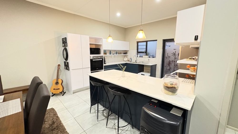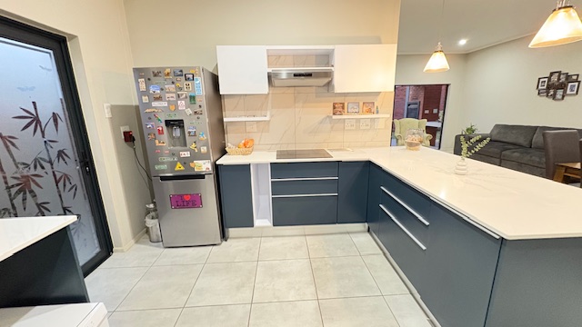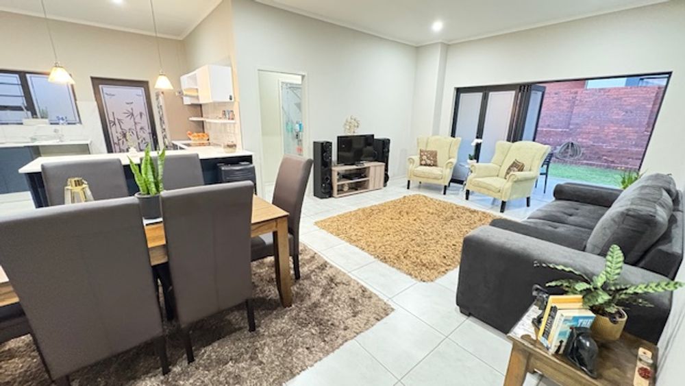 The heart of the home is a sleek, fully equipped modern kitchen with ample cupboard space, flowing effortlessly into the open-plan dining and lounge area.