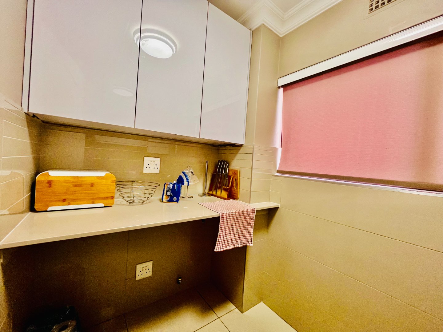 The open-plan living and dining areas flow effortlessly into a fully equipped modern kitchen and scullery. Each living area boasts its own balcony, bringing in plenty of natural light. The main lounge opens onto a spacious balcony overlooking the garden, perfect for morning coffees or sunset relaxation.