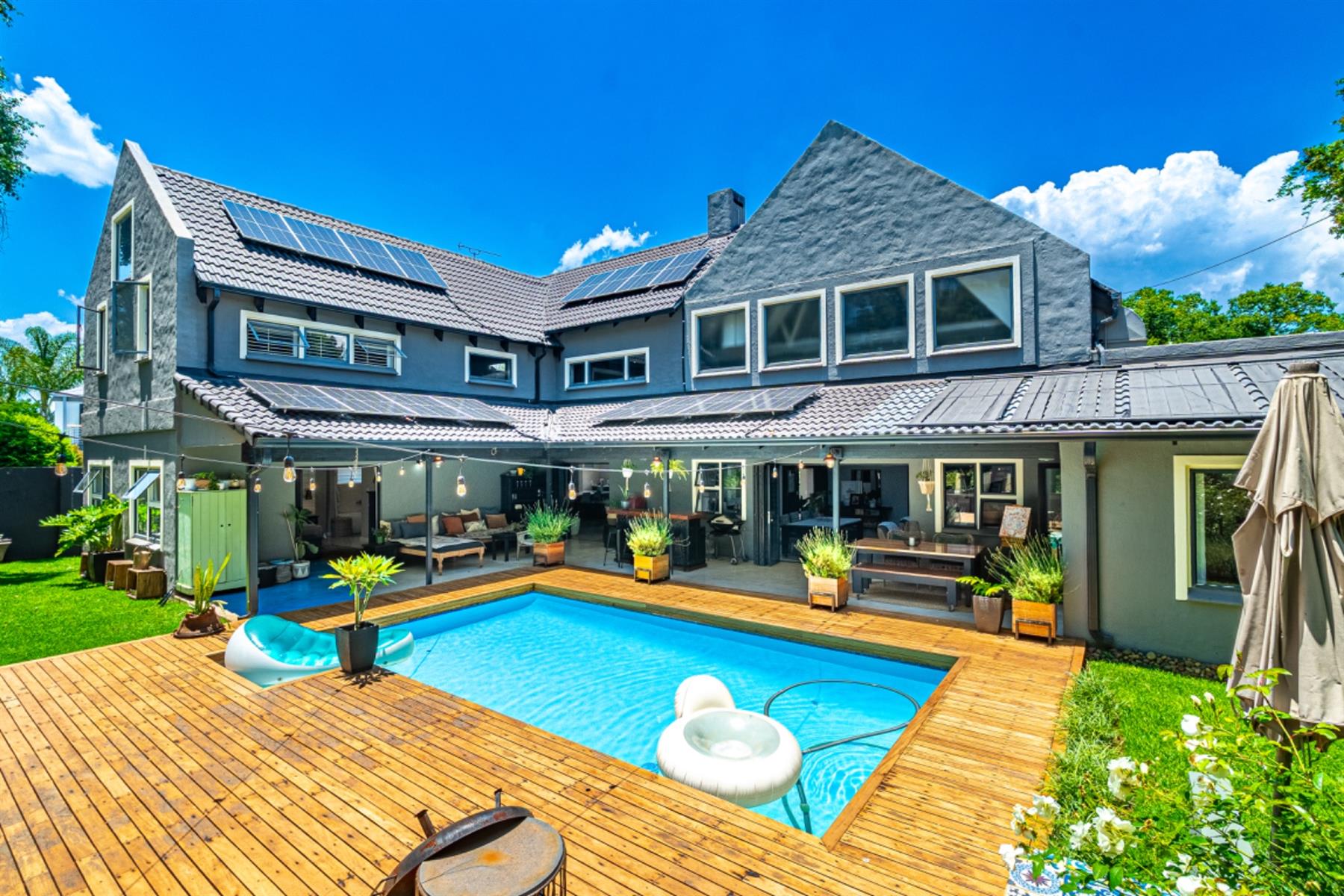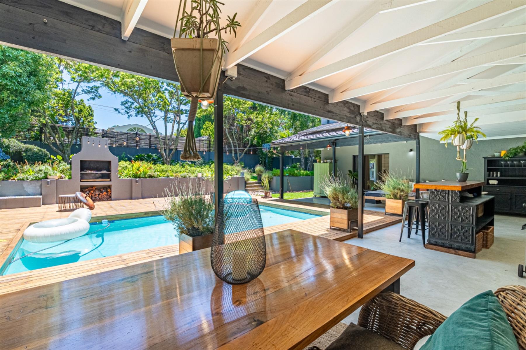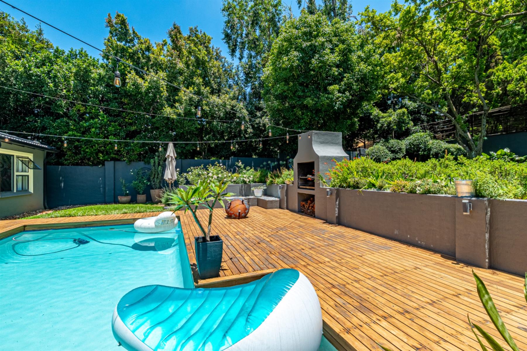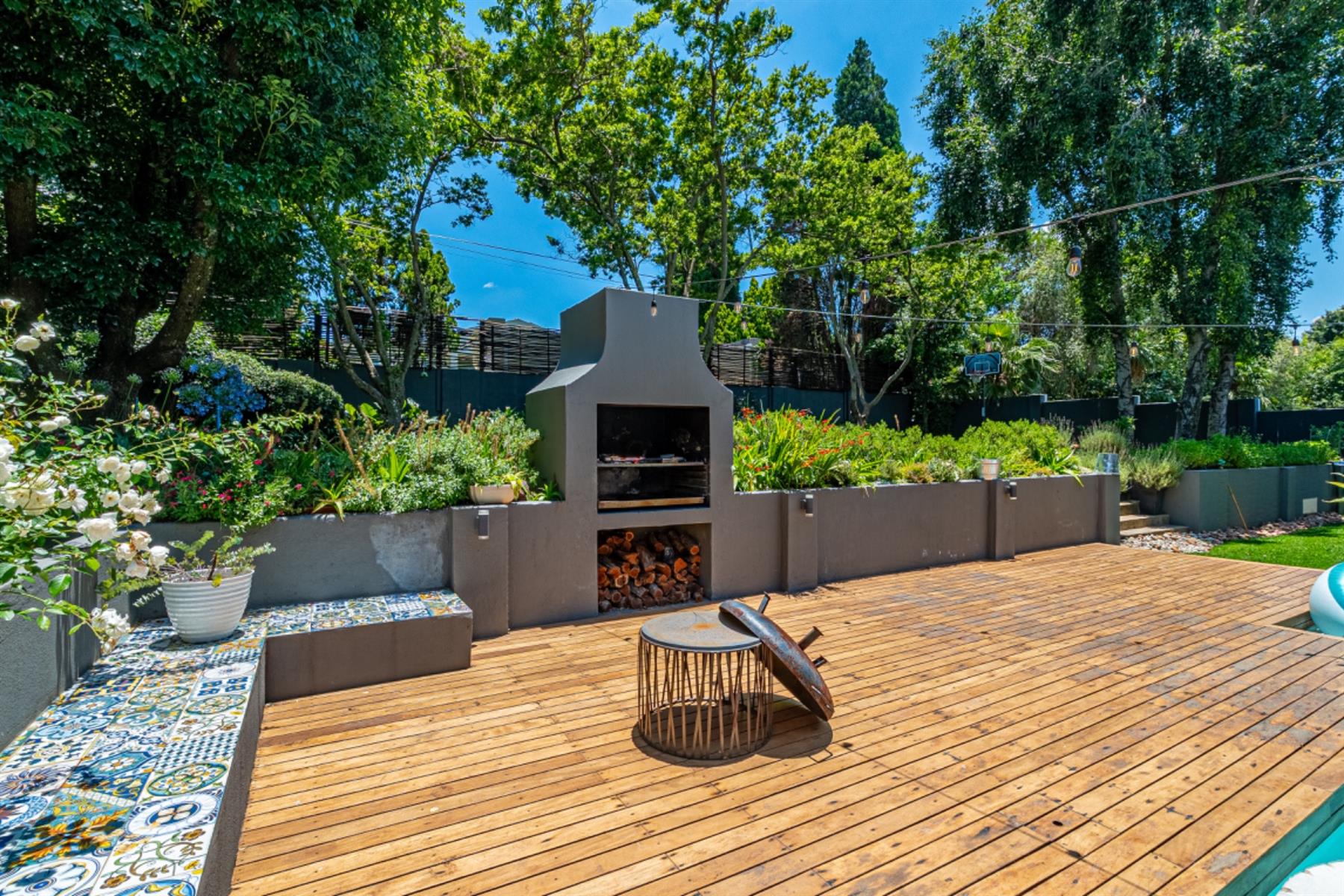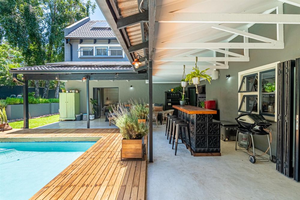The expansive covered patio is designed for year-round enjoyment, complete with a fitted bar and seamless flow onto a wooden deck, boma, and braai area. The heated swimming pool anchors the landscaped garden with elegance, creating a luxurious outdoor oasis ideal for gatherings or quiet relaxation.