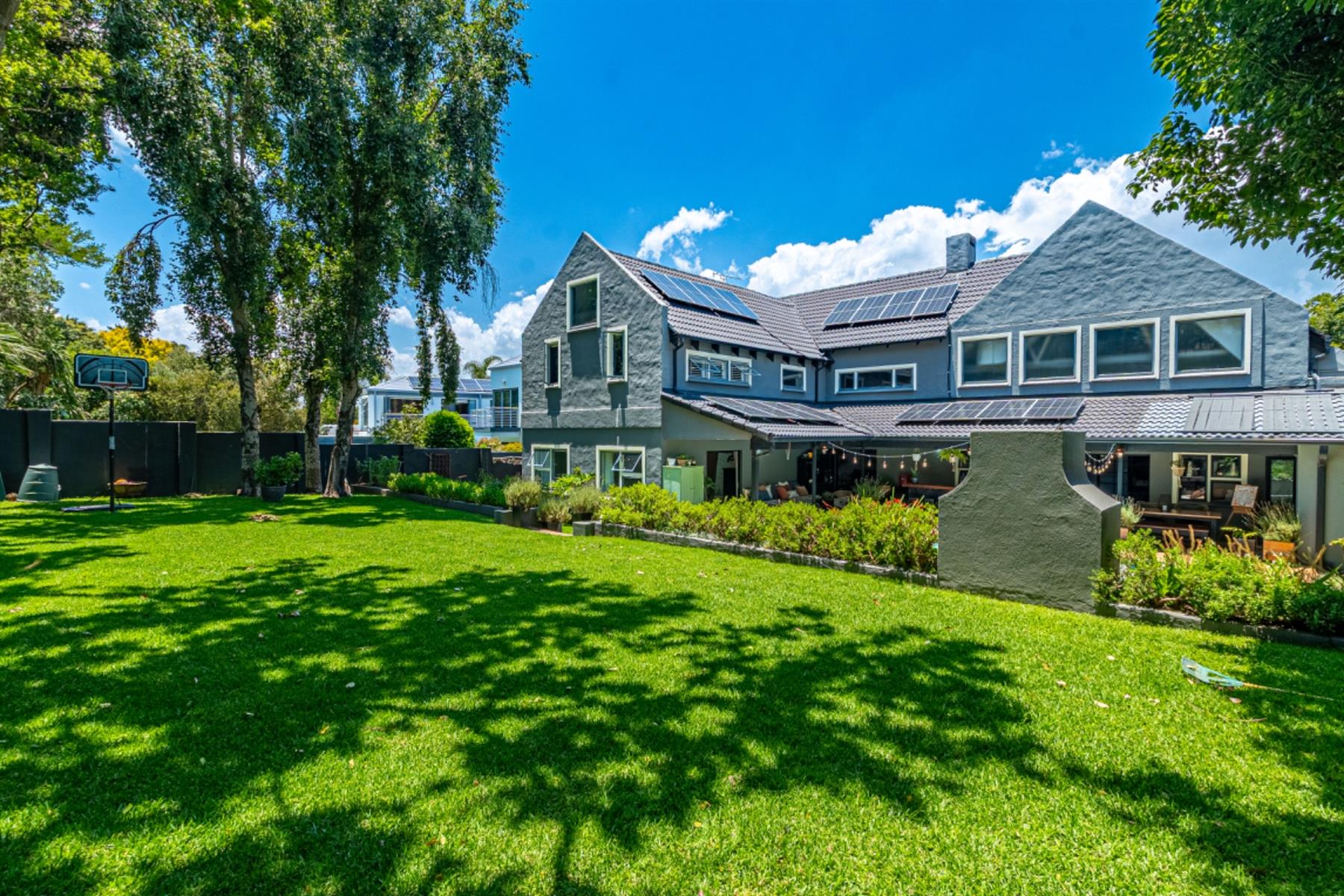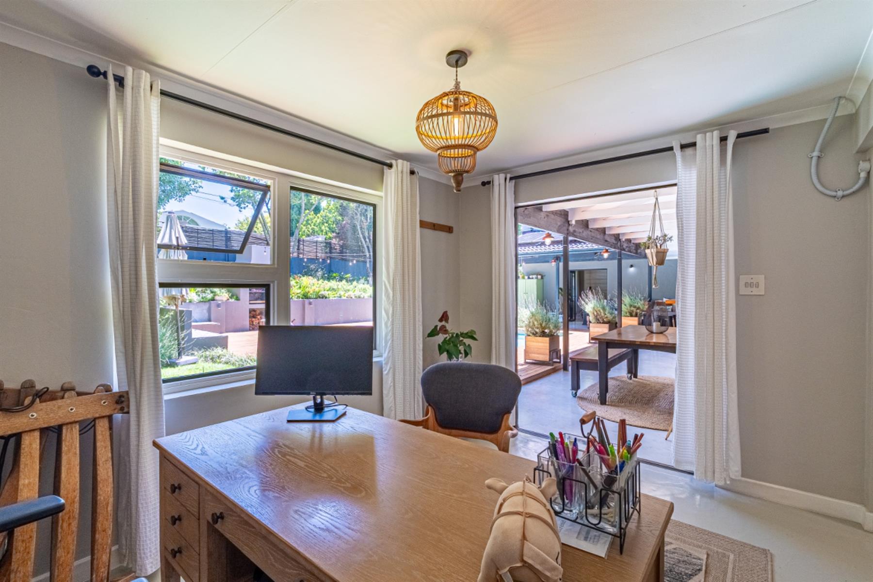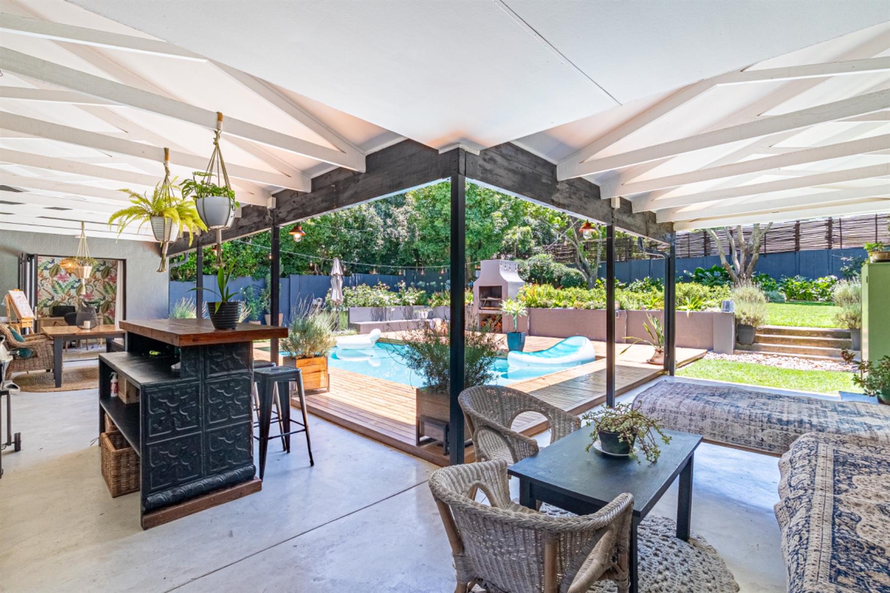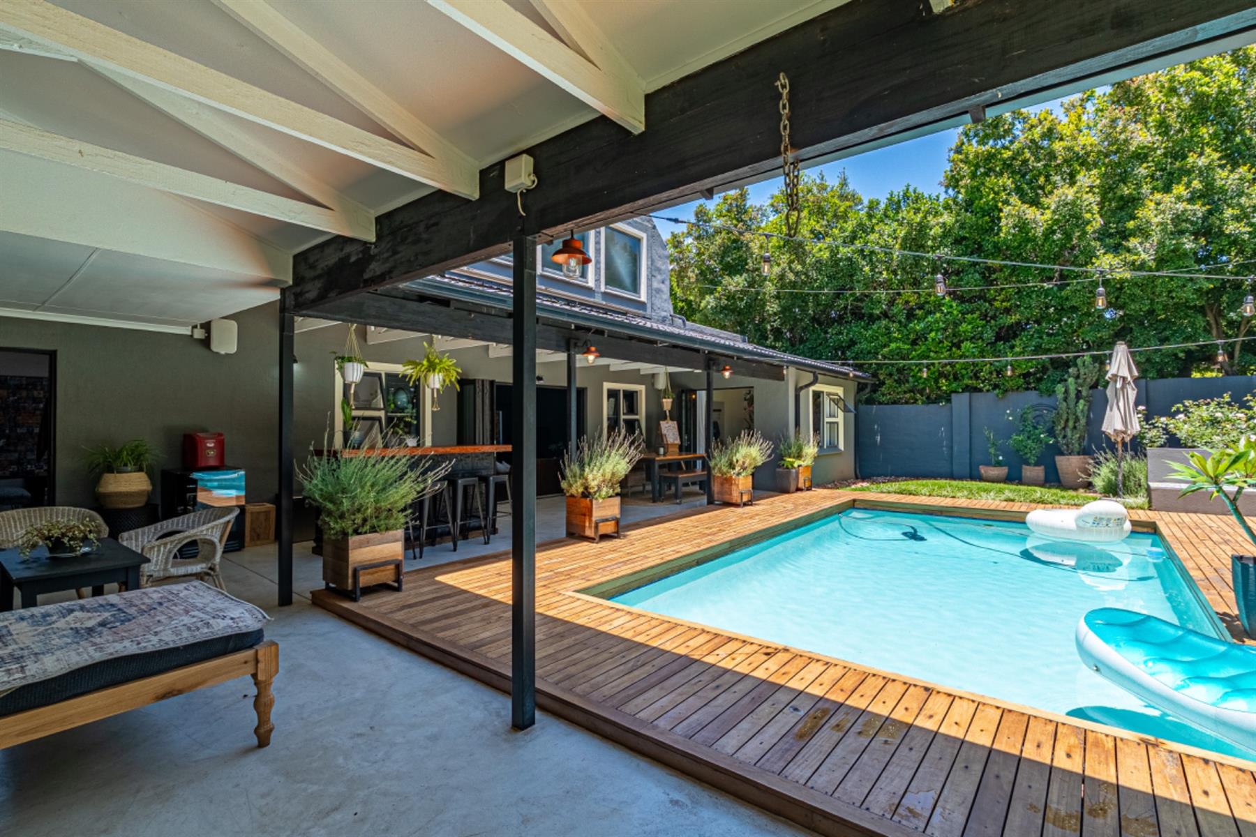 The expansive covered patio is designed for year-round enjoyment, complete with a fitted bar and seamless flow onto a wooden deck, boma, and braai area. The heated swimming pool anchors the landscaped garden with elegance, creating a luxurious outdoor oasis ideal for gatherings or quiet relaxation.
