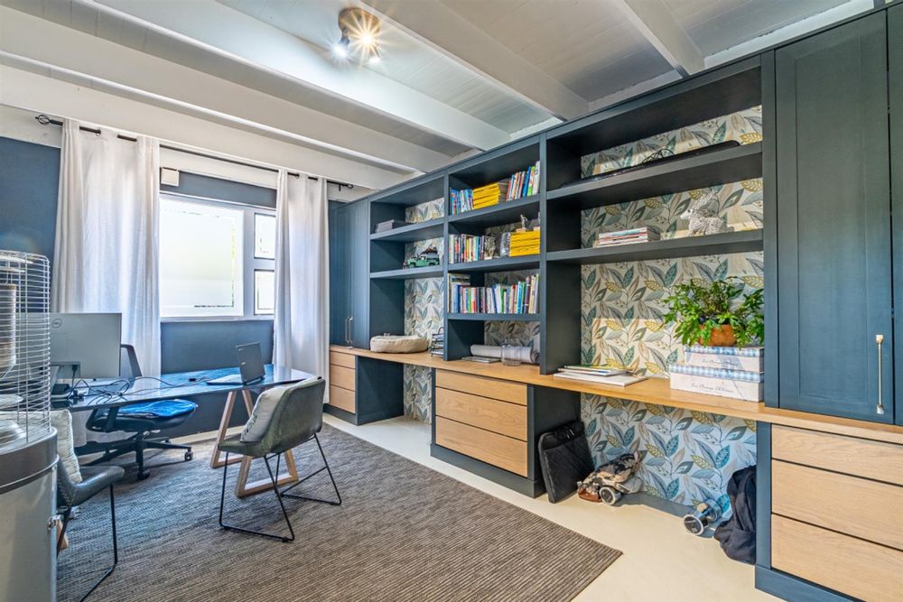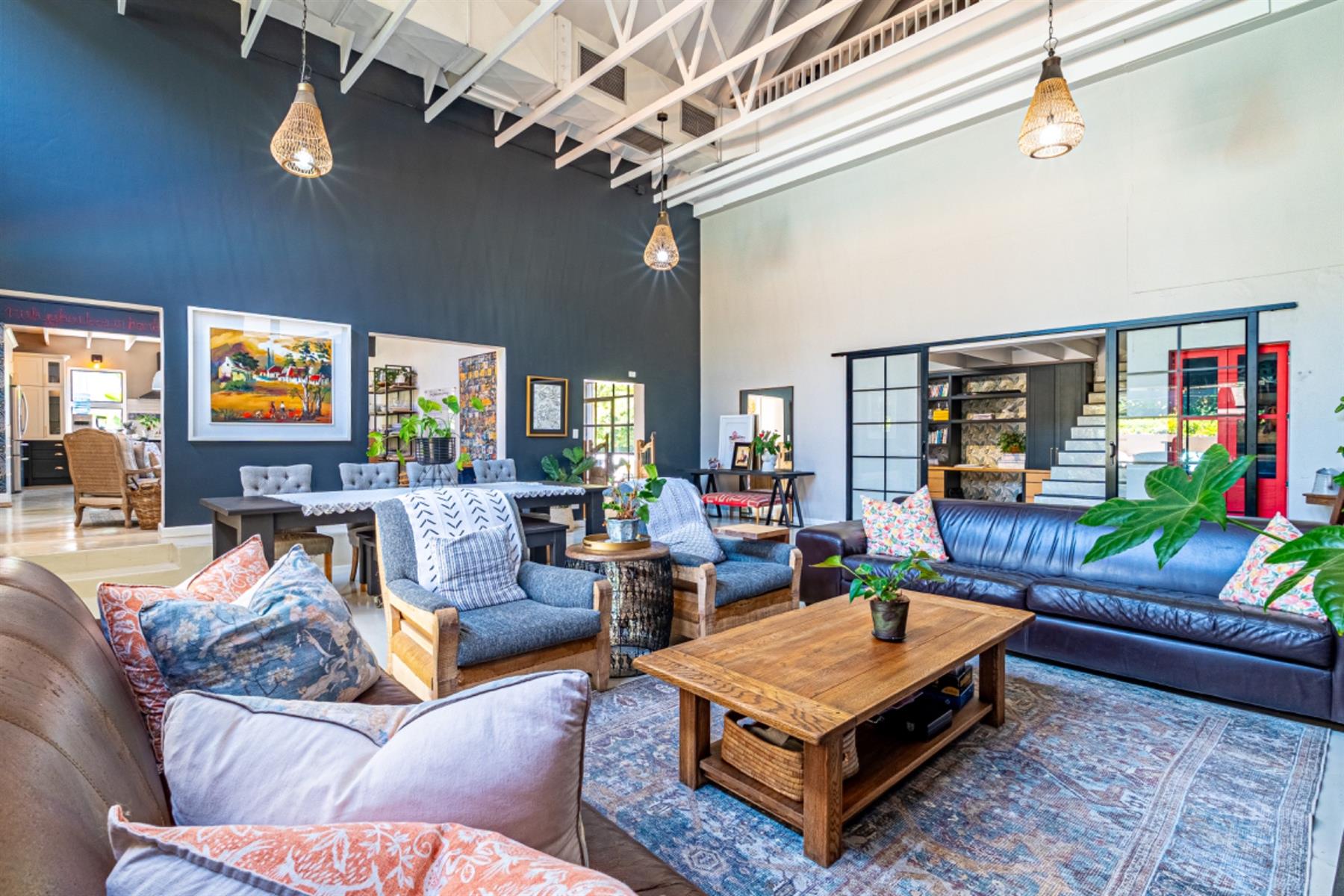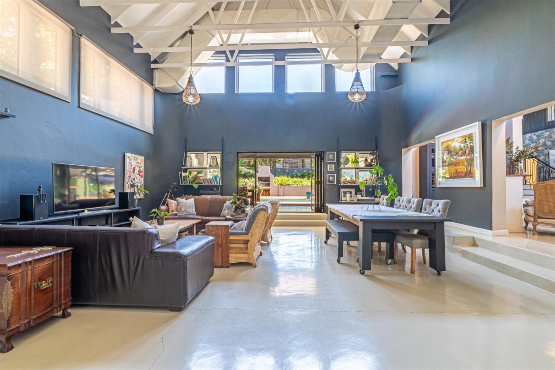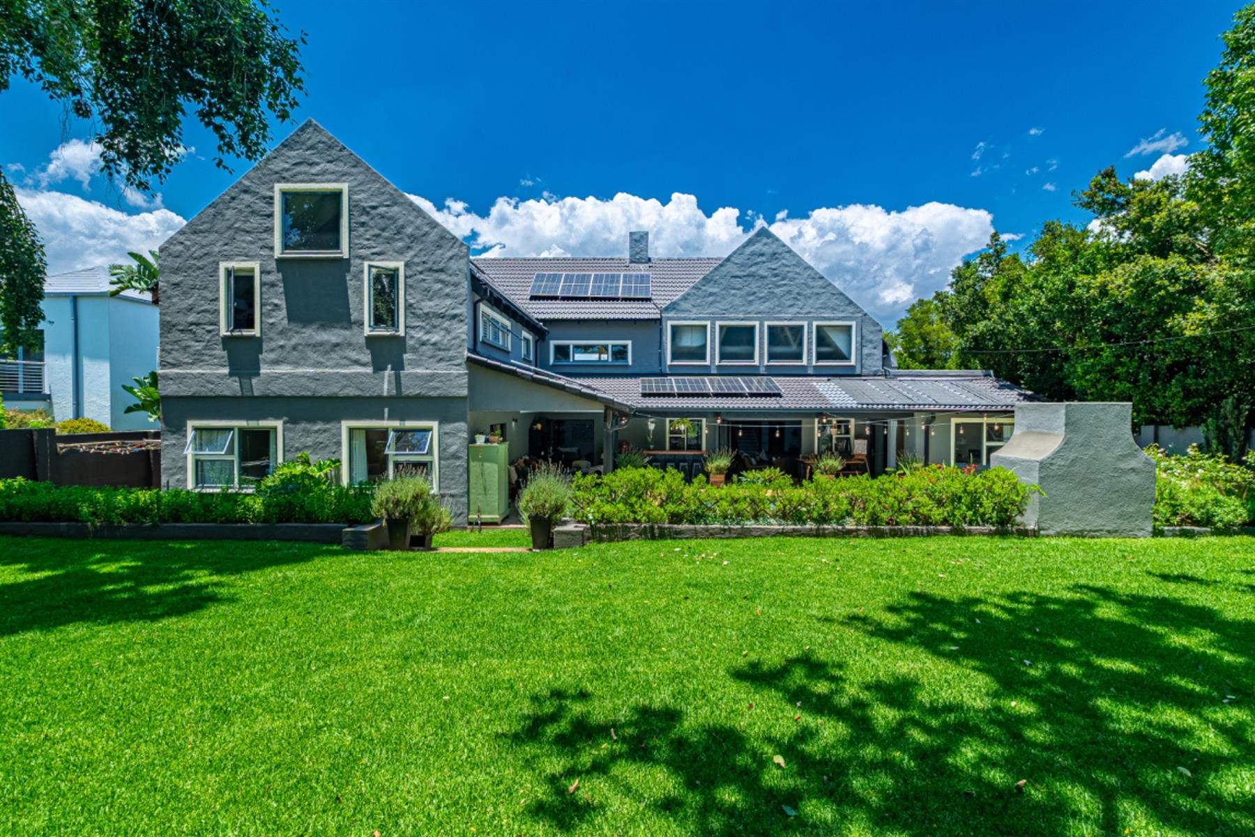 The expansive covered patio is designed for year-round enjoyment, complete with a fitted bar and seamless flow onto a wooden deck, boma, and braai area. The heated swimming pool anchors the landscaped garden with elegance, creating a luxurious outdoor oasis ideal for gatherings or quiet relaxation.