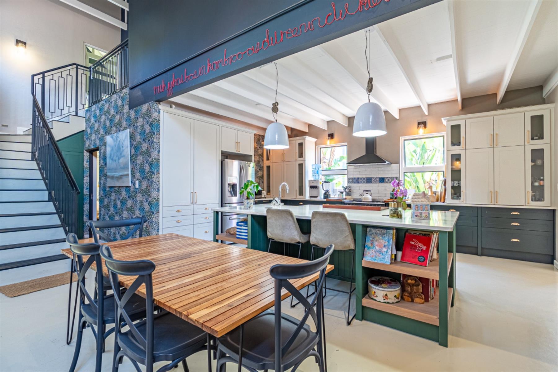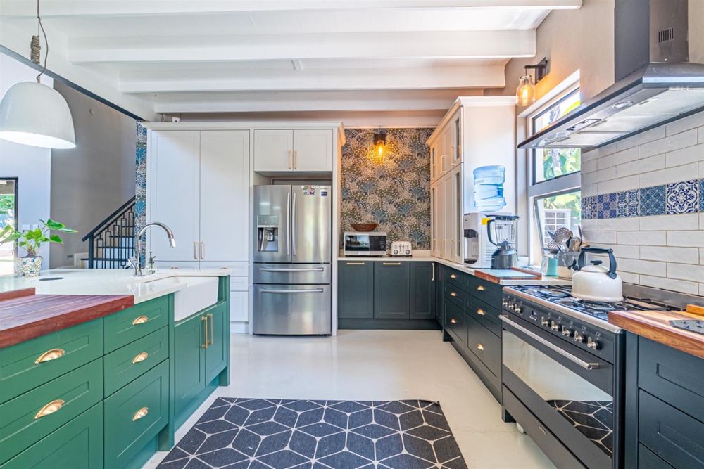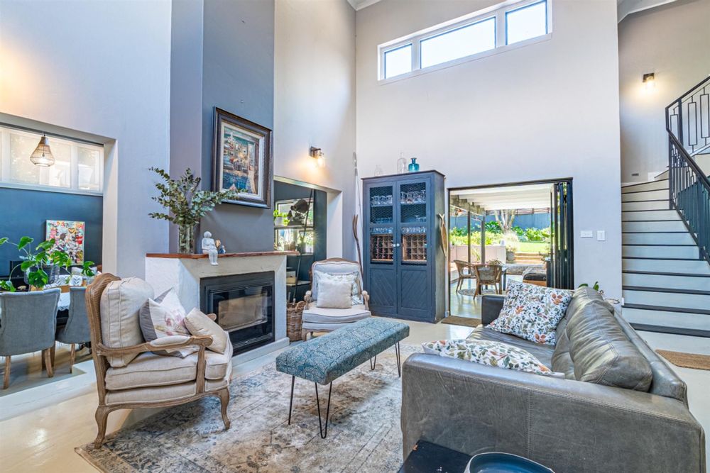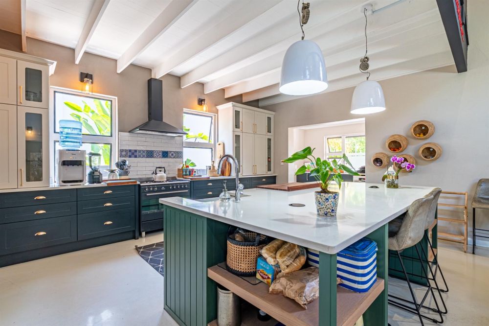 The kitchen is a centrepiece of style and function, featuring a central island, breakfast bar, Caesarstone countertops, gas hob, and a well-equipped scullery. This space has been thoughtfully designed to cater to busy family routines and effortless hosting.