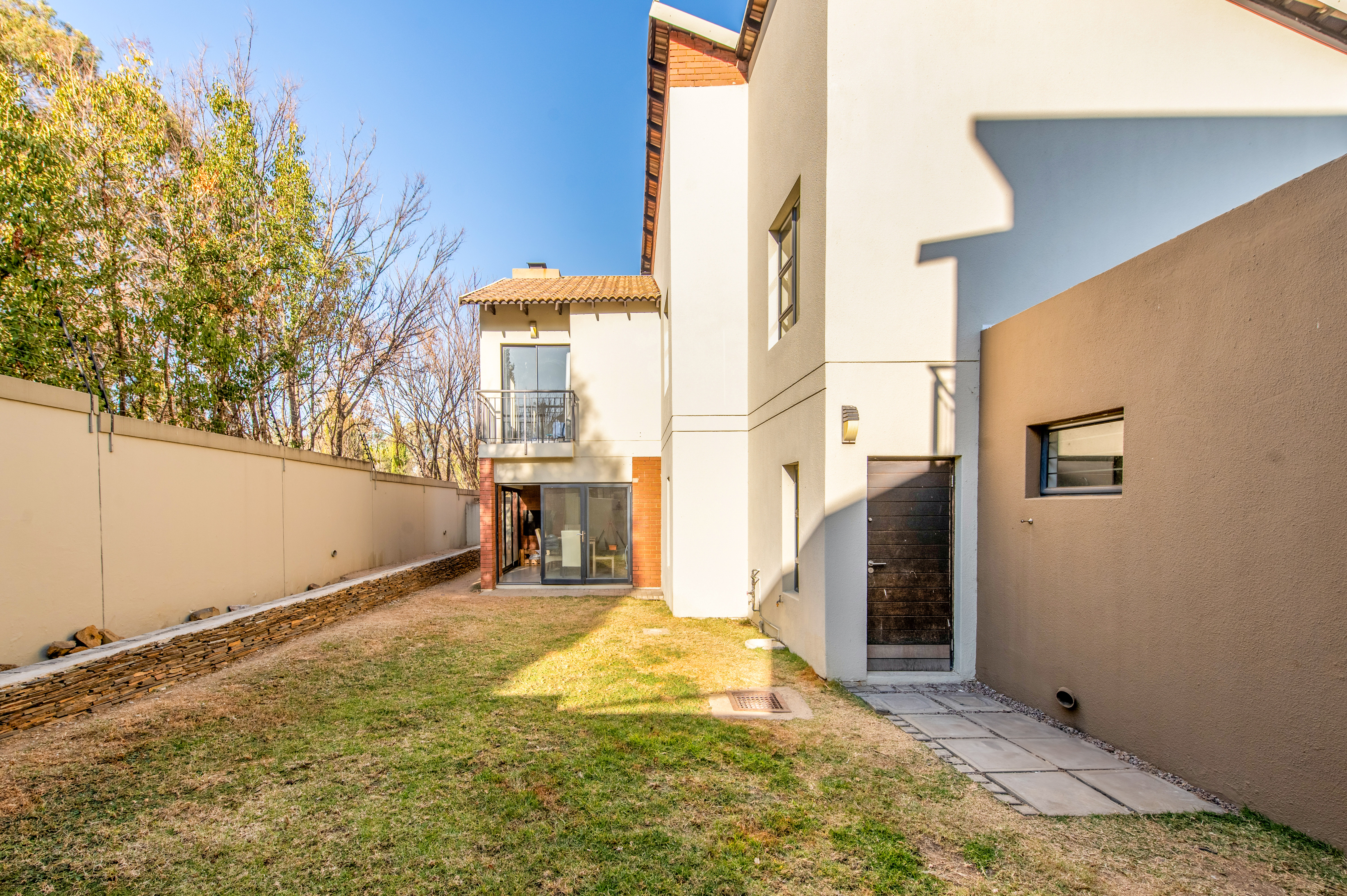 Upstairs: There are three carpeted bedrooms. The main bedroom includes an en-suite, a bathroom with a bathtub and shower flowing into a small balcony that overlooks the garden. The fairly sized second and third bedrooms share a bathroom. Additionally, there’s a space upstairs for a study or a mini lounge