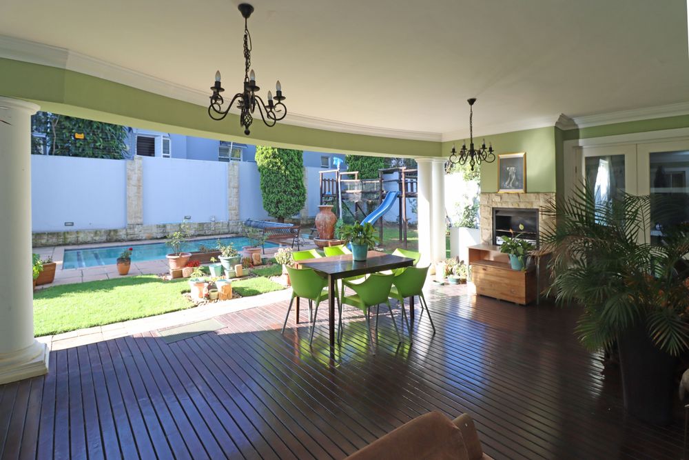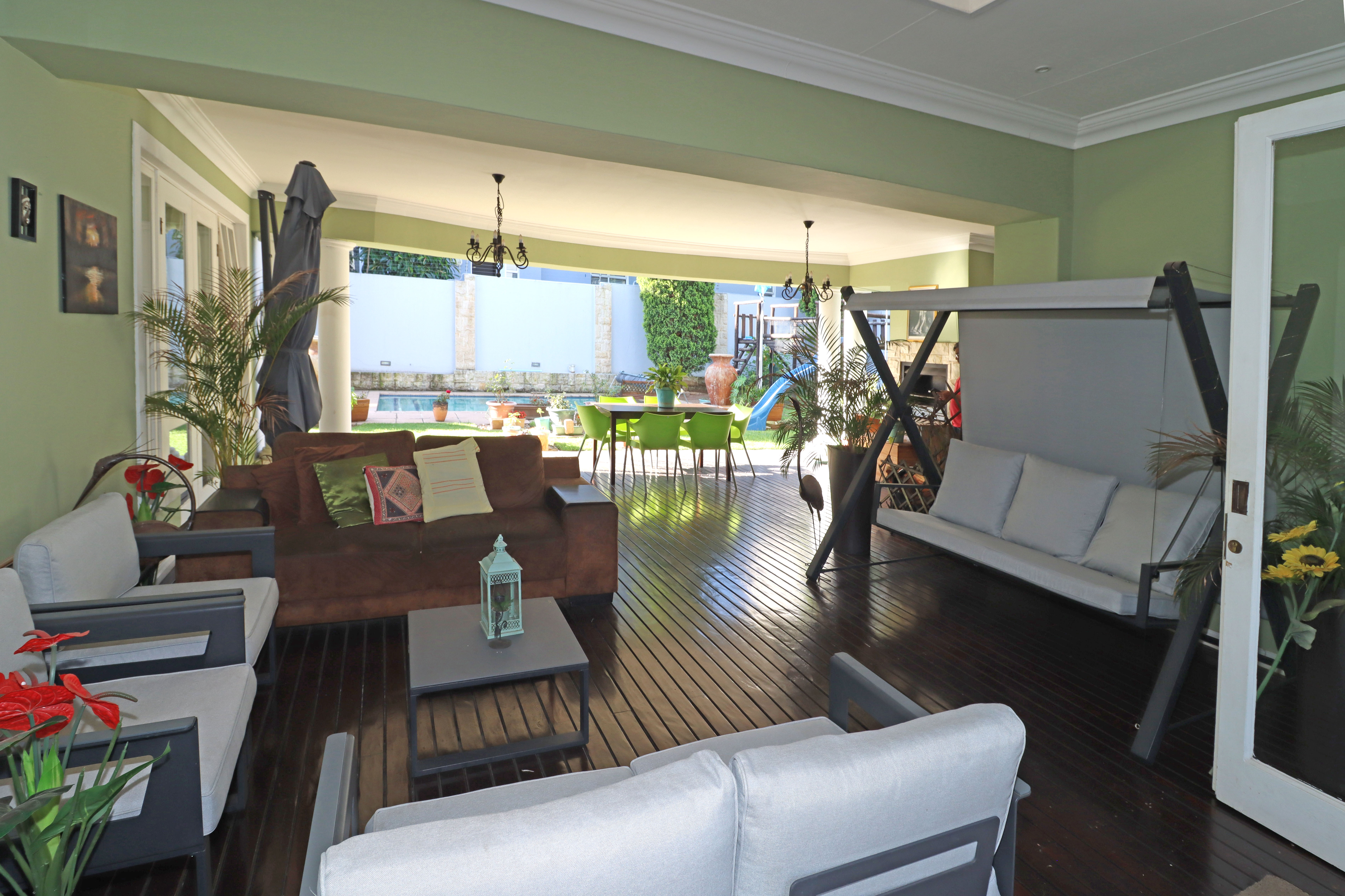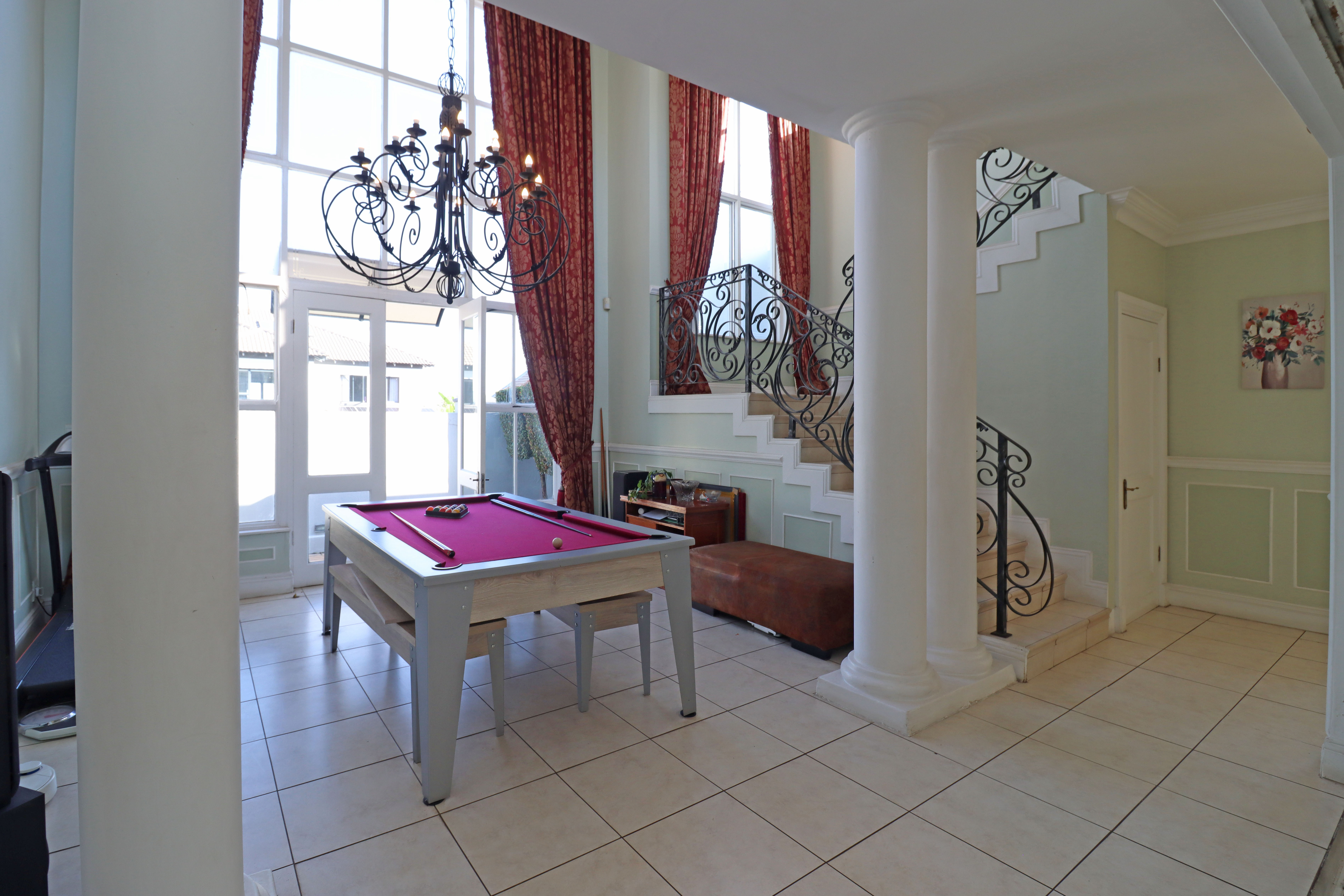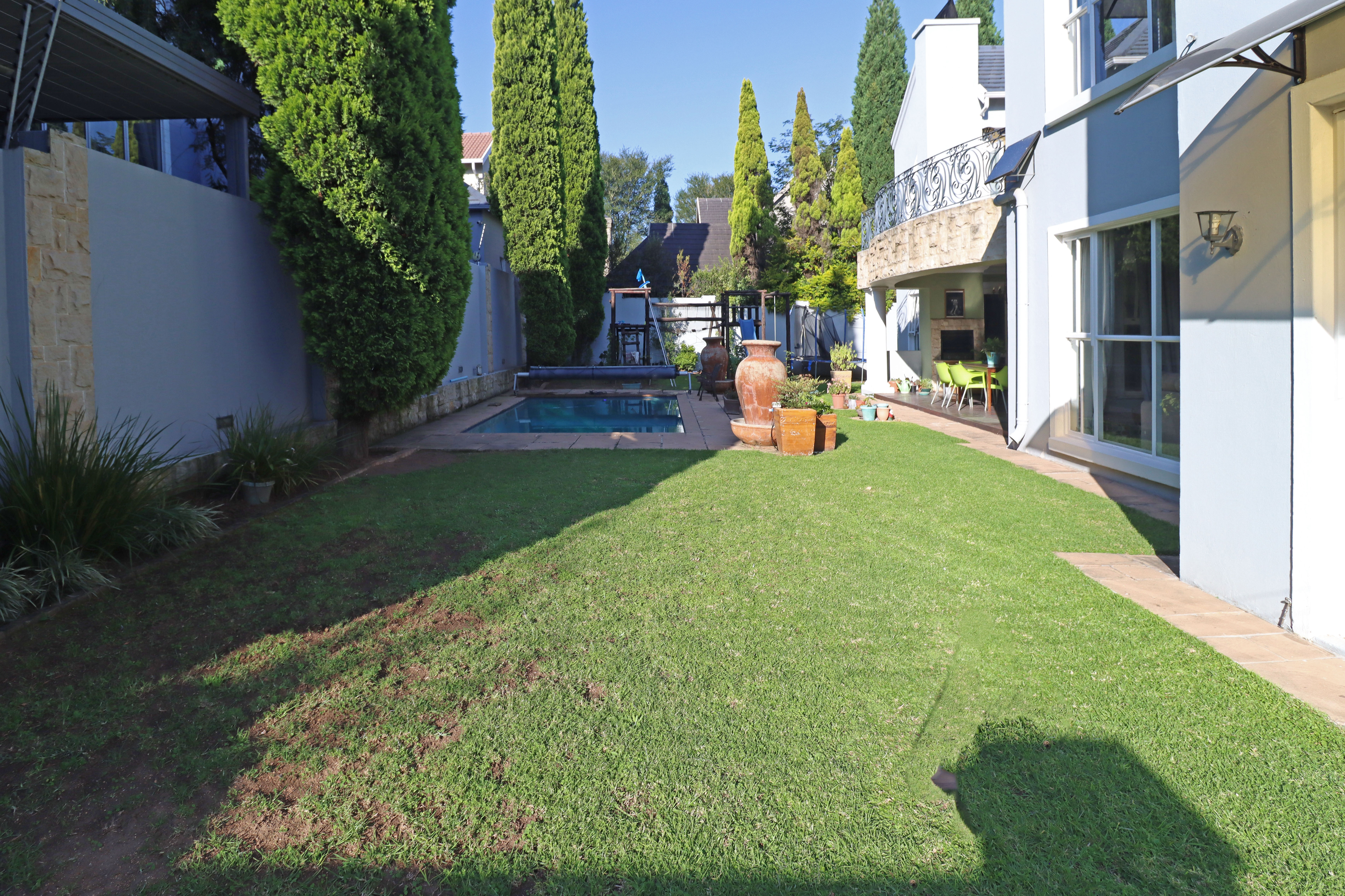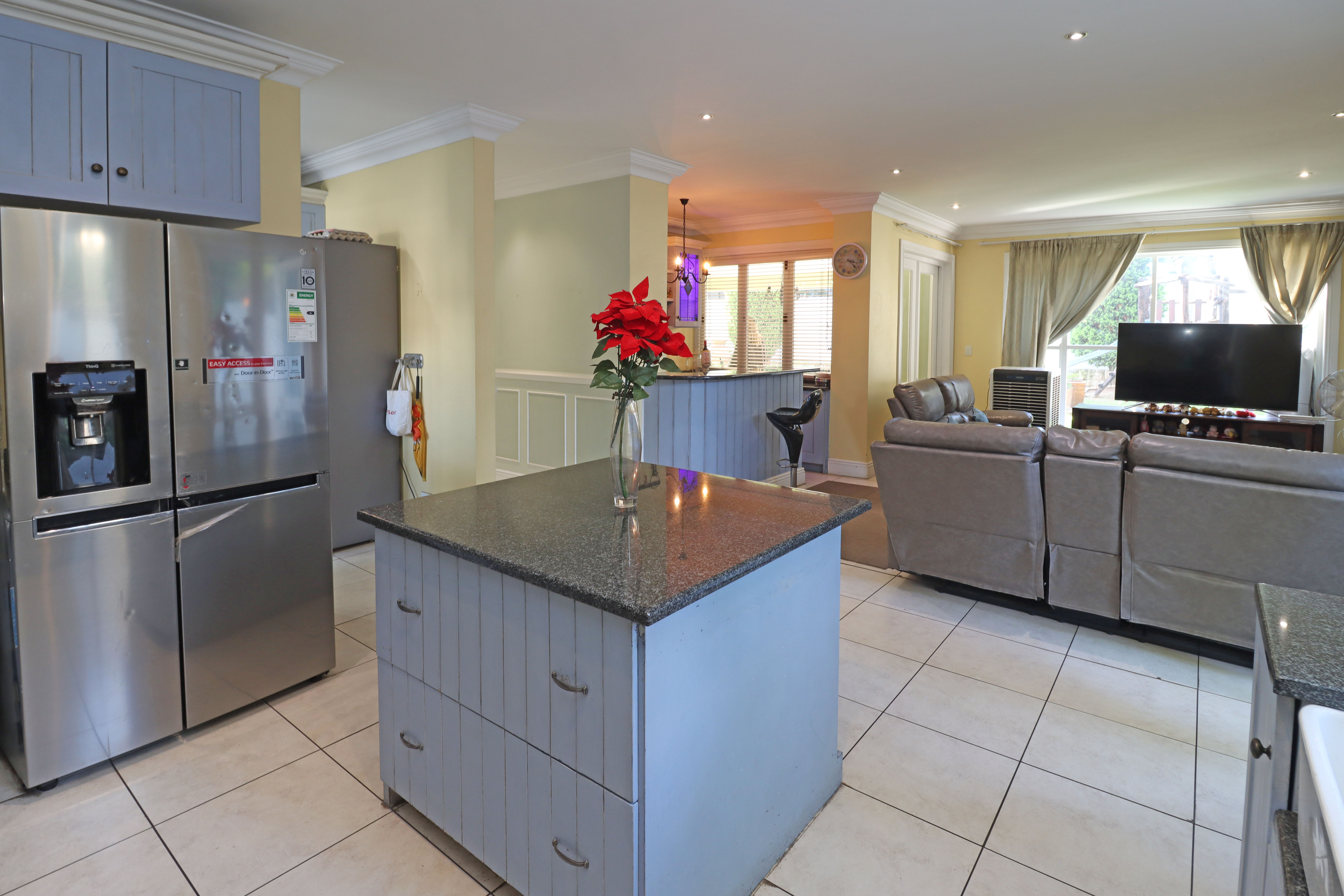 Big entertainers, this home is for you! Lounge with gas fireplace, built in bar and serving hatch to the patio as well as opening doors and open plan to the divine kitchen. The kitchen boasts a centre island, gas hob, space for a double door fridge, ample cupboard space and a separate scullery. Formal lounge and formal dining seamlessly flow through stack-away doors to the patio. Patio is to die for with a large decked area and fully covered with built-in gas braai and overlooking the sparkling heated pool and manicured garden.