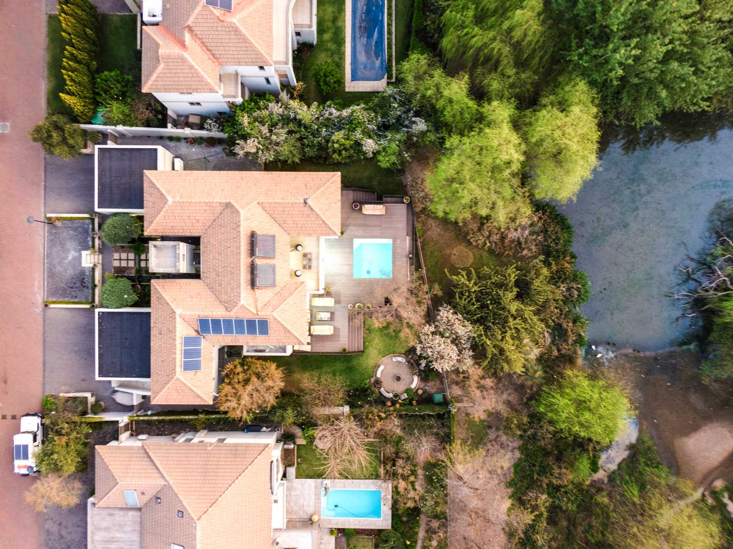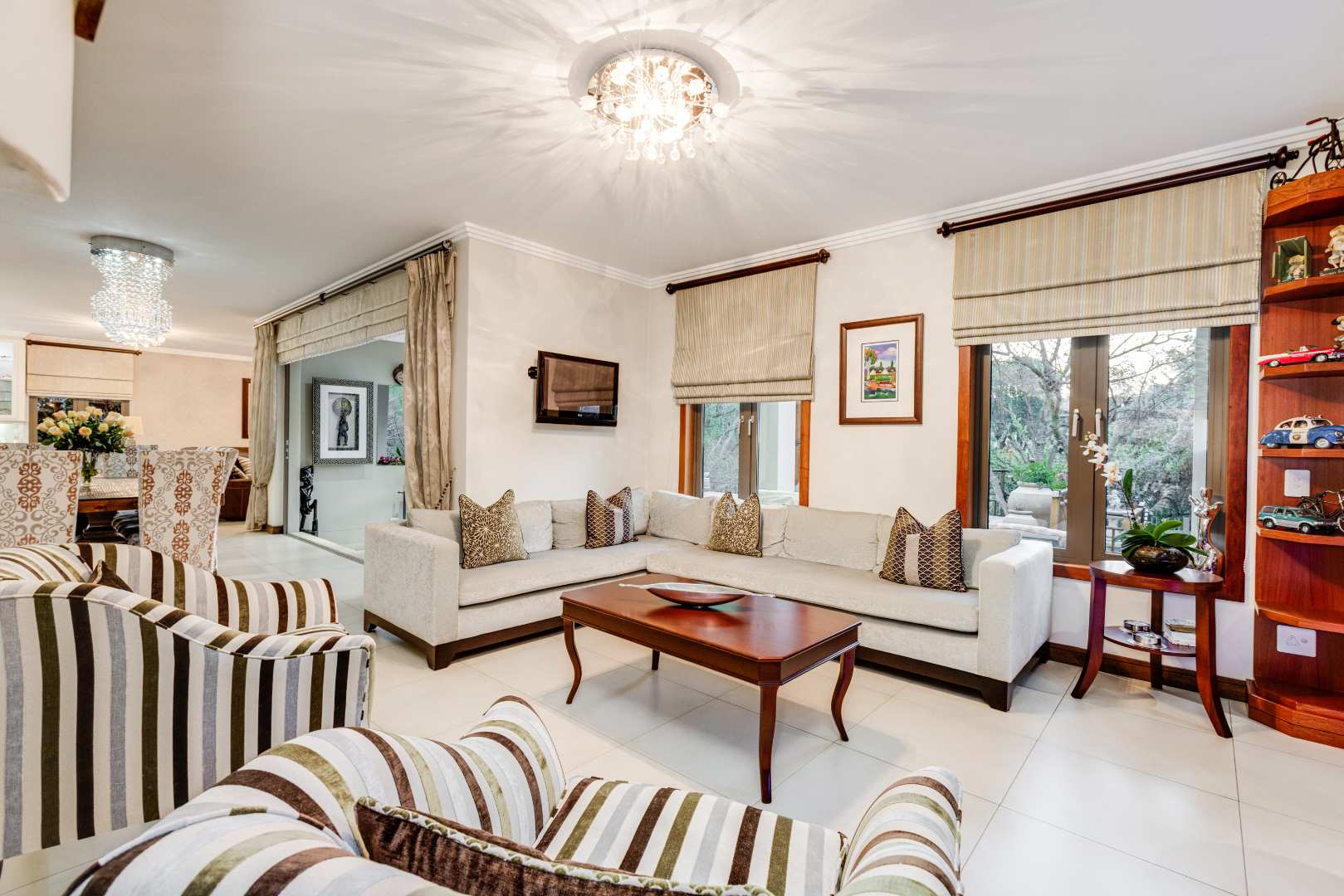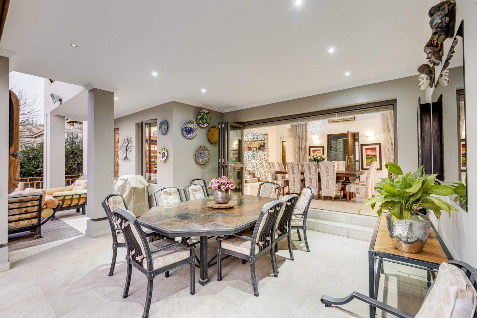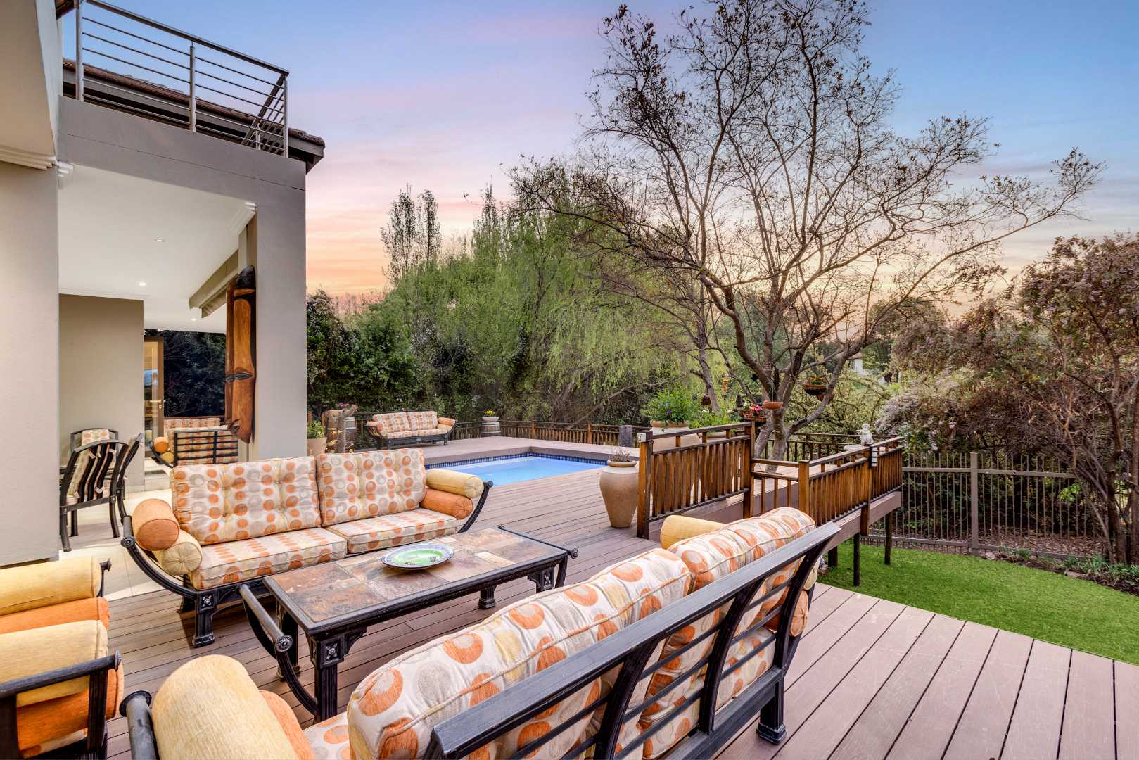 The open-plan lounge, dining room, TV room and Rhodesian Teak bar, all open out onto an expansive composite deck.