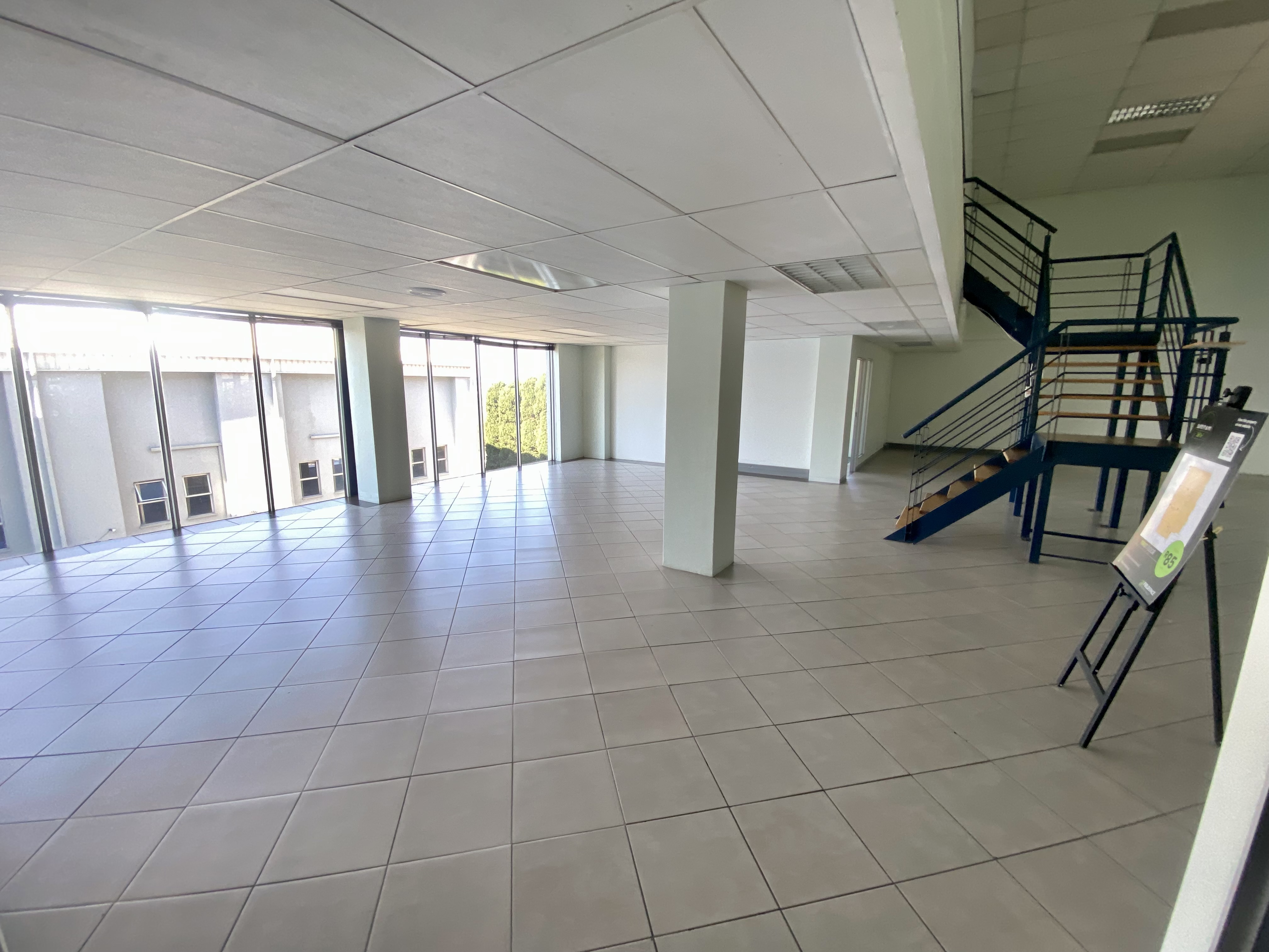 This unit offers floor-to-ceiling windows with an open-plan workspace, several private offices, a boardroom, and a server room. In addition, this unit offers a mezzanine level with further space for open-plan working.