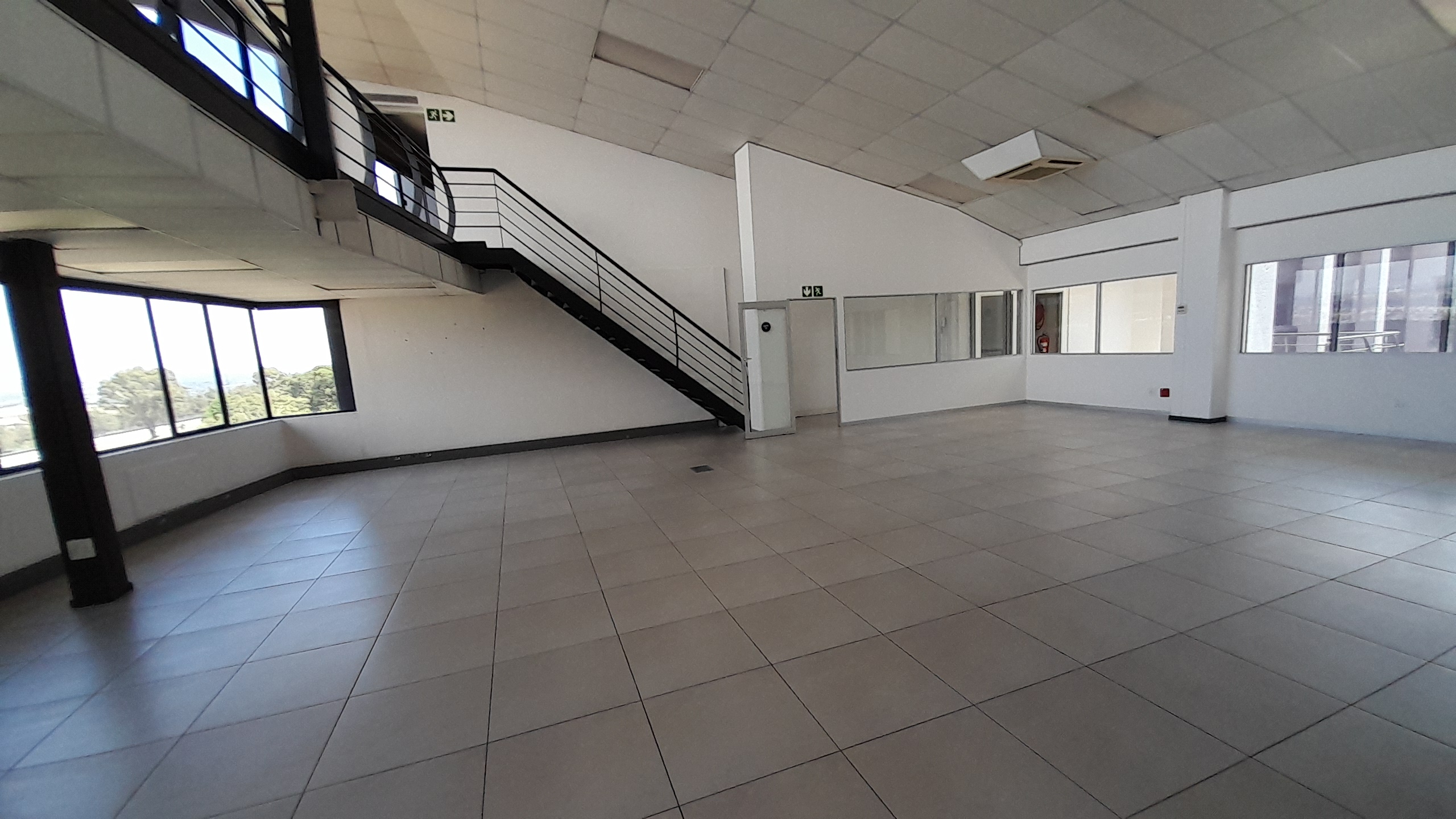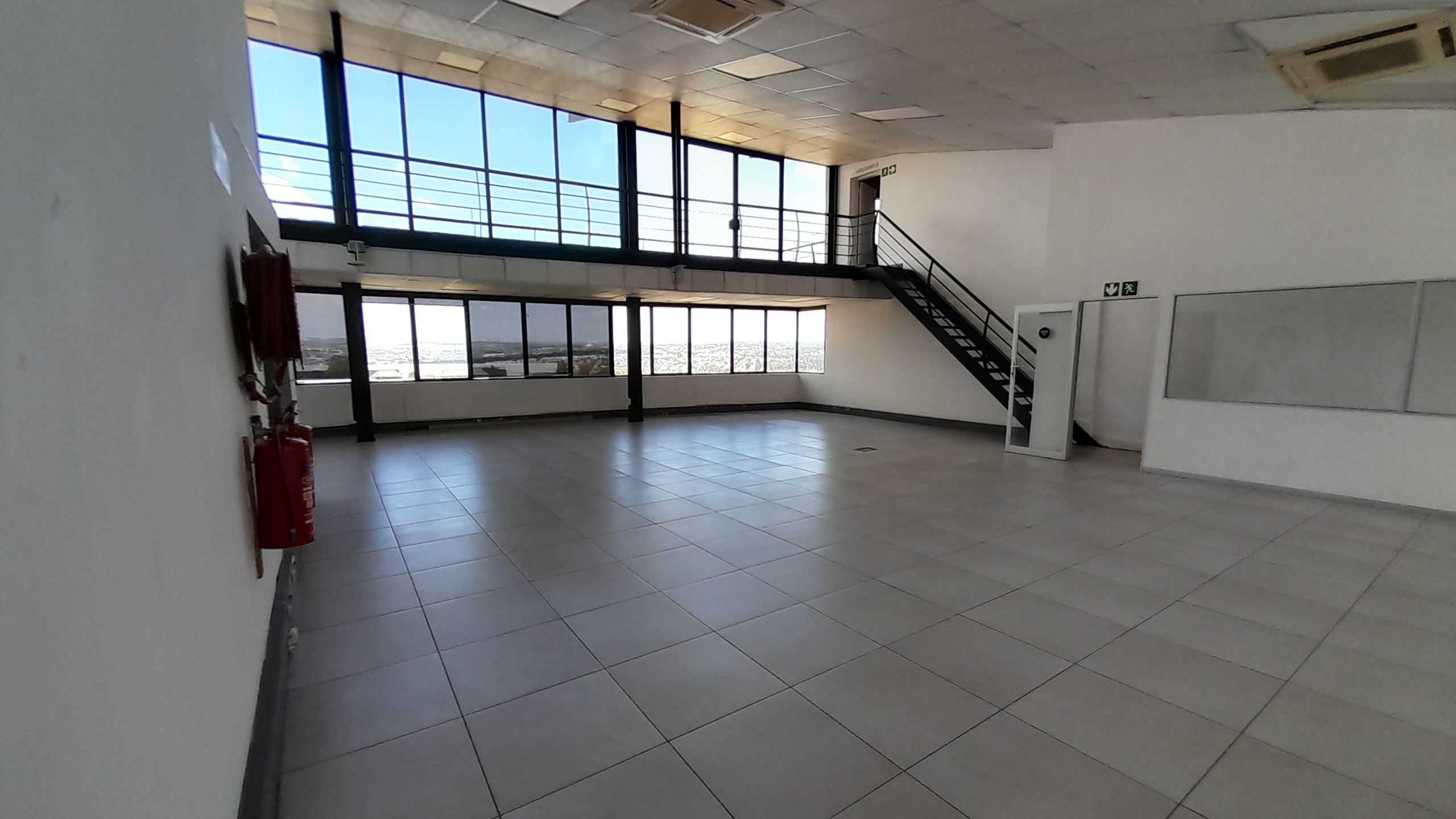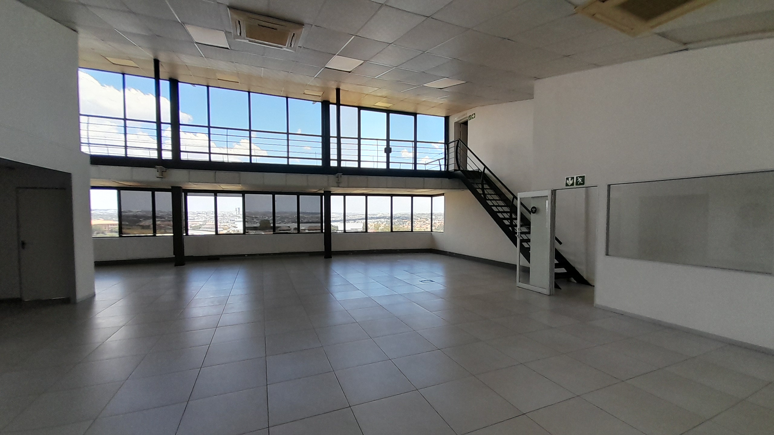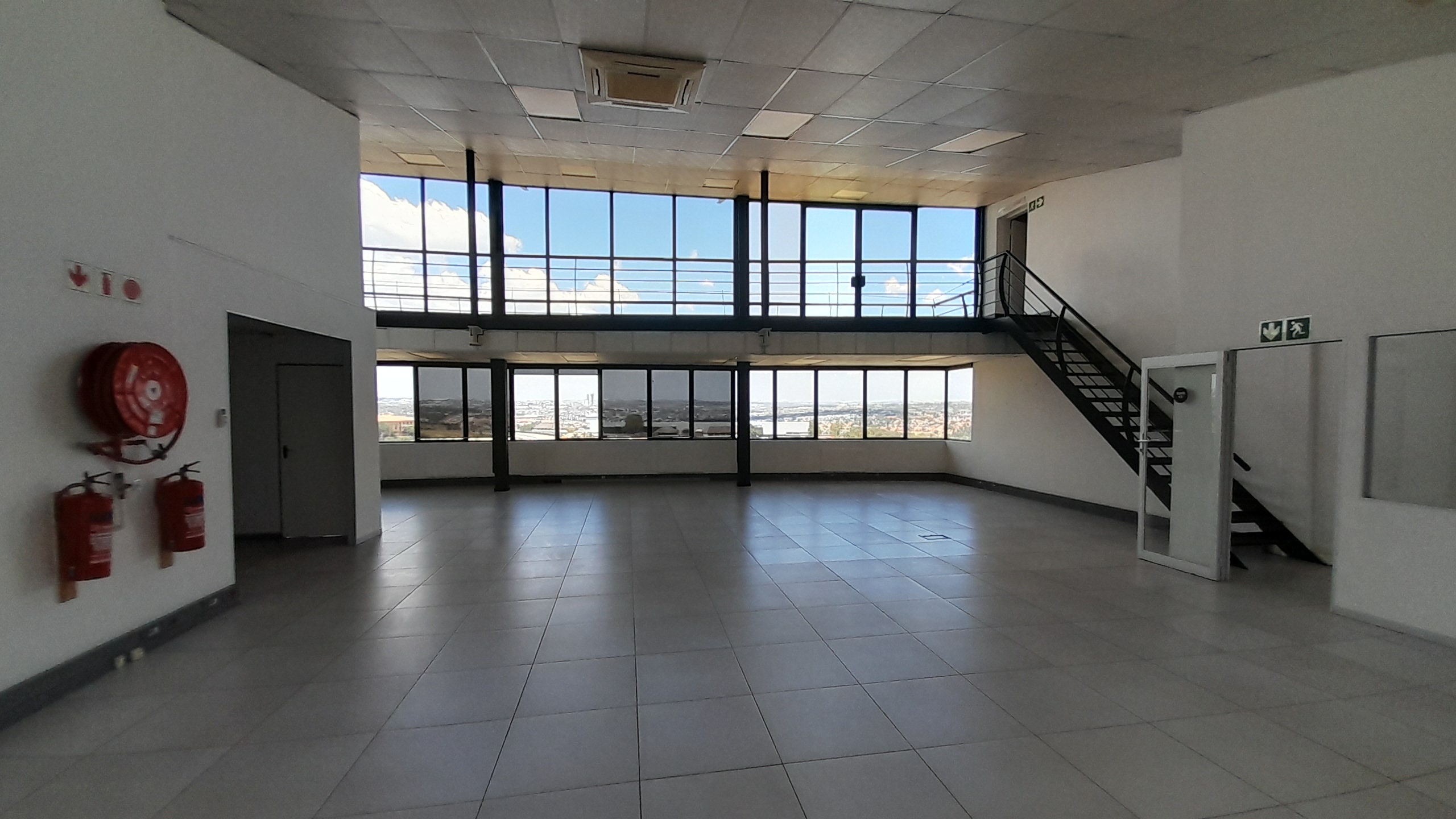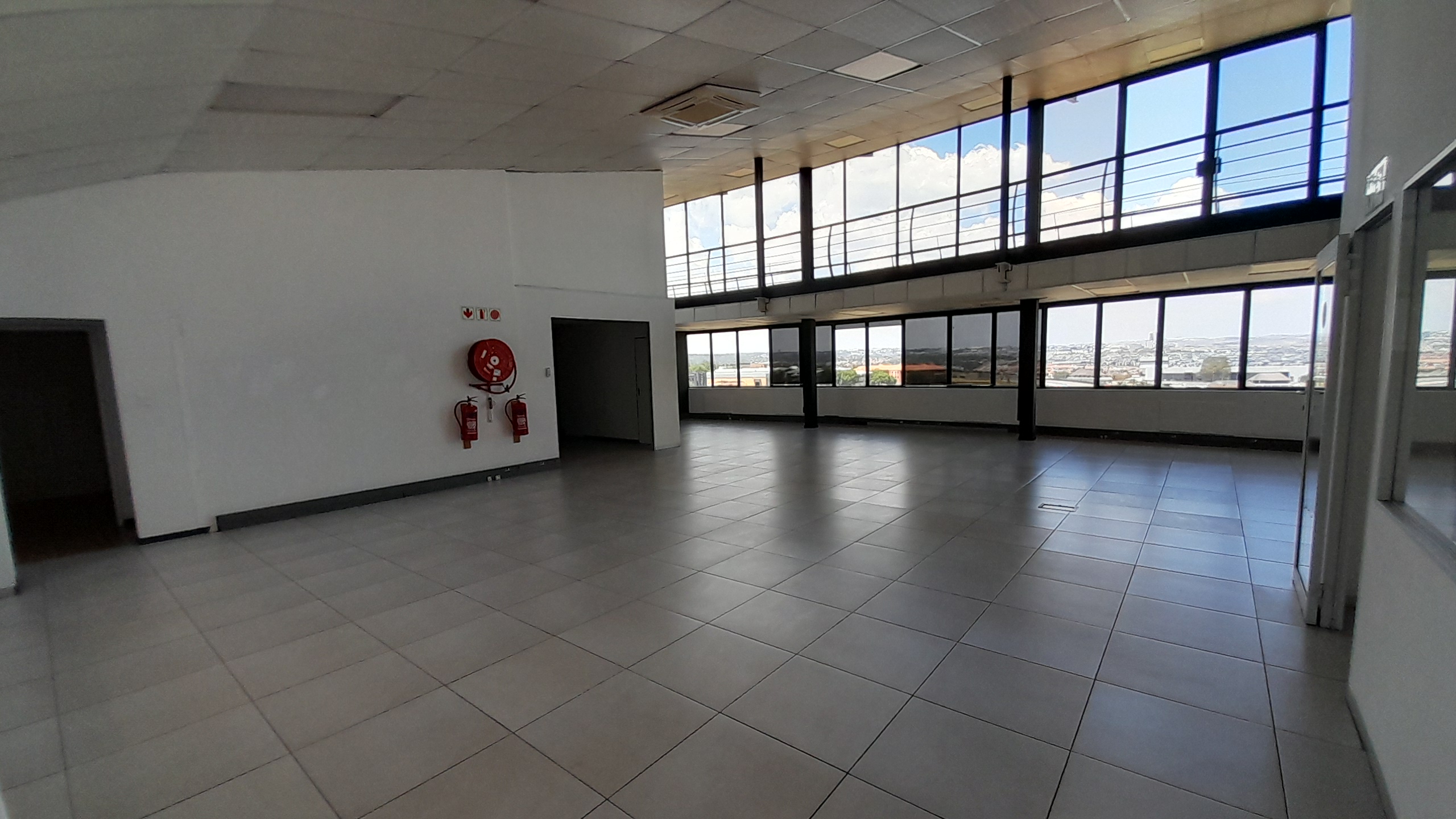 The layout includes a large open-plan area that can be used as office or display space, a stylish entertainment area with laminate flooring, one internal kitchen, and three internal ablutions. The main area features tiled flooring throughout and is surrounded by large wraparound windows that allow excellent natural light and provide panoramic views of the Kyalami Grand Prix Circuit. A private balcony enhances the appeal of the space, serving as an ideal breakaway or display area with unmatched visibility across the track.