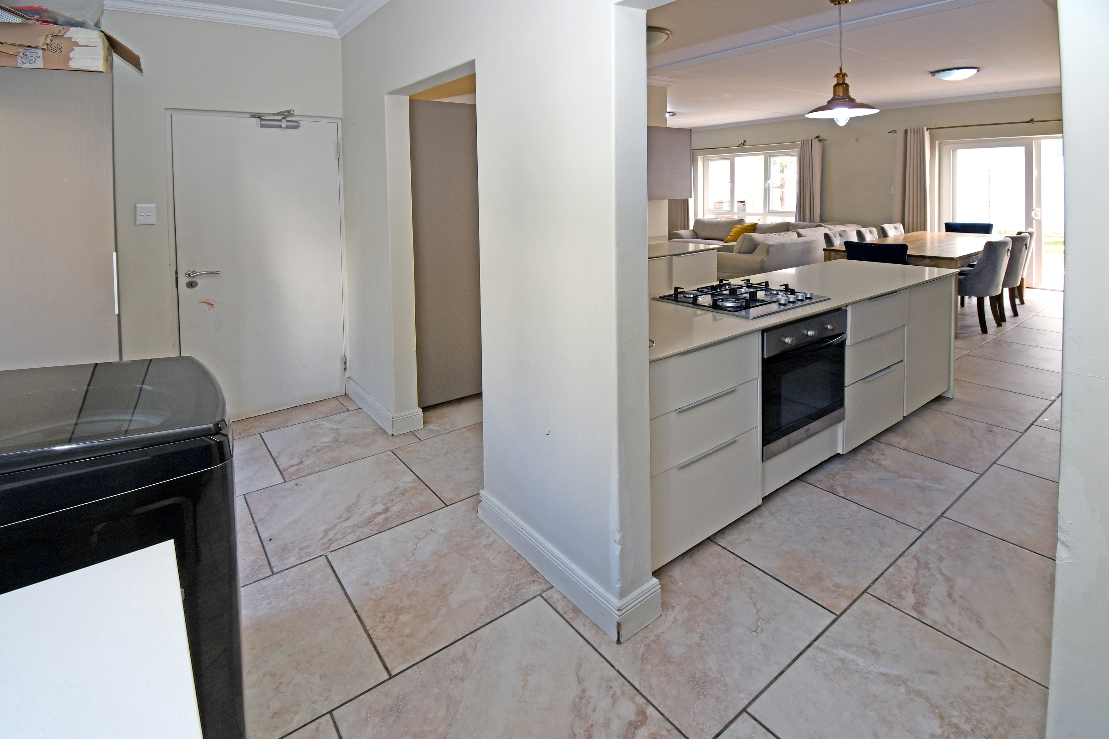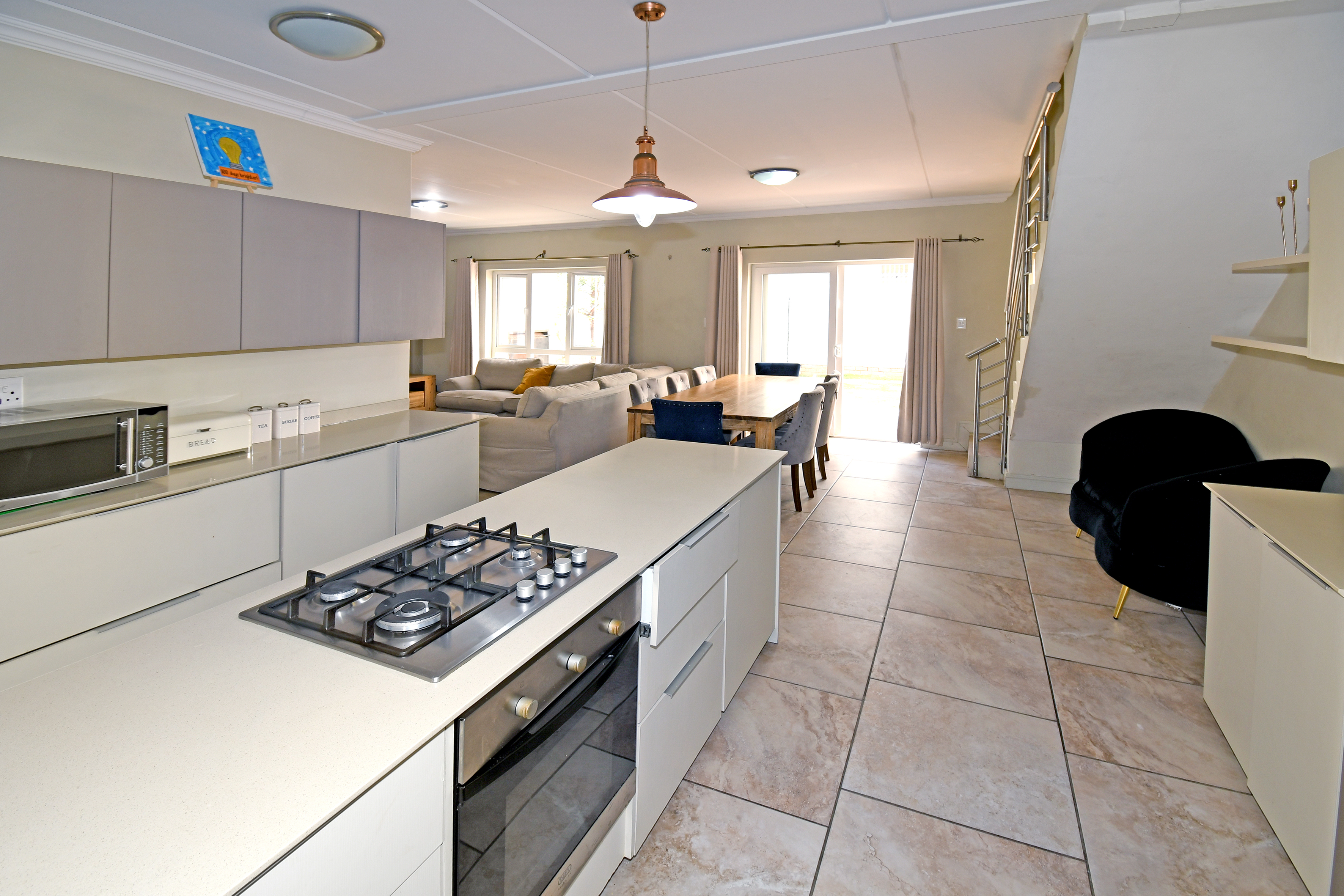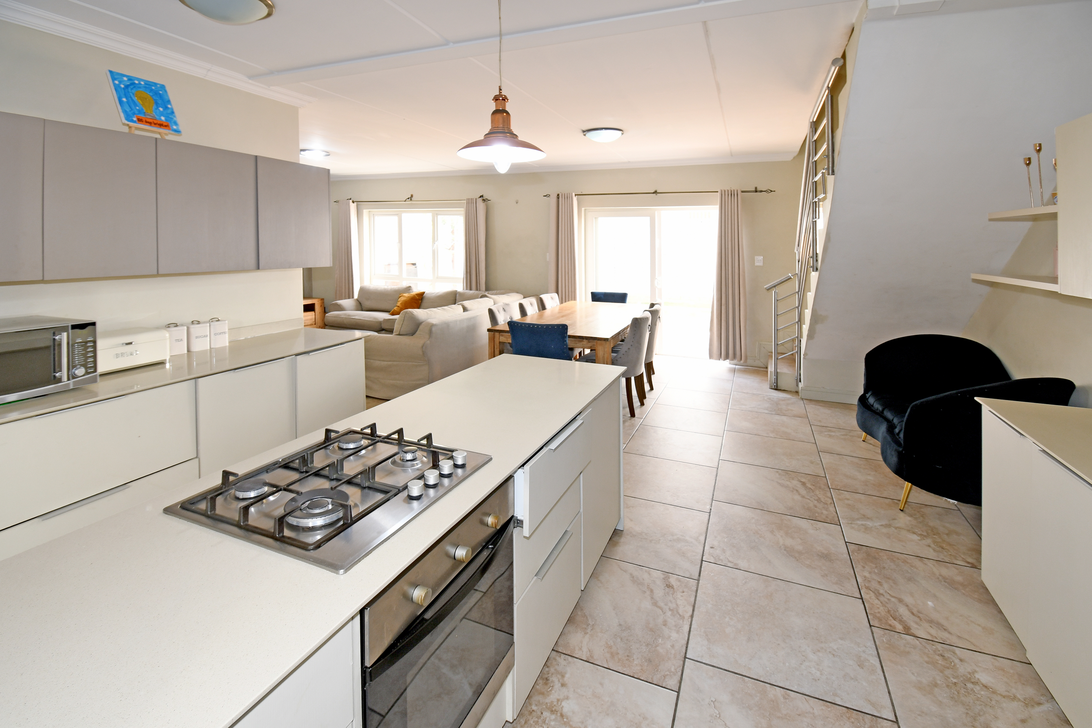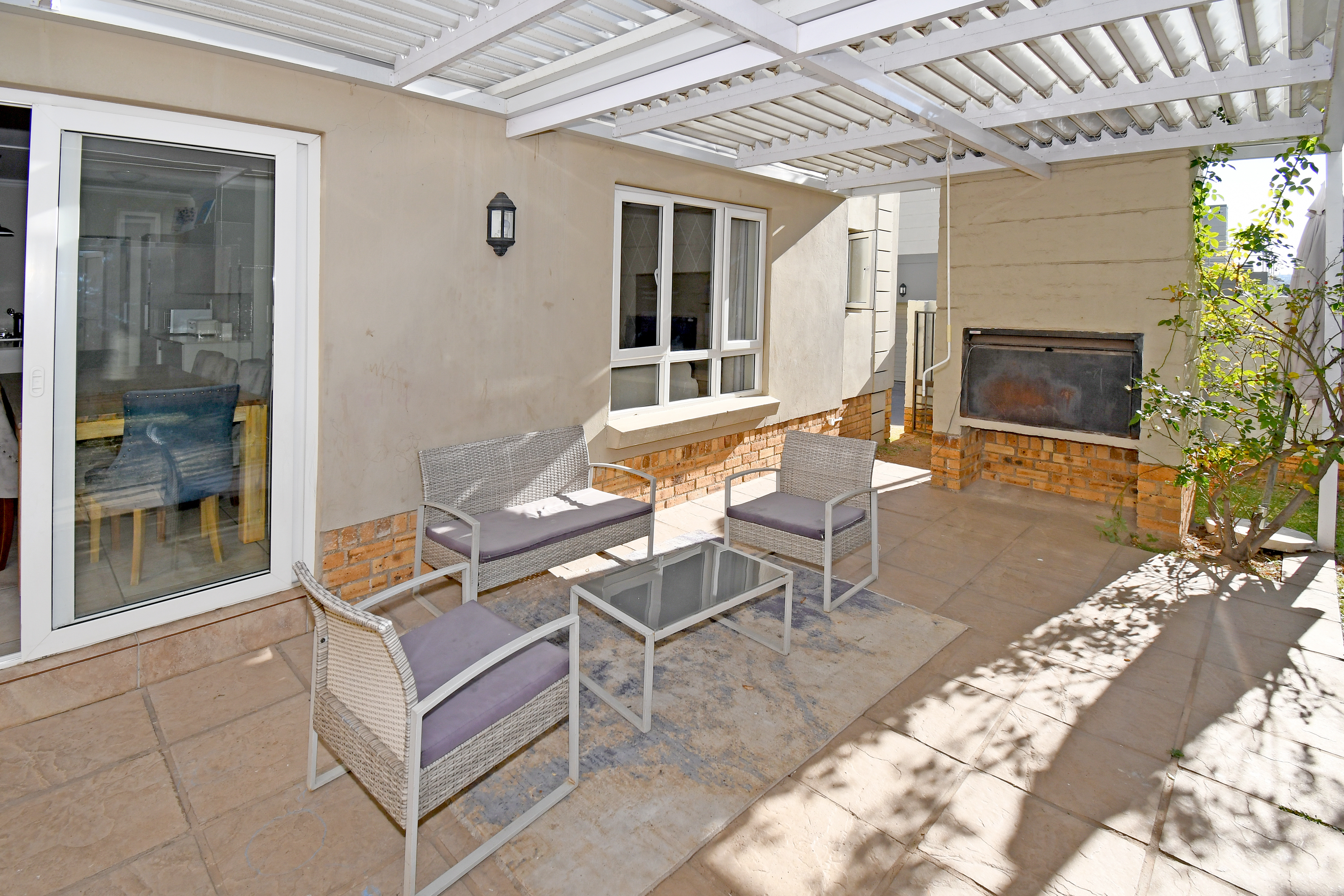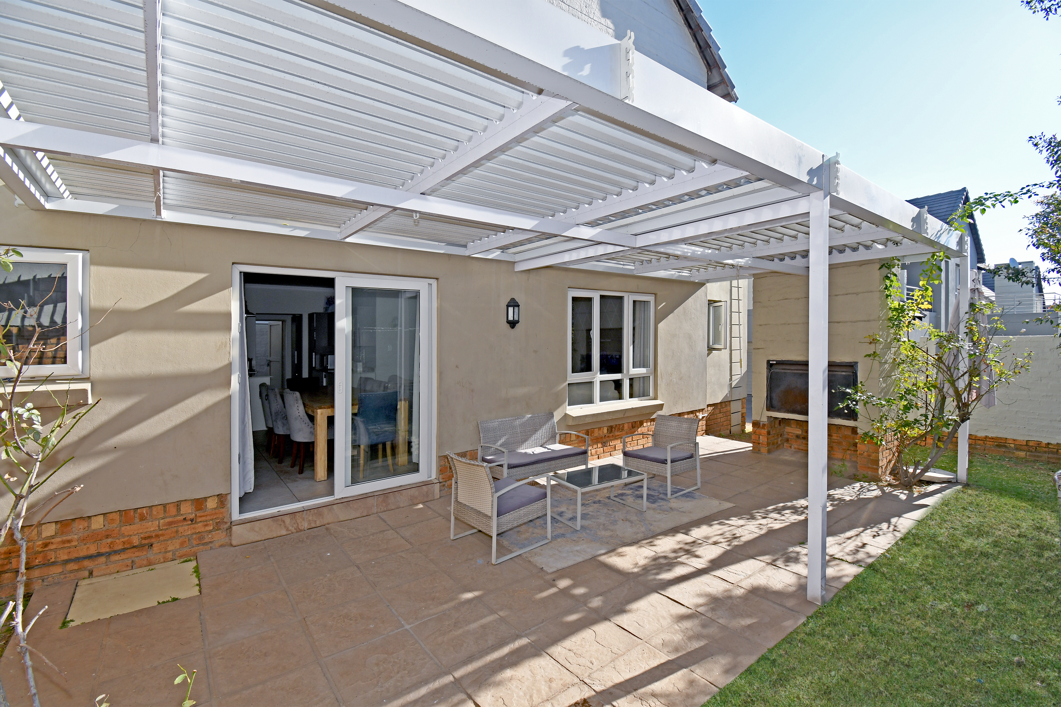 Discover this beautiful, airy residence perfect for a modern lifestyle. Located in a secure estate, this lock-up-and-go home features an expansive open-plan living area, ideal for dining and lounging. Sliding doors seamlessly connect the living space to a covered patio, complete with a built-in braai—perfect for entertaining! The stunning kitchen boasts a centre island, gas hob, electric oven, separate scullery and space for three under-counter appliances.