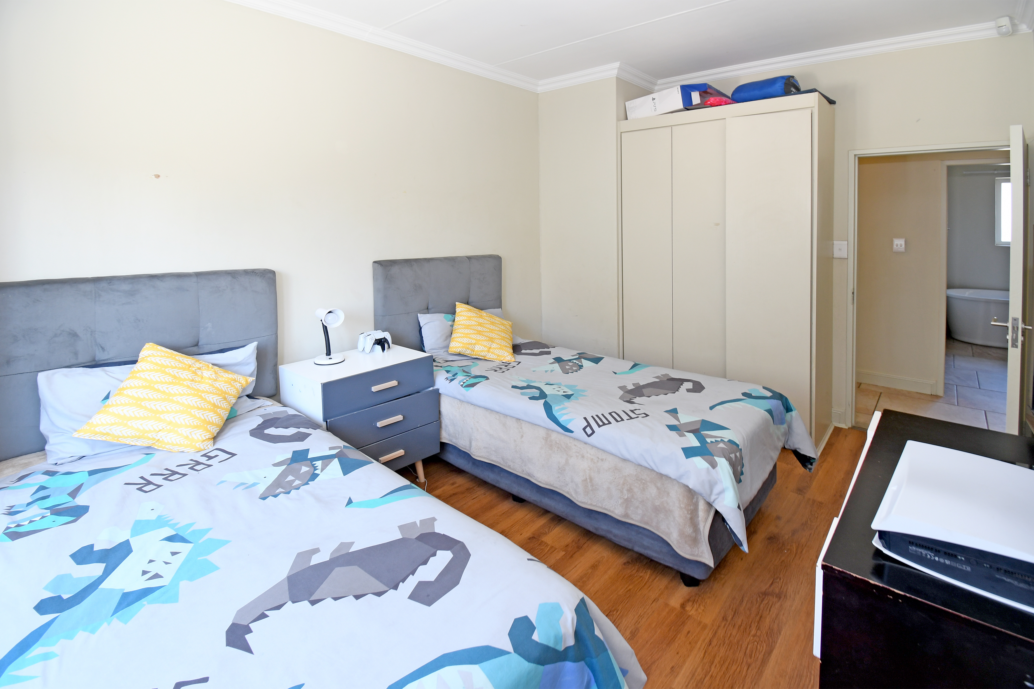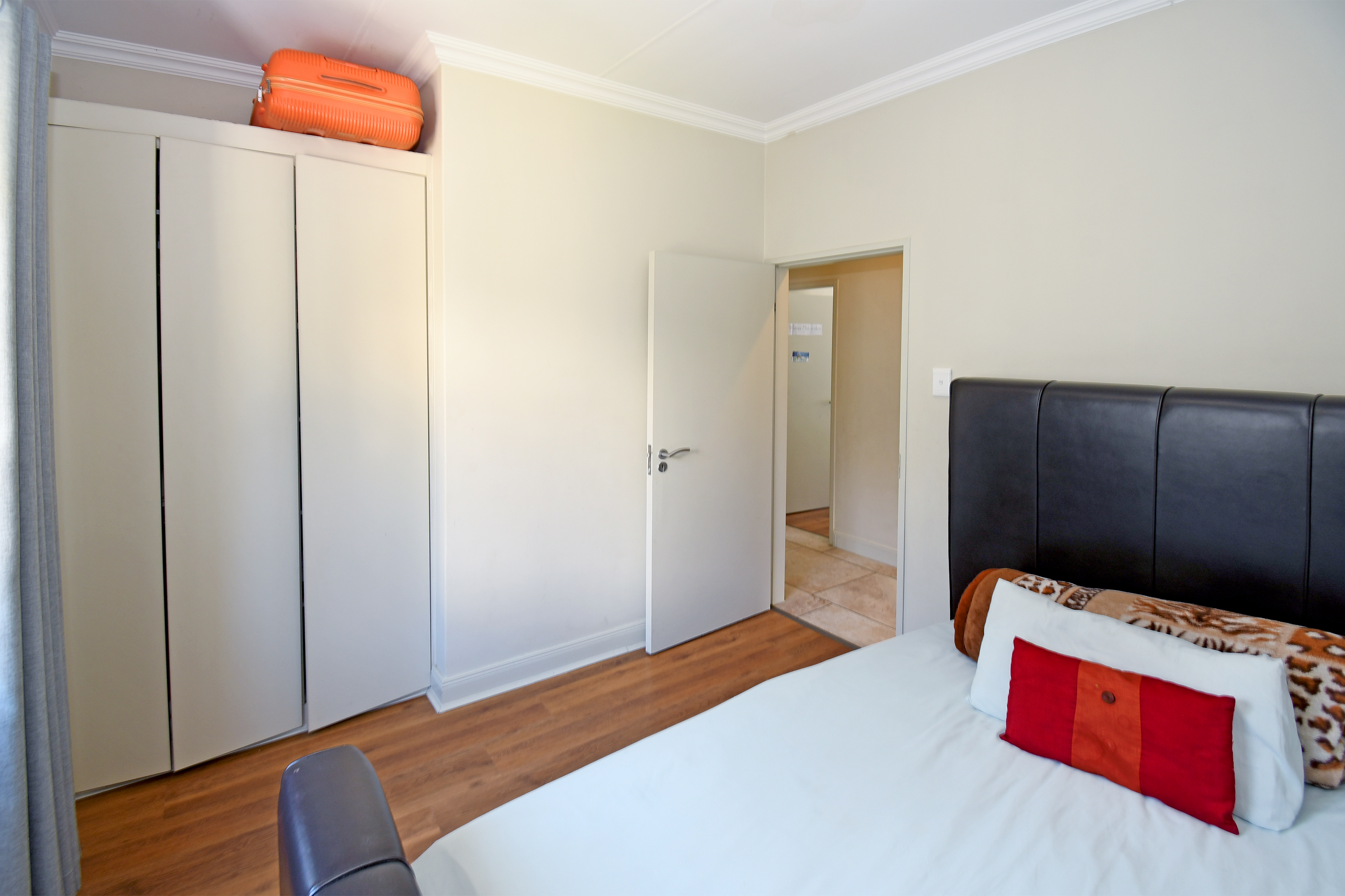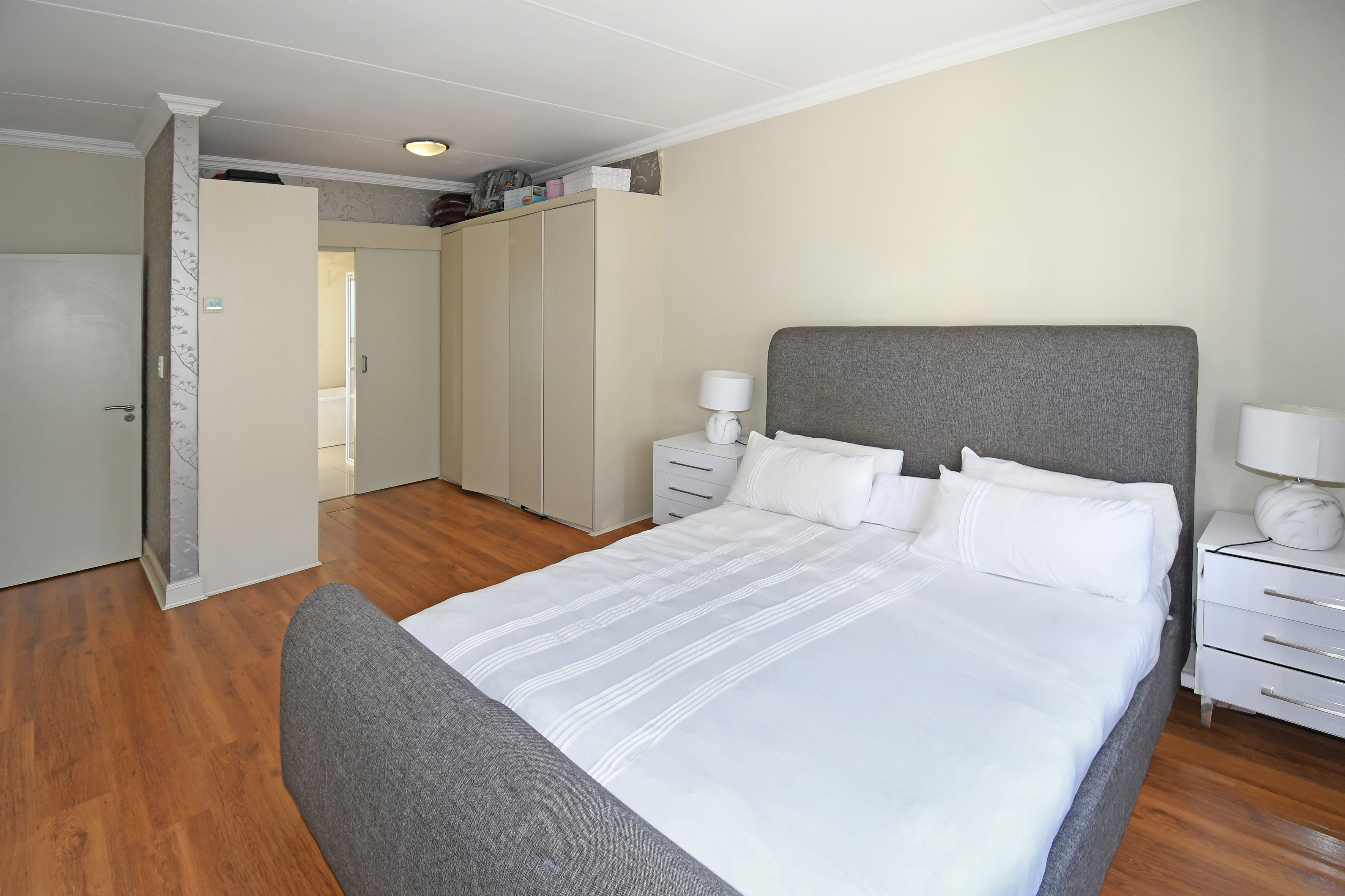 Upstairs, you'll find three well-appointed bedrooms. The main suite features a luxurious full en-suite bathroom. The second bathroom serves the two additional bedrooms, all equipped with ample cupboard space and stylish laminate flooring.