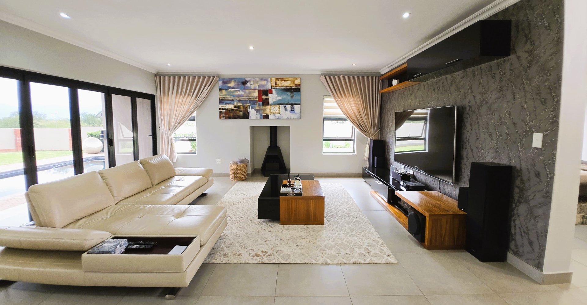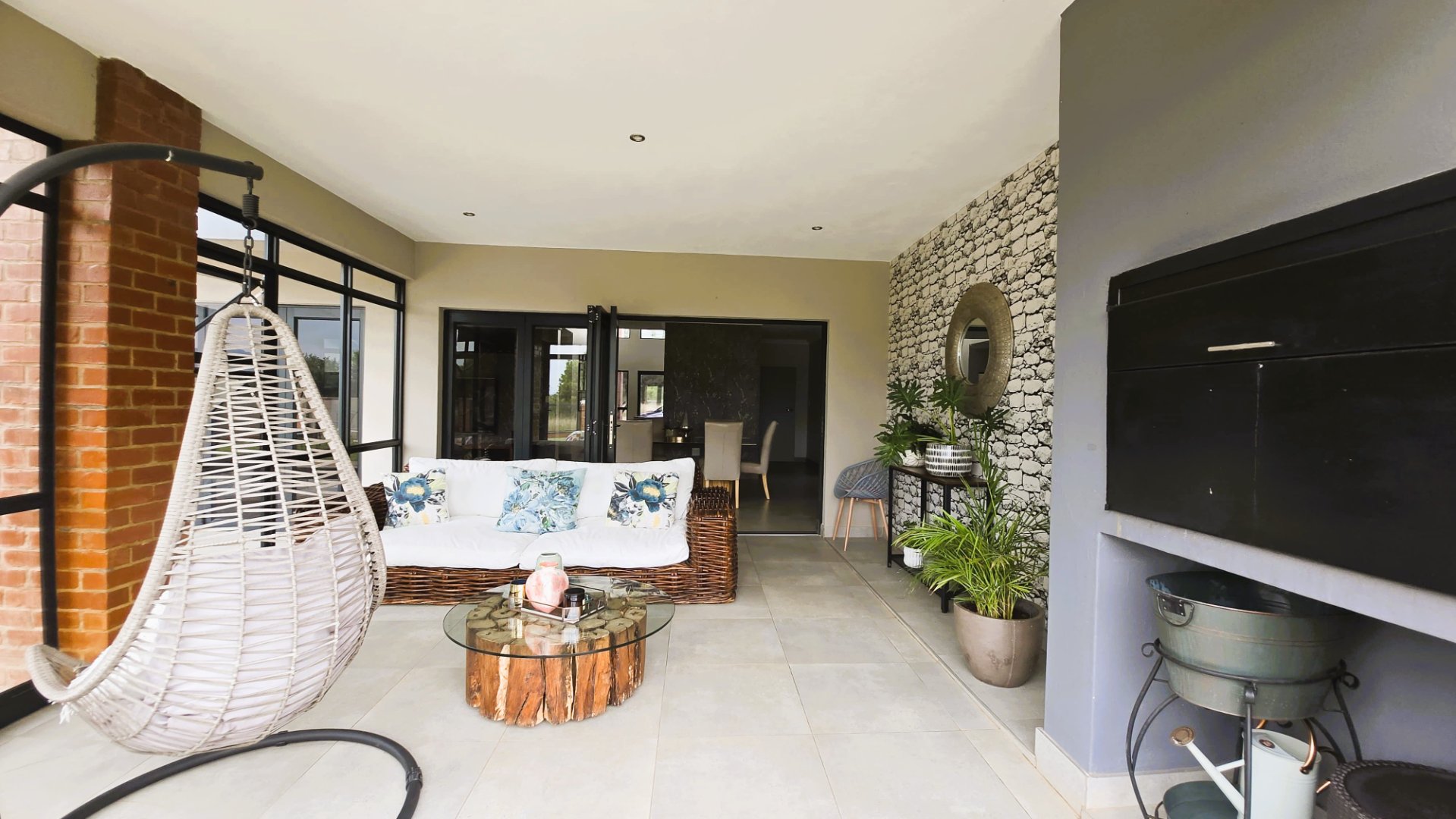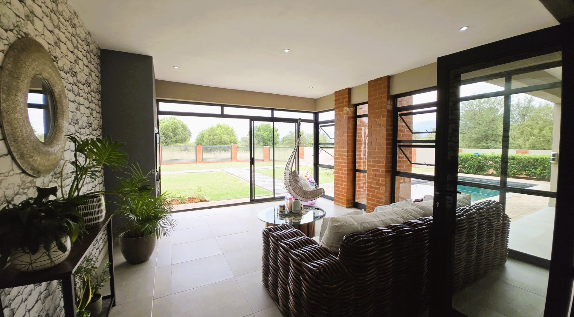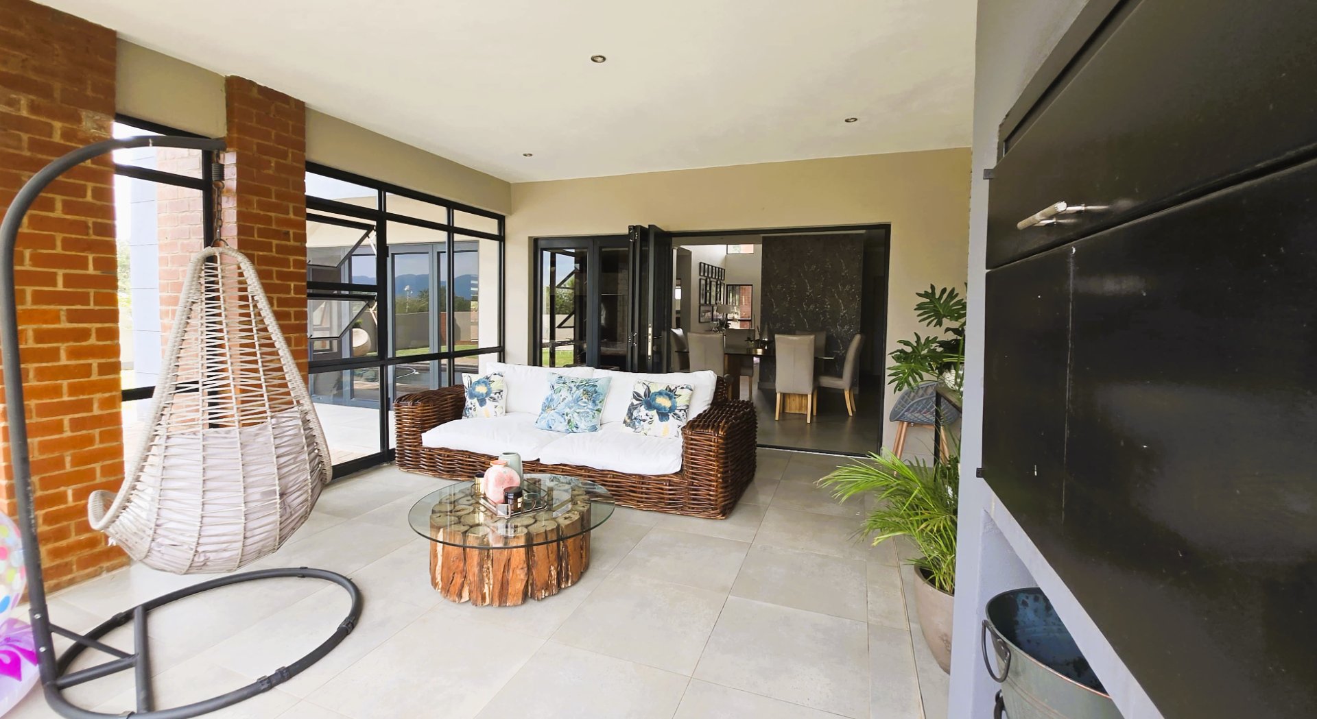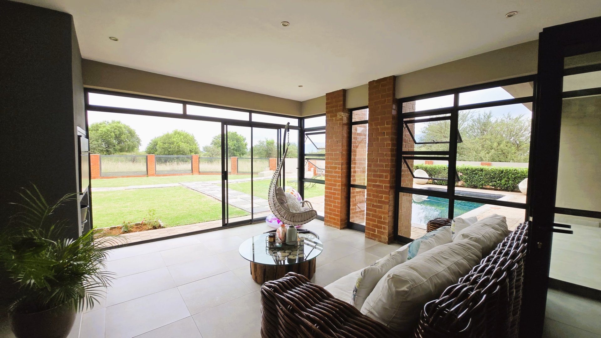Enjoy year-round entertaining in the enclosed patio with sliding doors that open onto a landscaped garden, sparkling swimming pool, boma, and a thoughtfully planned entertainment area.