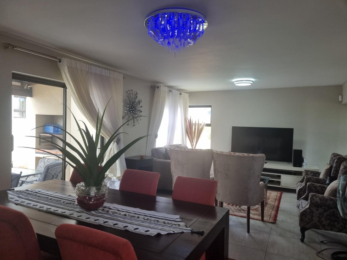 Lounge has gas fireplace. The patio opens with aluminum sliding doors leading to patio with braai area and Spacious private garden.