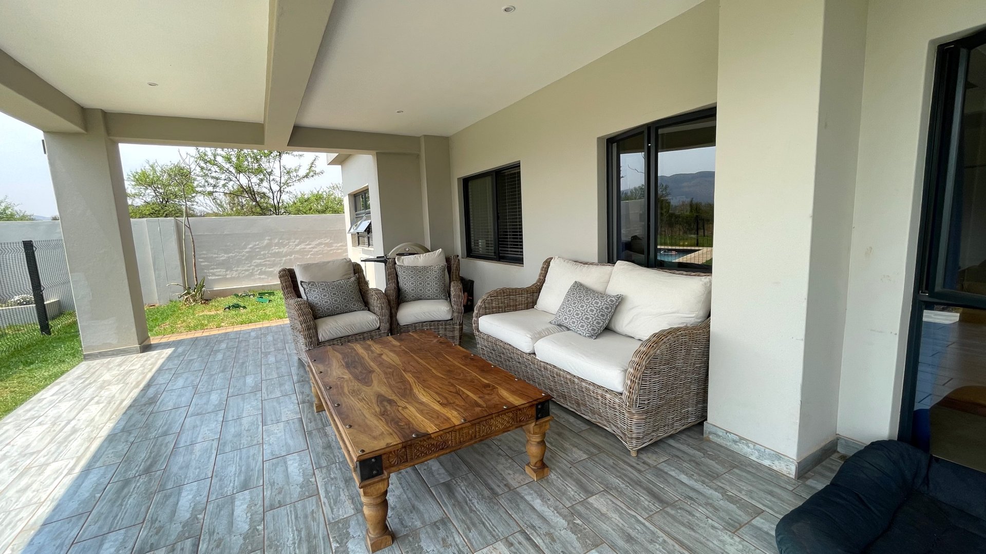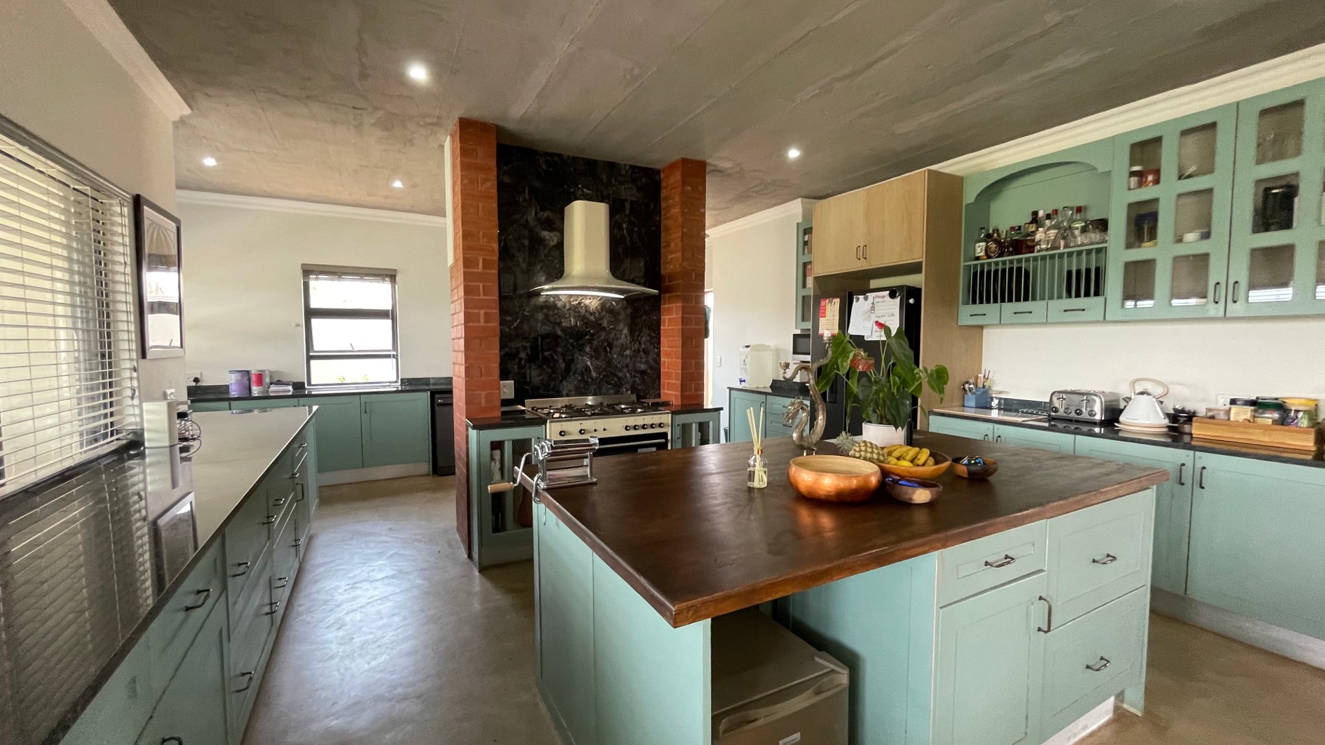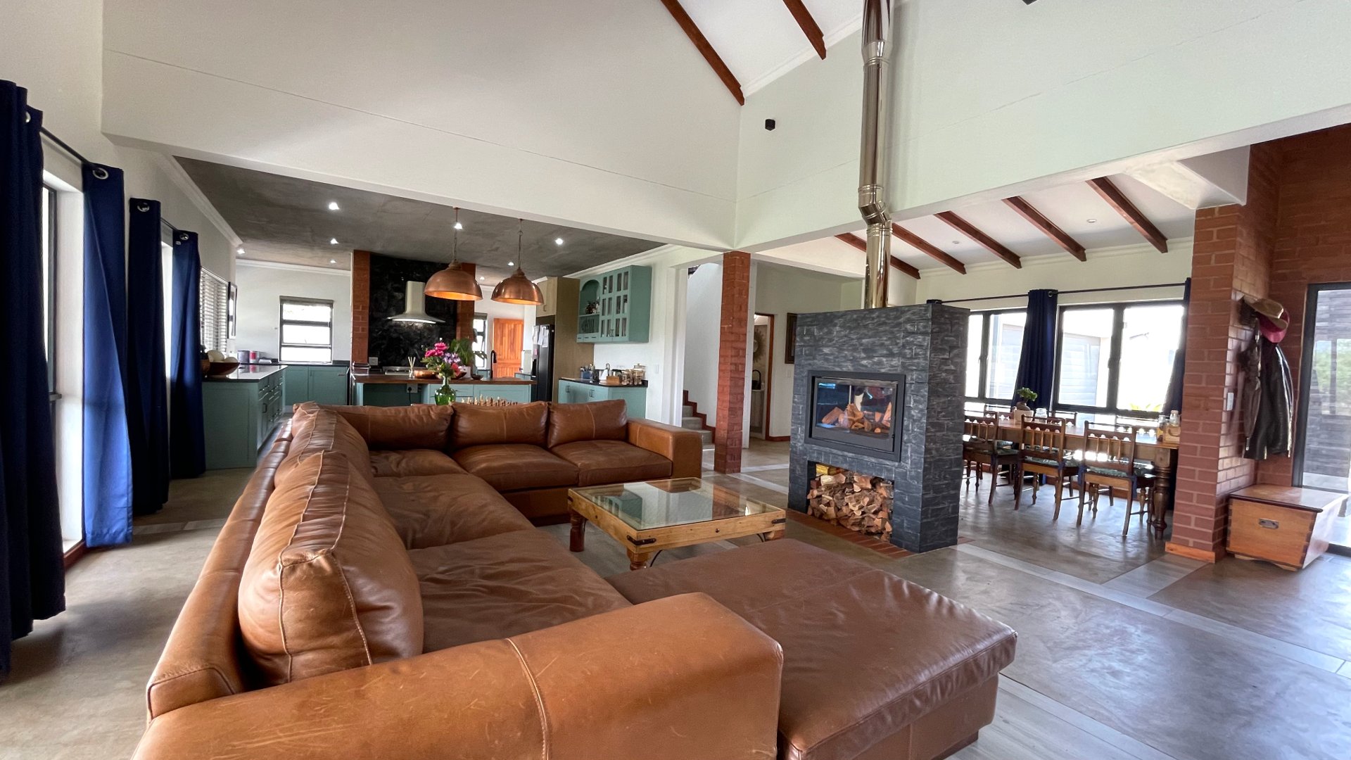 Open plan kitchen and scullery, dining and lounge are with a double-sided Fireplace. Sliding doors in living area open up to the patio and braai area with northern mountain views.