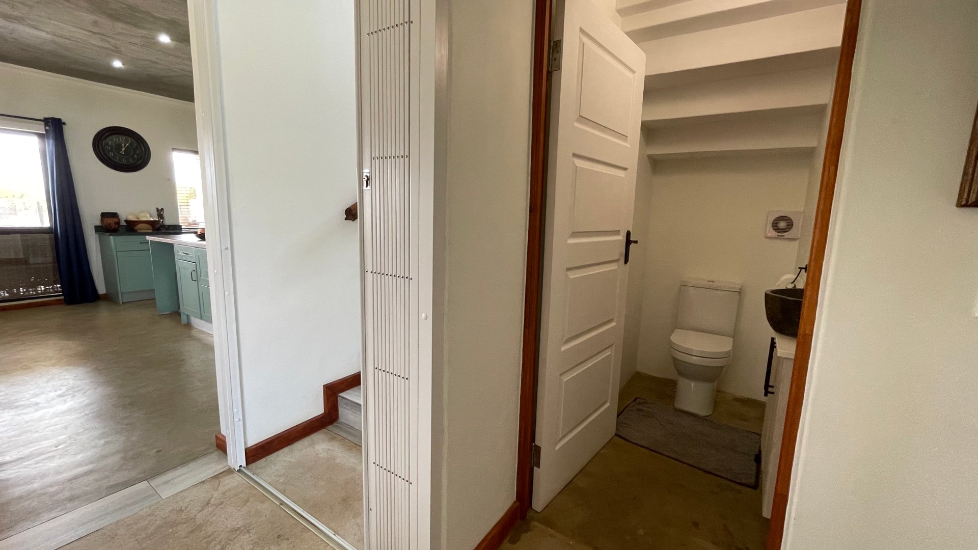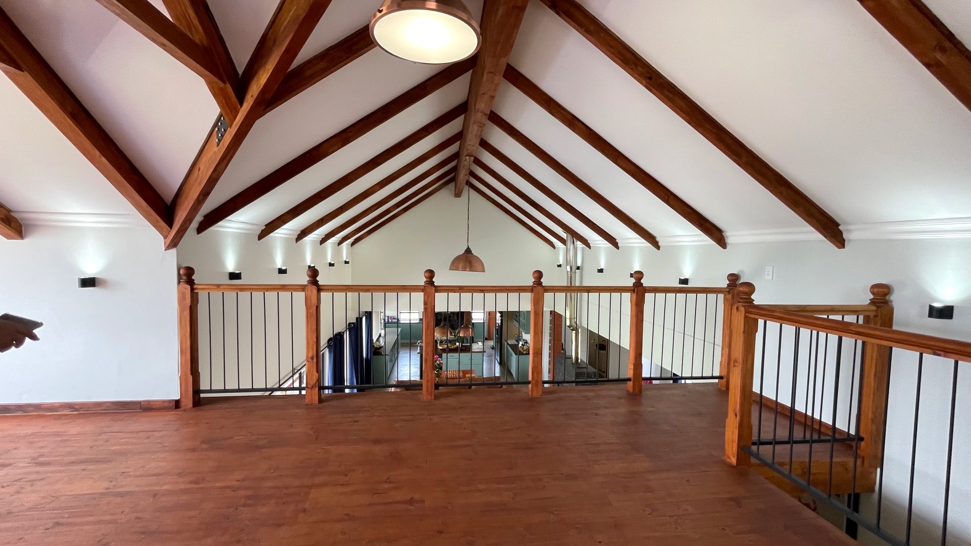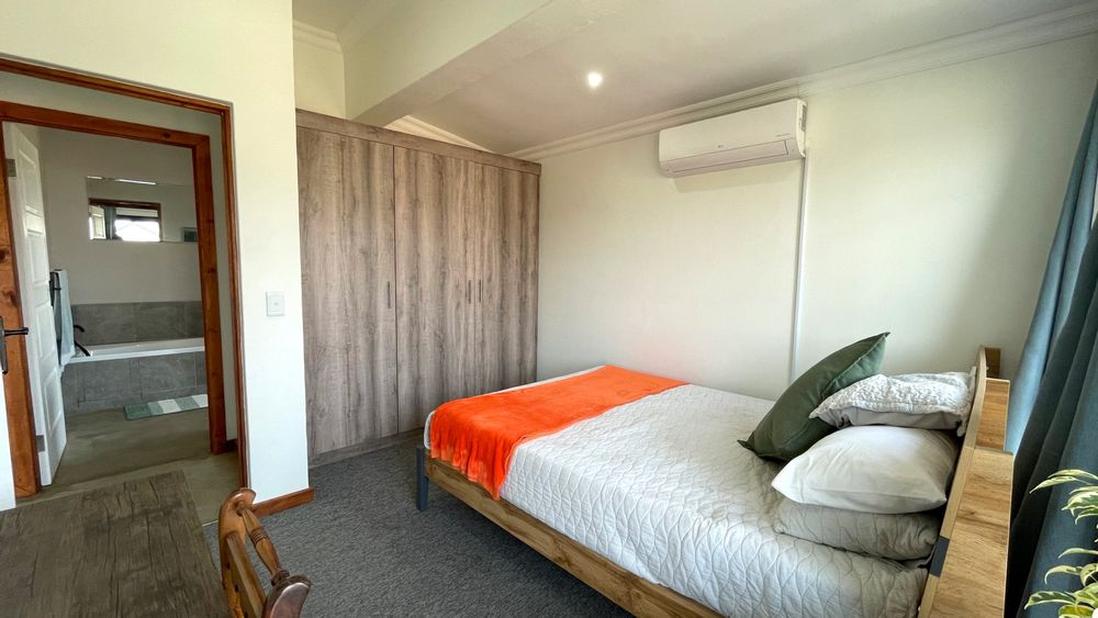 Open plan kitchen and scullery, dining and lounge are with a double-sided Fireplace. Sliding doors in living area open up to the patio and braai area with northern mountain views.