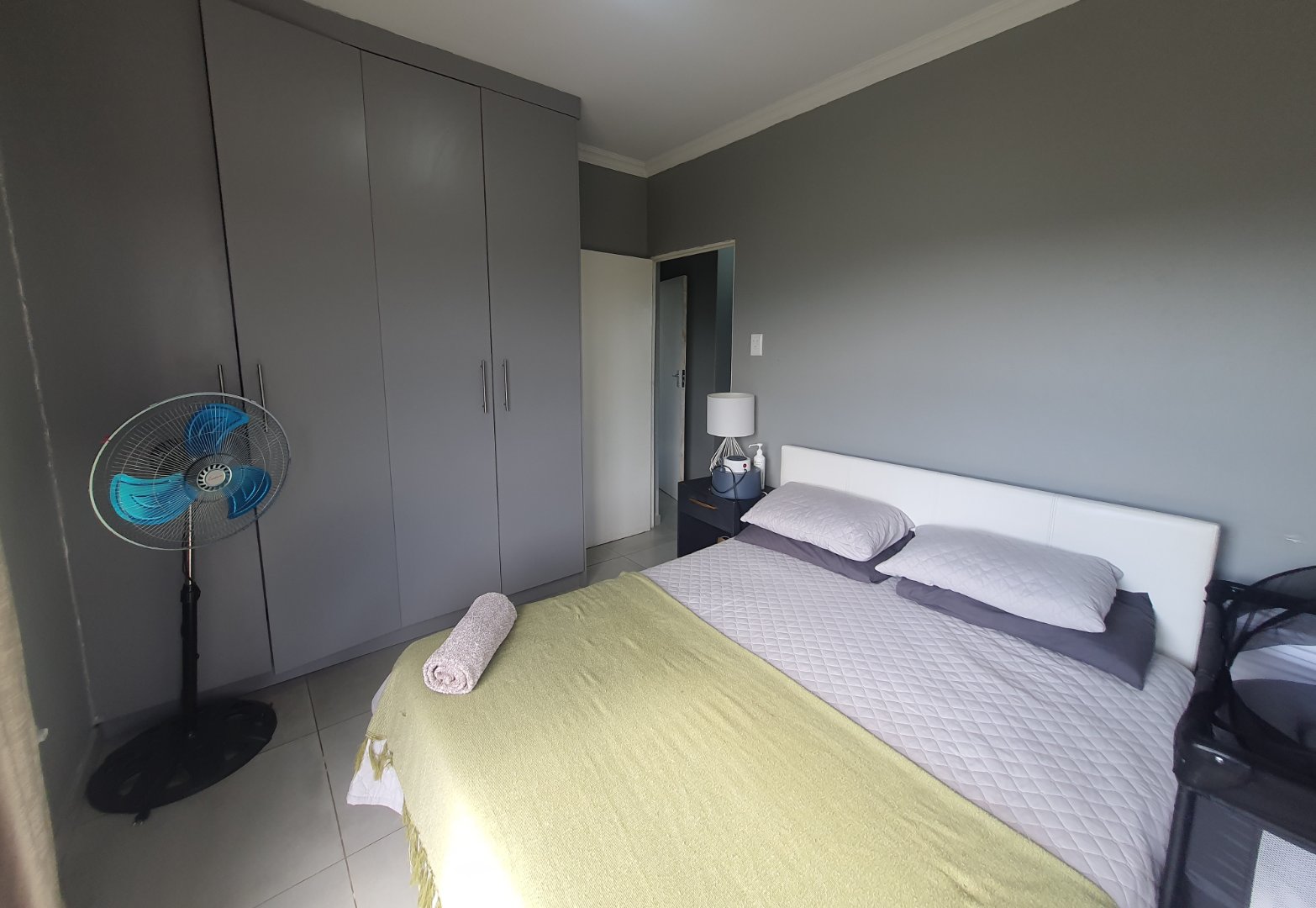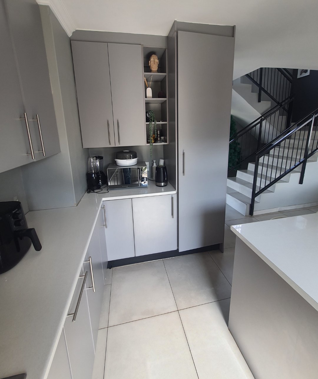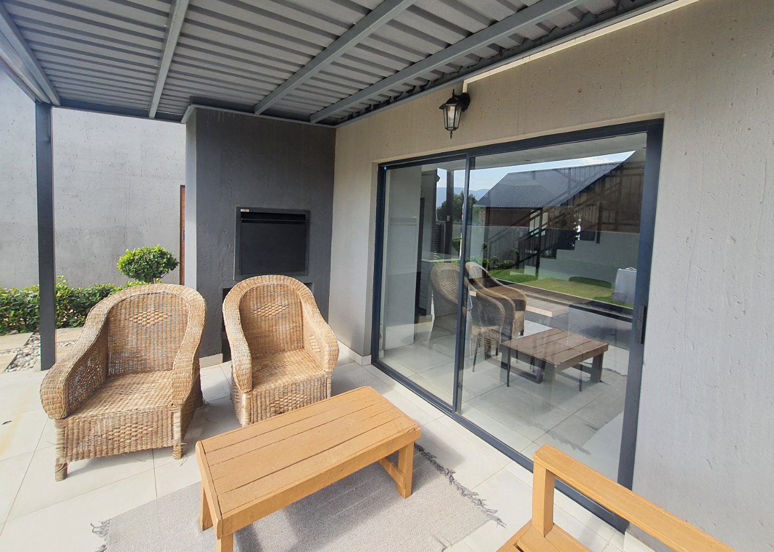 The open-plan kitchen flows seamlessly into the lounge and dining area, creating a warm and inviting living space. Large sliding doors open onto a covered patio, ideal for entertaining, and lead to a spacious, landscaped garden, inclusive of garden services with a sparkling pool.