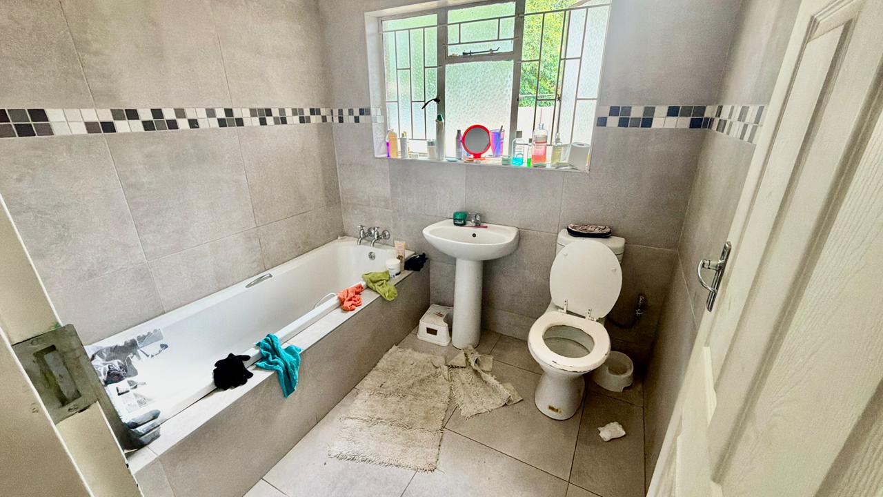 * Main bathroom fitted with bath, basin, and toilet (tiled floor)