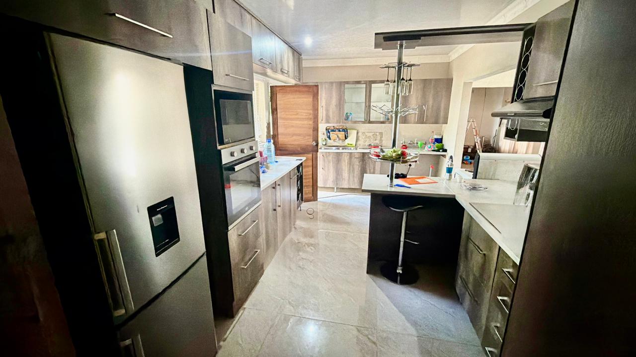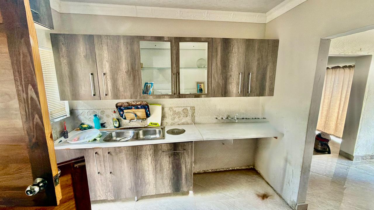 * Kitchen with built-in cupboards and tiled floors