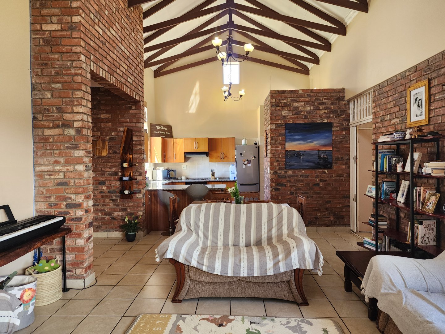 * Open-plan kitchen and living room with vaulted ceilings and exposed beams.