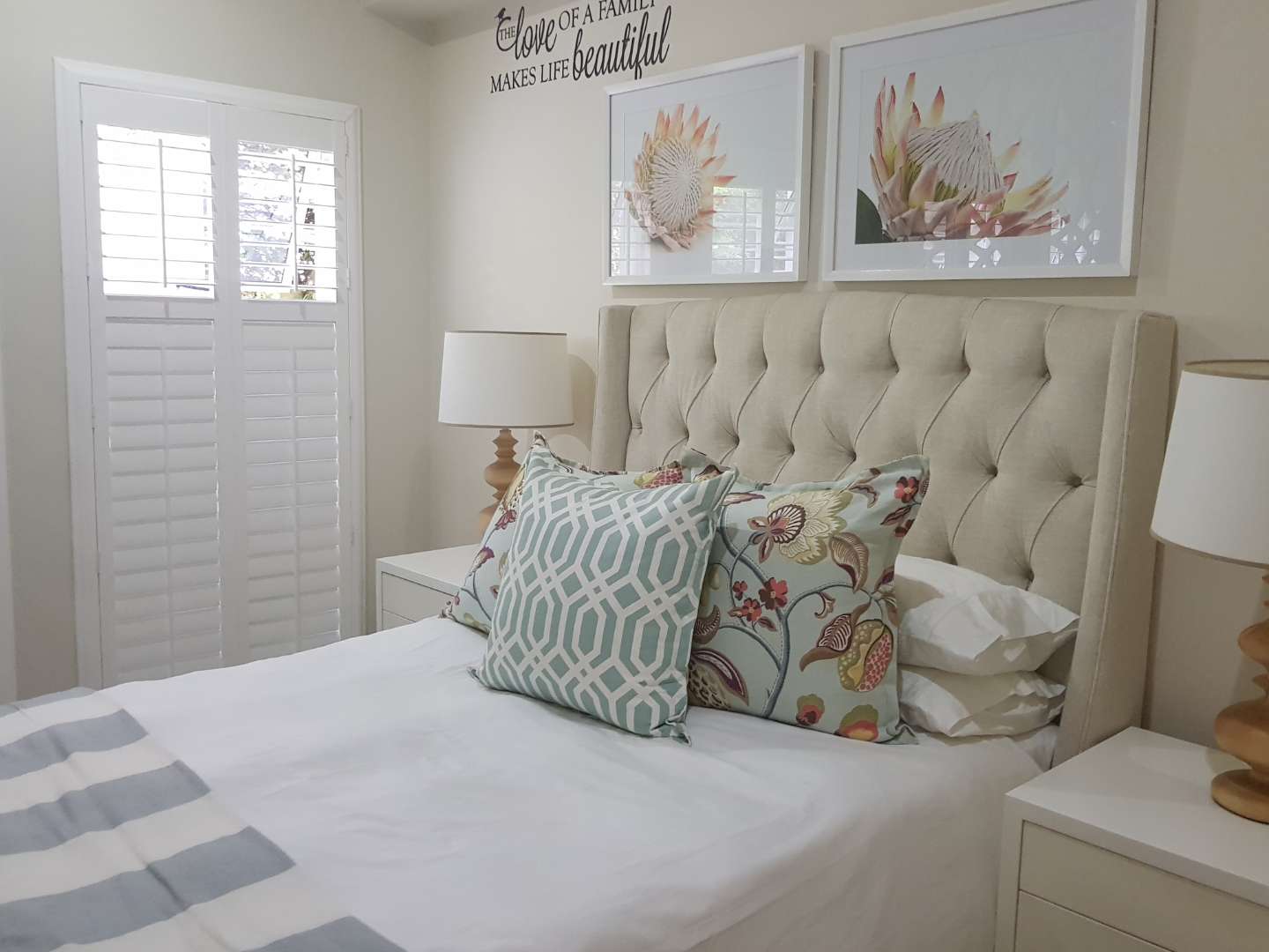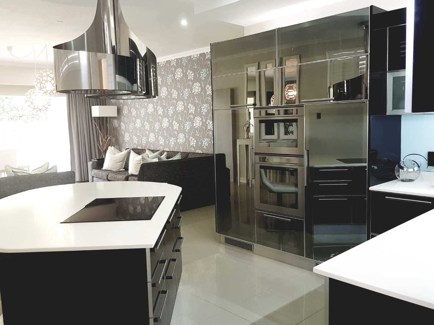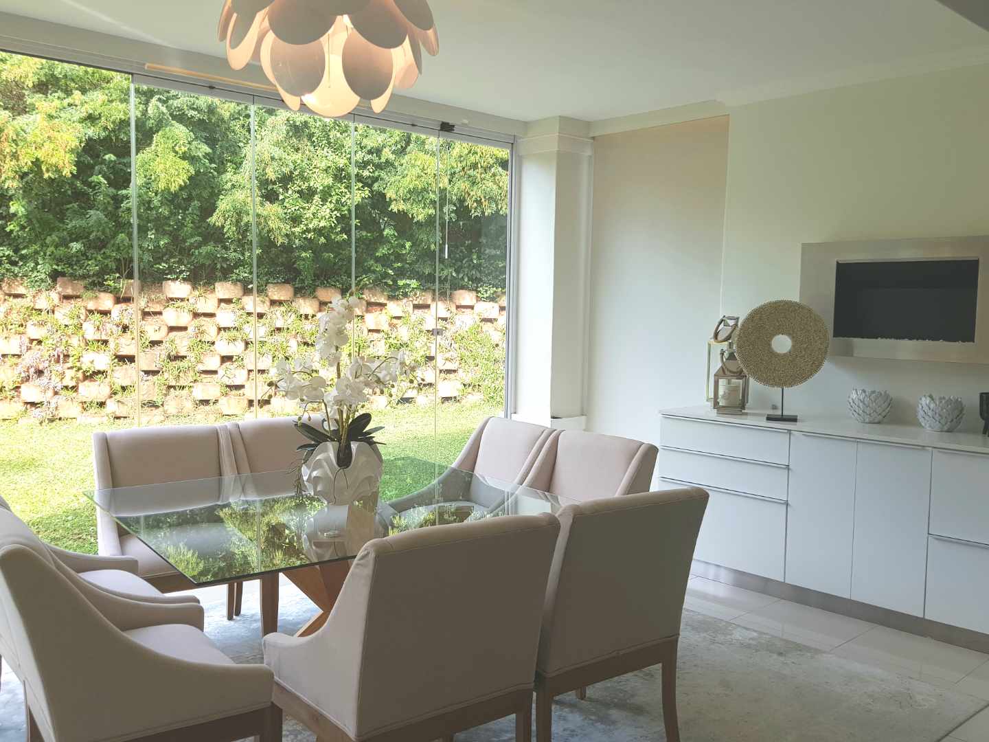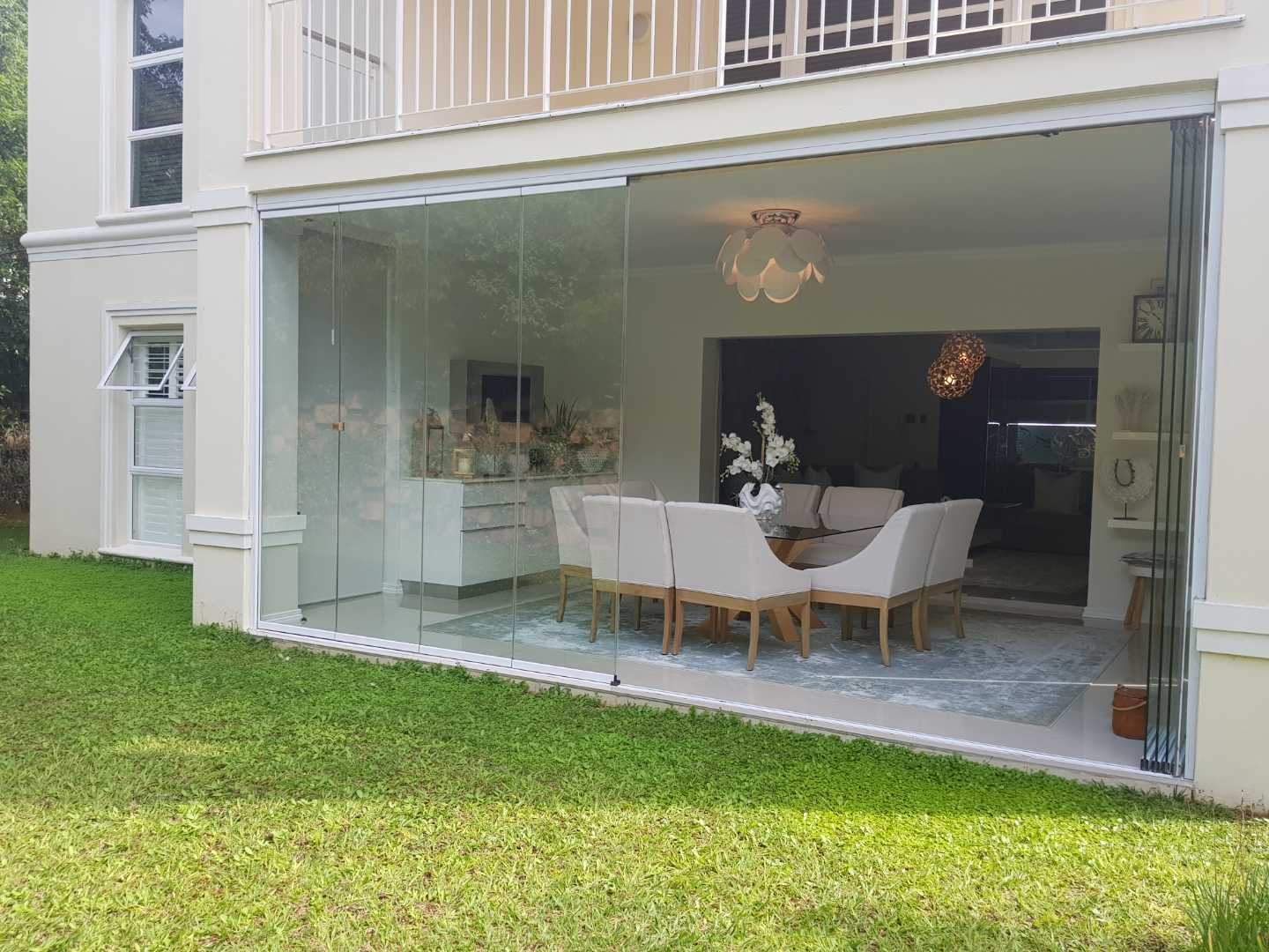 Step into the well-appointed open plan kitchen featuring a breakfast counter and integrated appliances, seamlessly flowing into a chic living room and enclosed patio. The glassed patio offers a picturesque view of lush gardens while providing privacy with the convenience of roller blinds.