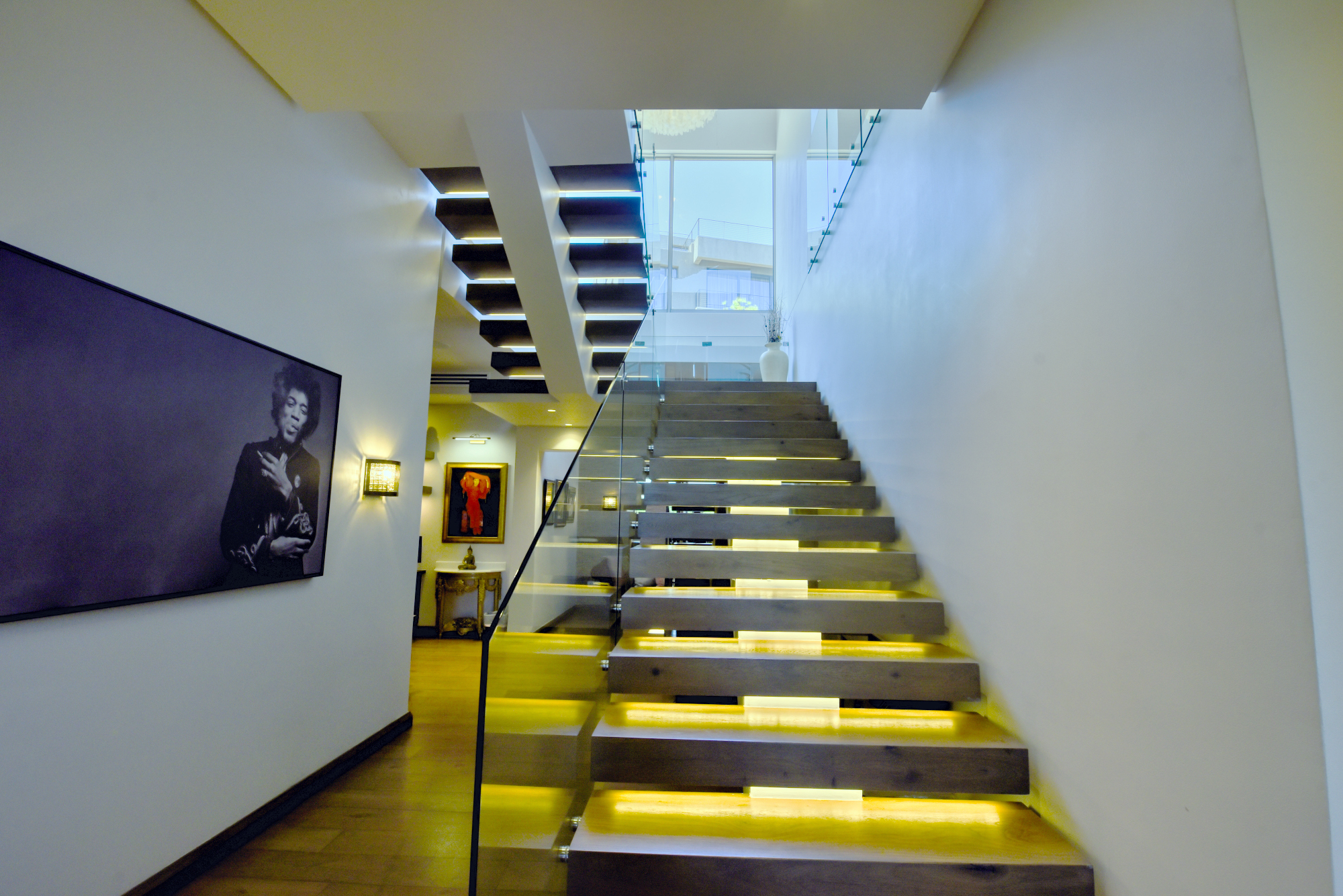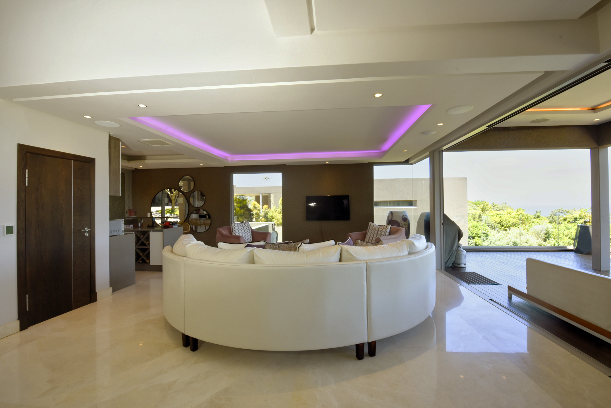 The Creston Home Automation system encompasses automated curtains, intercom, individual room climate control, smart TVs, sound and lighting, as well as outdoor security cameras. Operated via smart phone or touch panels located in each room of the house.