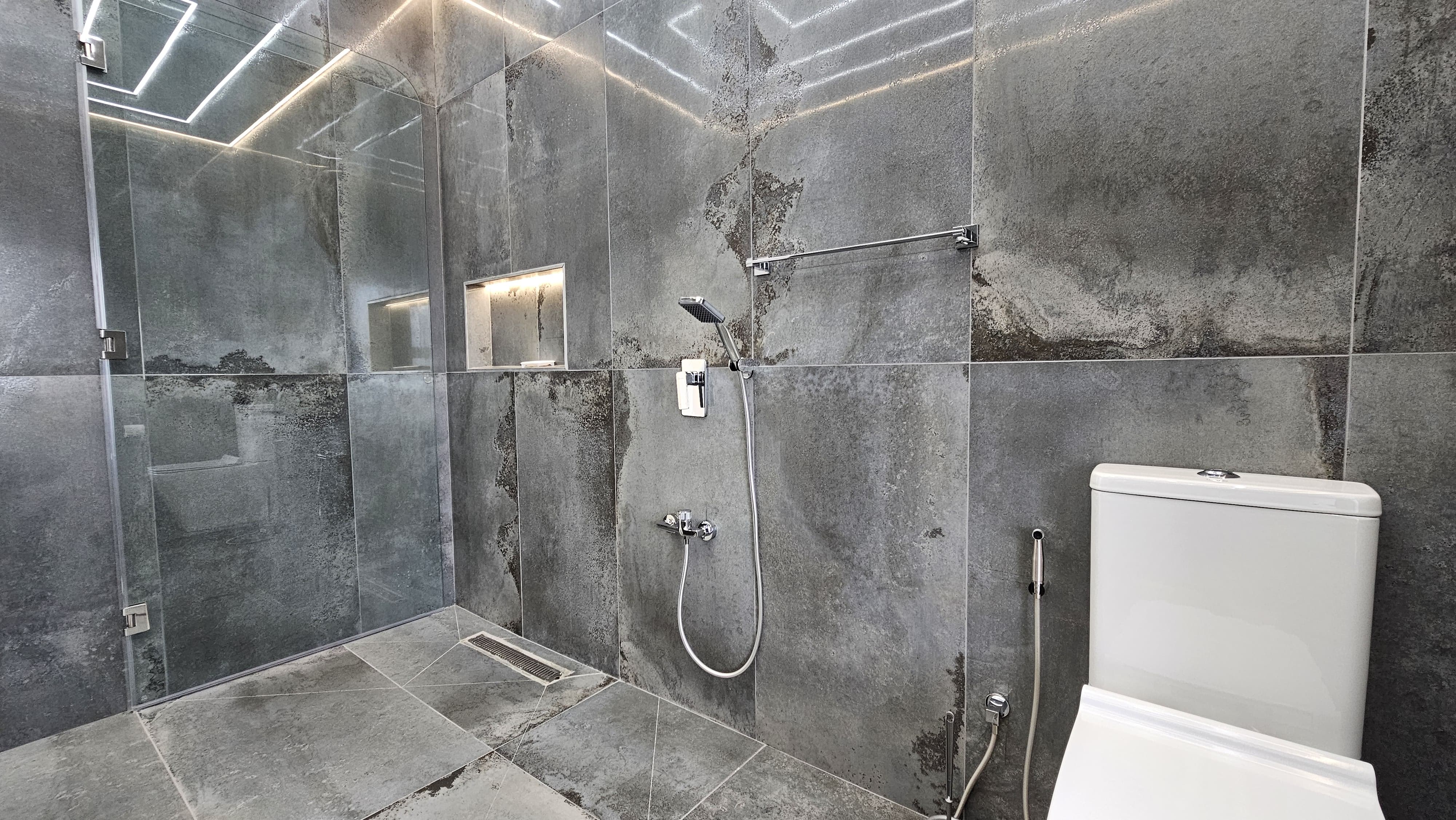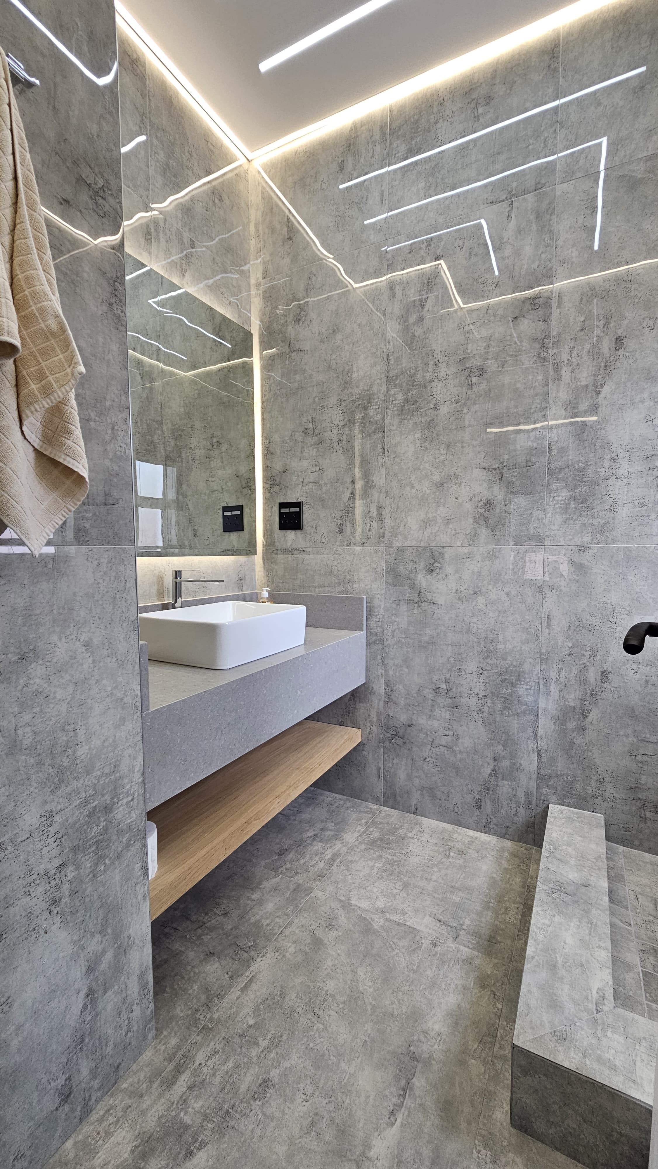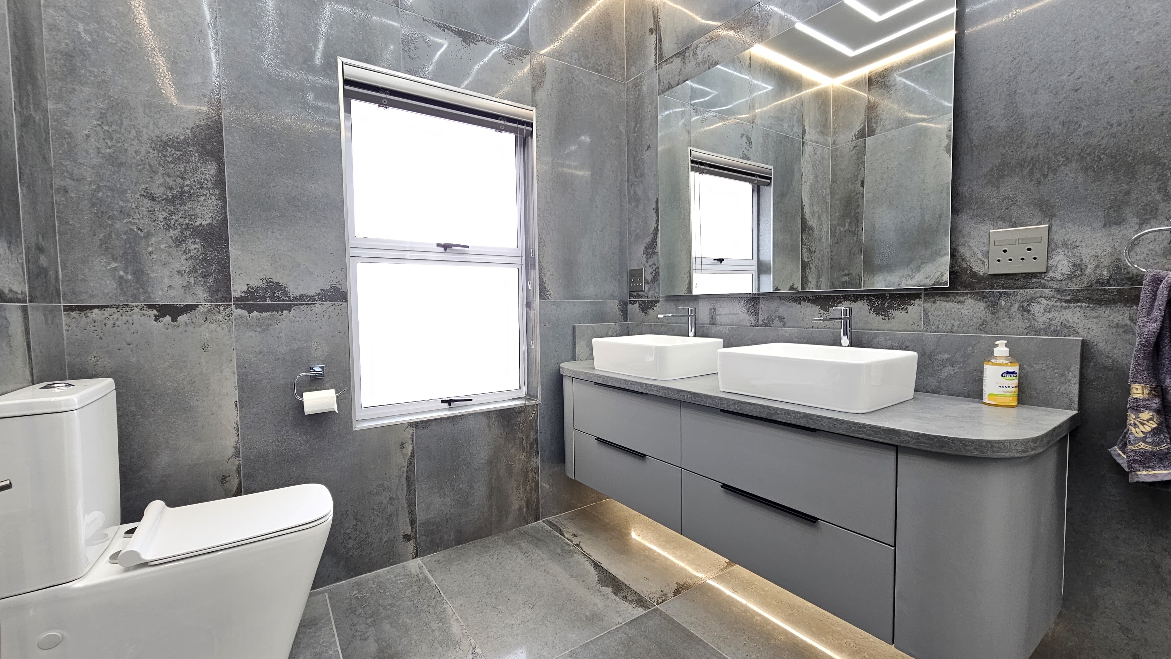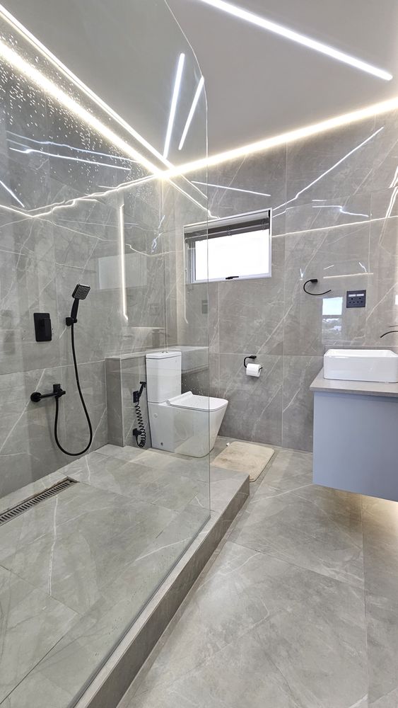 All four bathrooms upgraded with new plumbing, smart lighting, and designer finishes. Main bathroom features Italian designer tiles, custom vanity with stone counters, and ambient lighting.