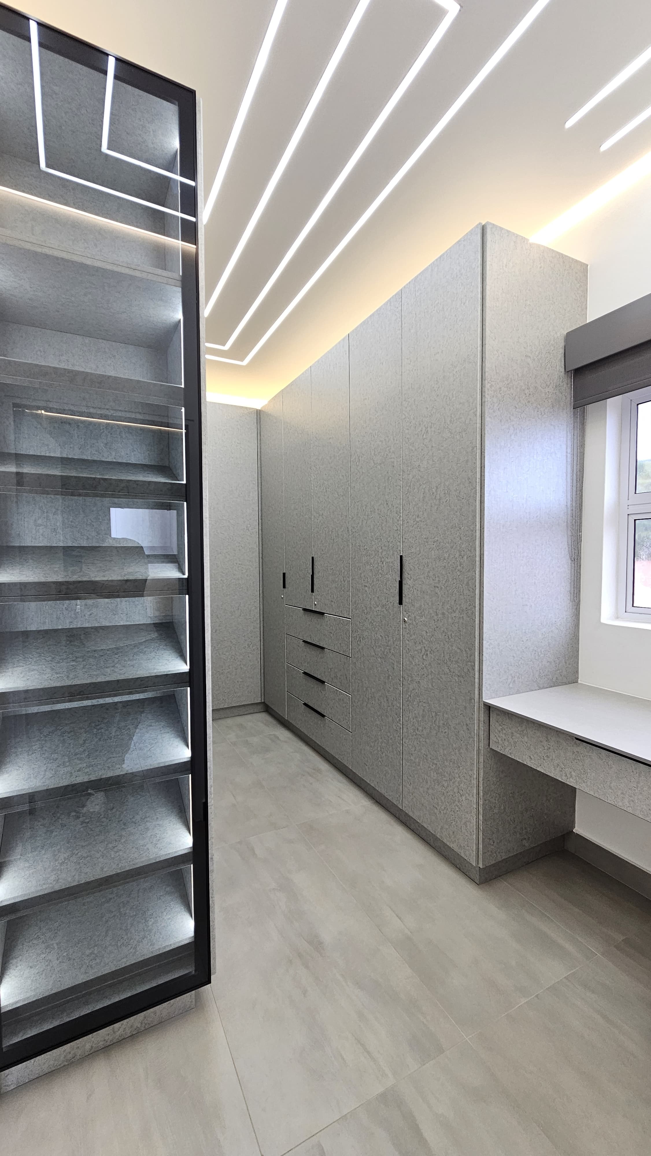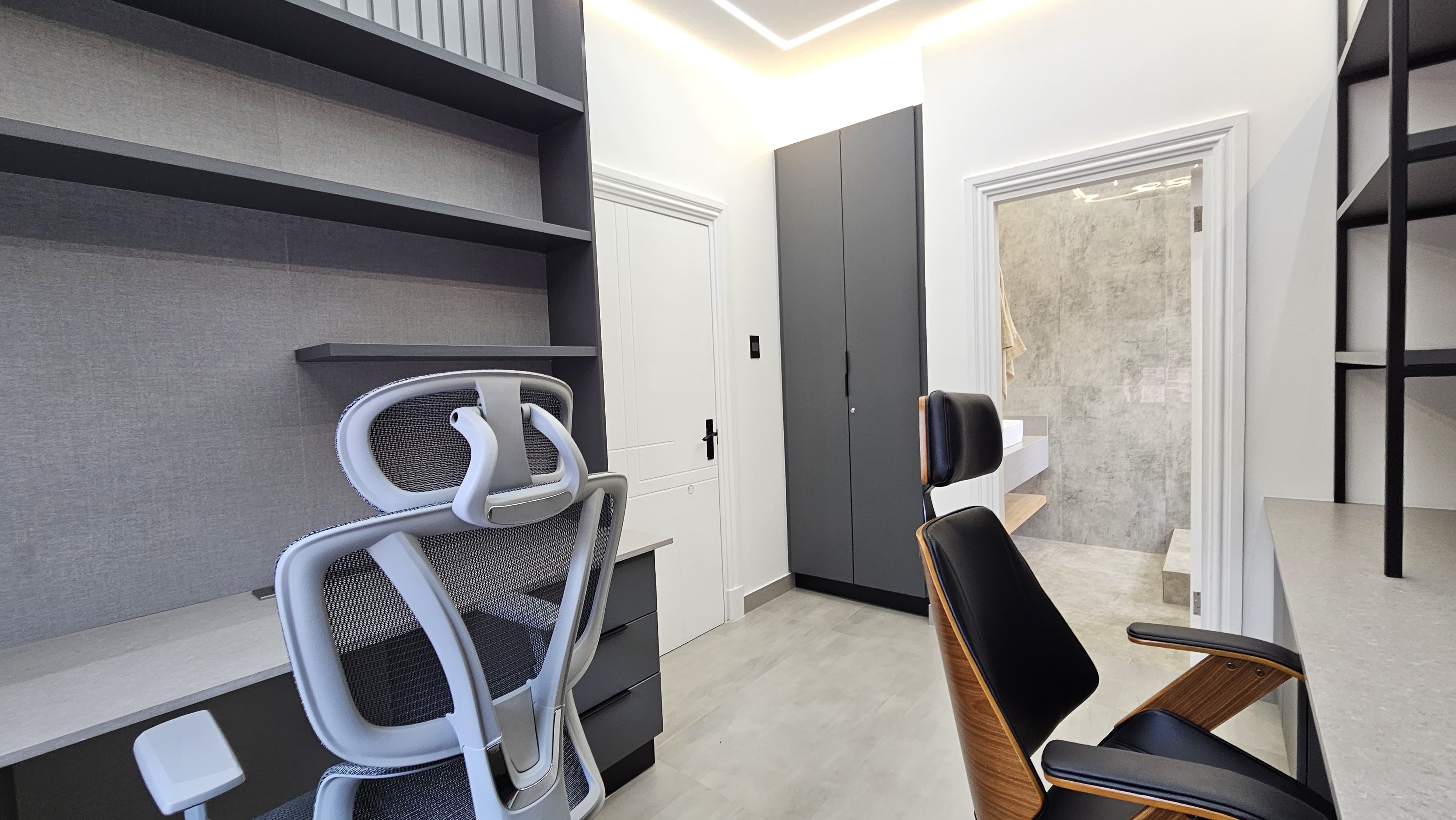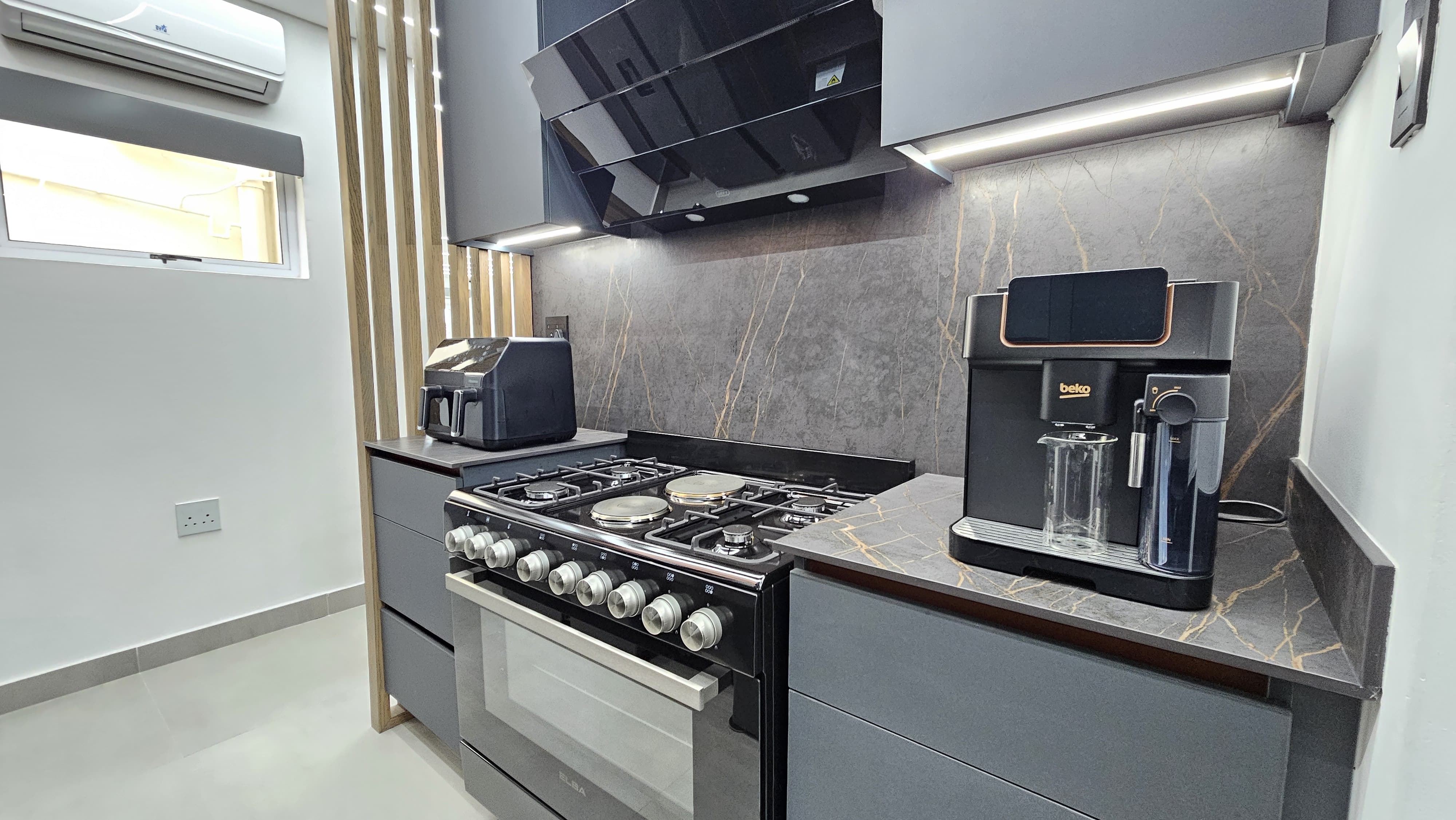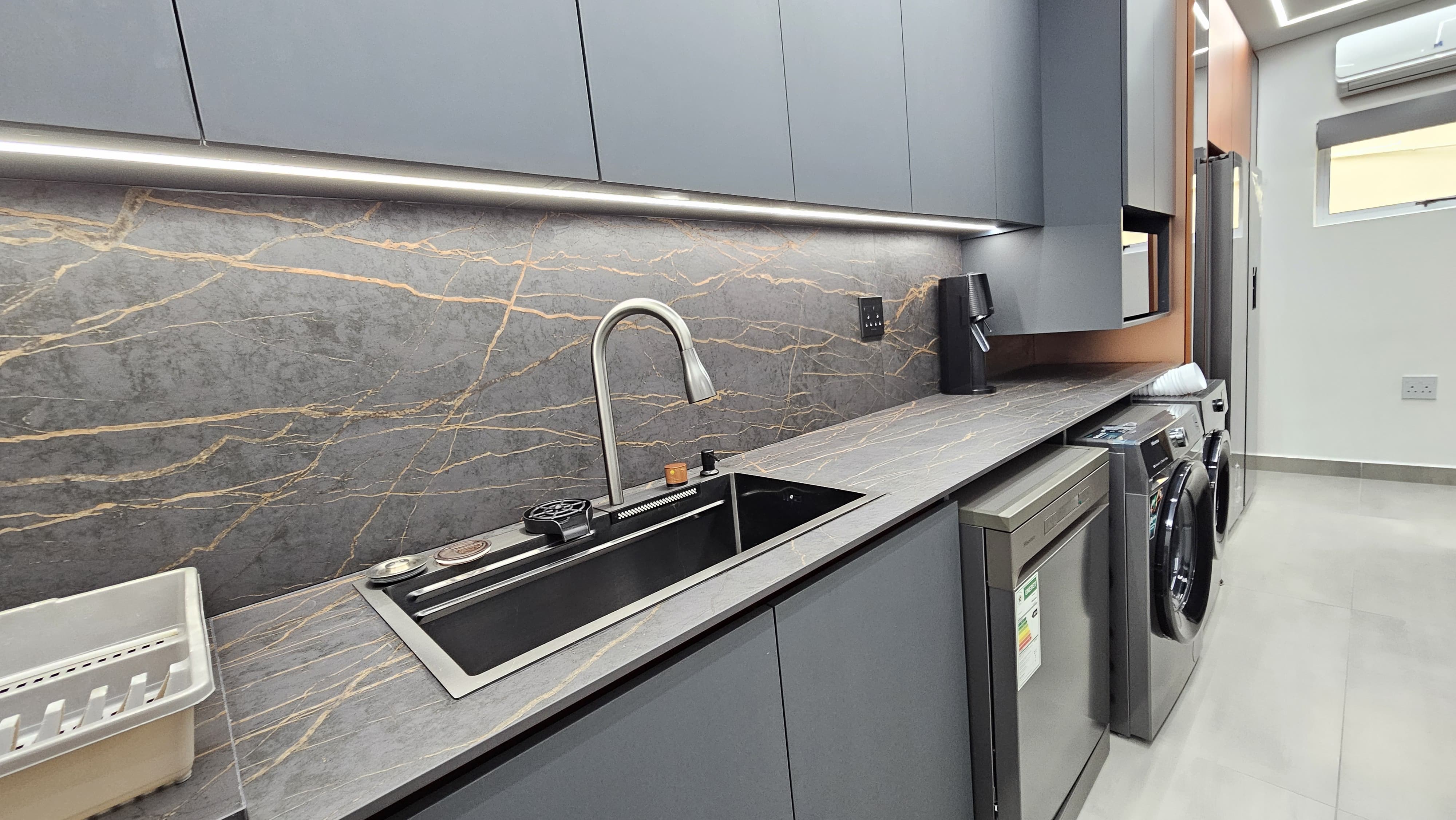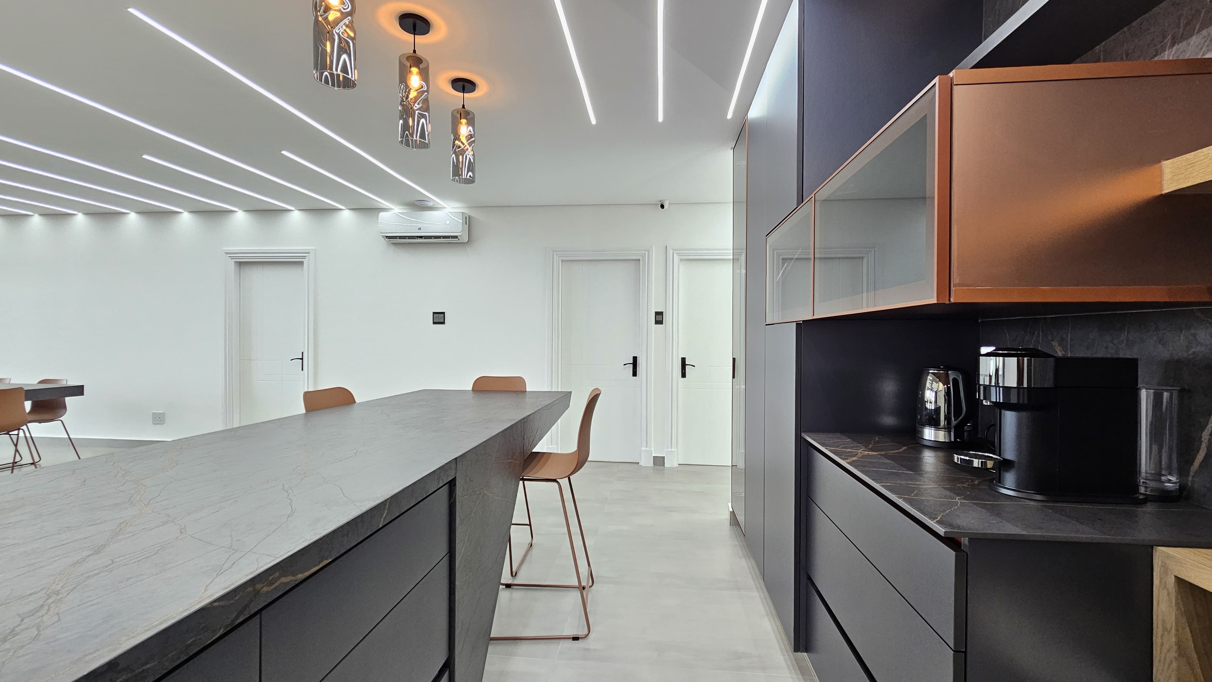 LAN ports in the study and TV points for fast, reliable internet. Study with stone countertops and multiple plug points – perfect for remote work or creative projects.