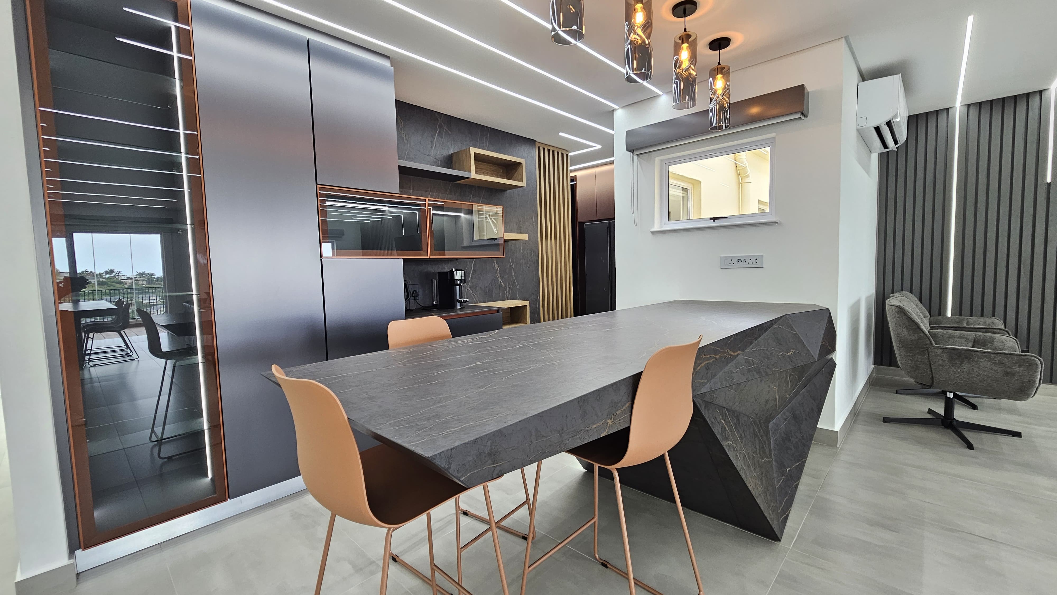 Stunning custom kitchen with cantilevered geometric stone island. Dekton porcelain countertops, wall cladding, and full-height backsplashes. Metallic and matte finishes with oak veneer display shelves and privacy screens. Smoked glass display cabinets with integrated lighting.