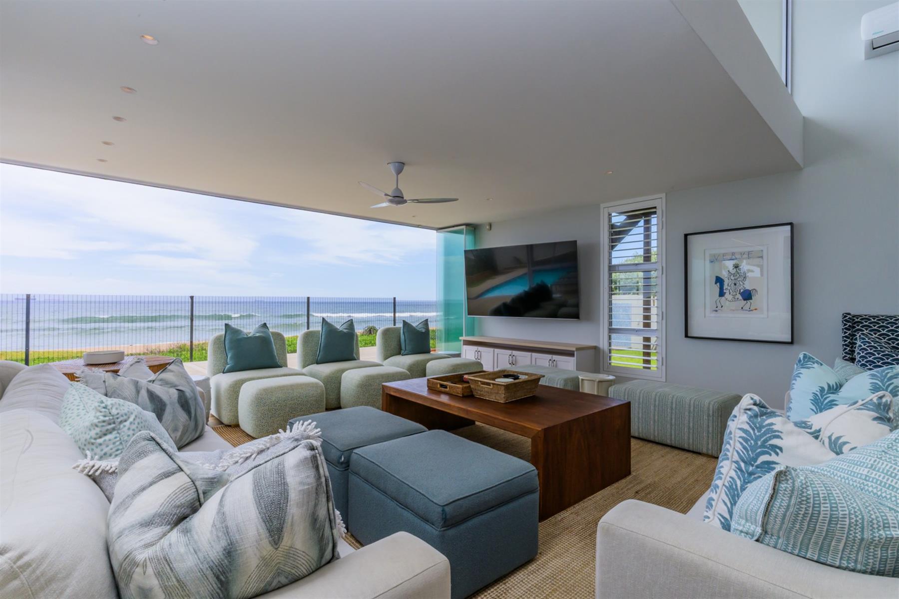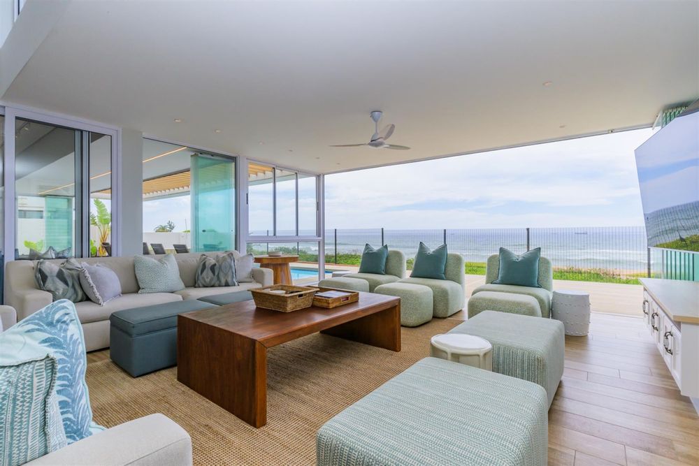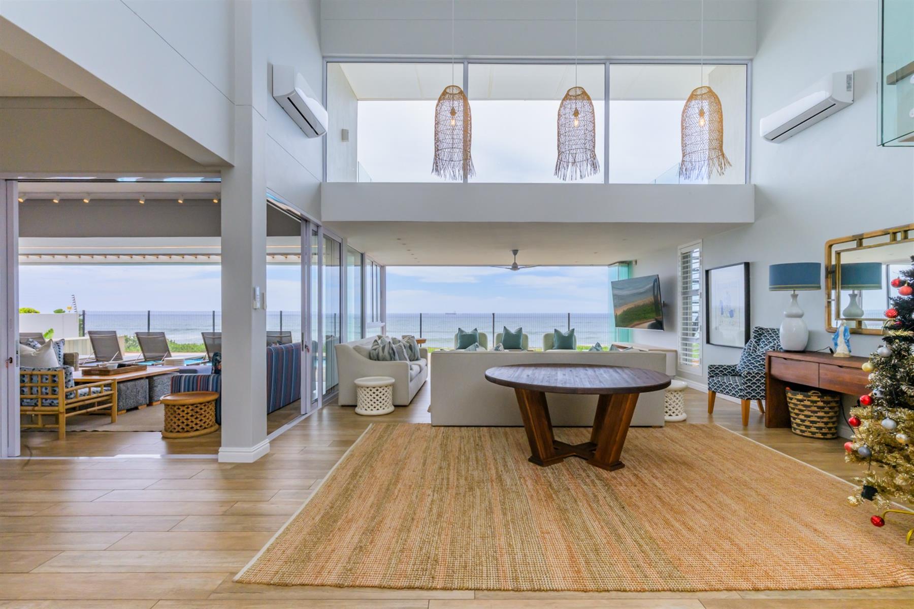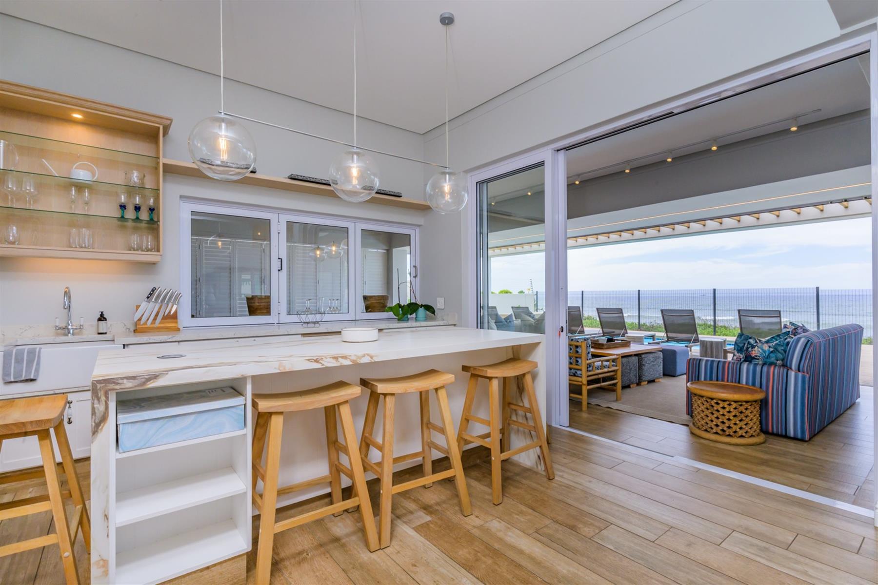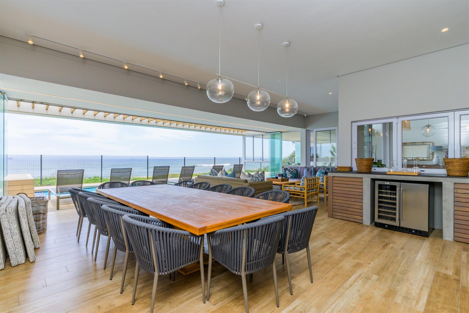 Custom glass stacking doors transform the living area into an extraordinary indoor–outdoor sanctuary. The entertainment pavilion—complete with a built-in braai, integrated fridges, and an elegant 14-seater dining table—creates the perfect setting for unforgettable gatherings. A shimmering pool with a retractable cover is framed by luxurious loungers, offering uninterrupted views of the ocean beyond. A manicured green lawn meets the shoreline, secured by a discreet see-through fence, while an outdoor shower provides a tranquil transition from beach to home.