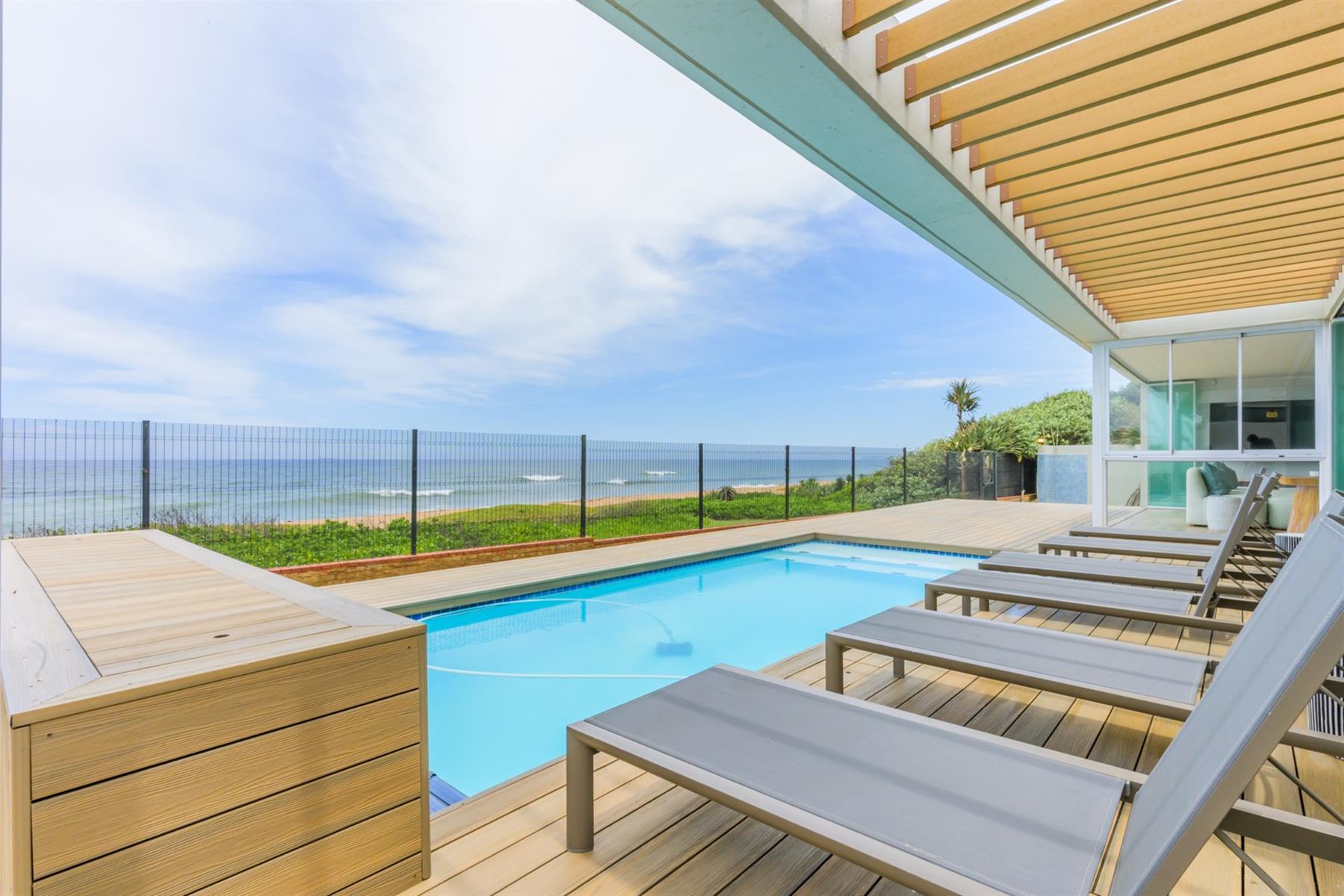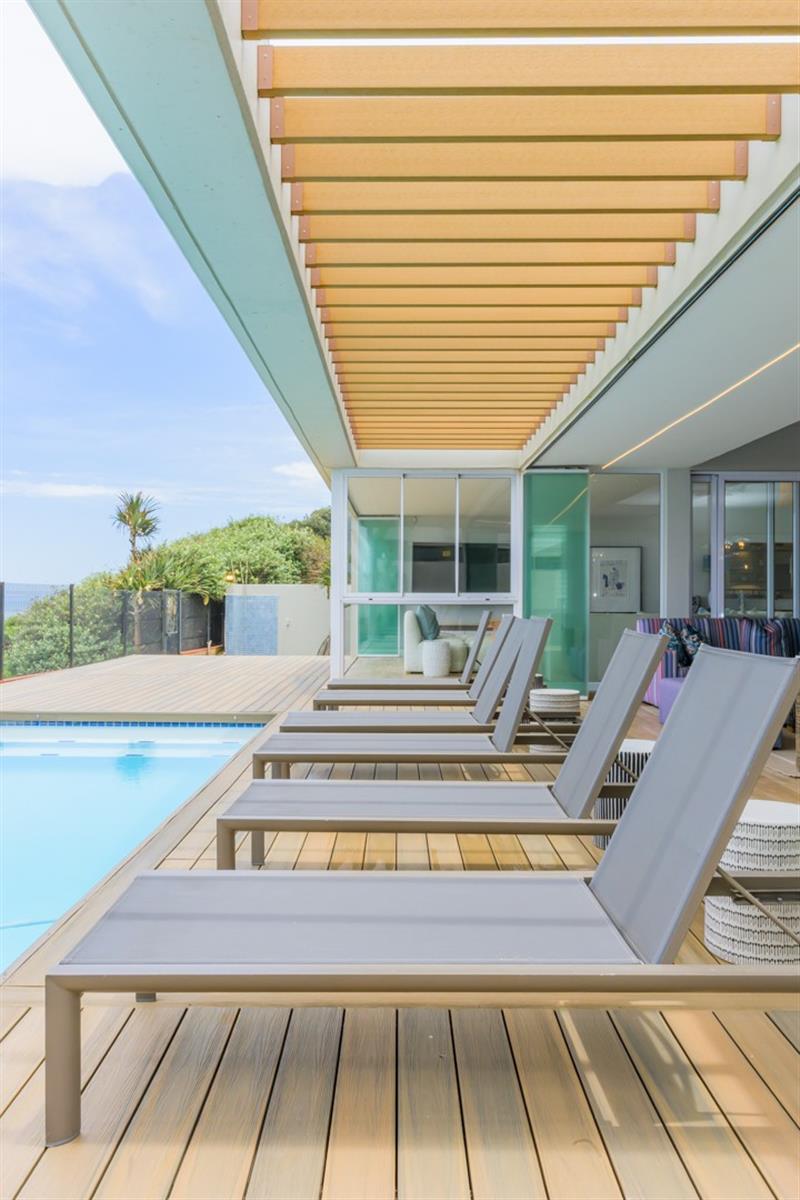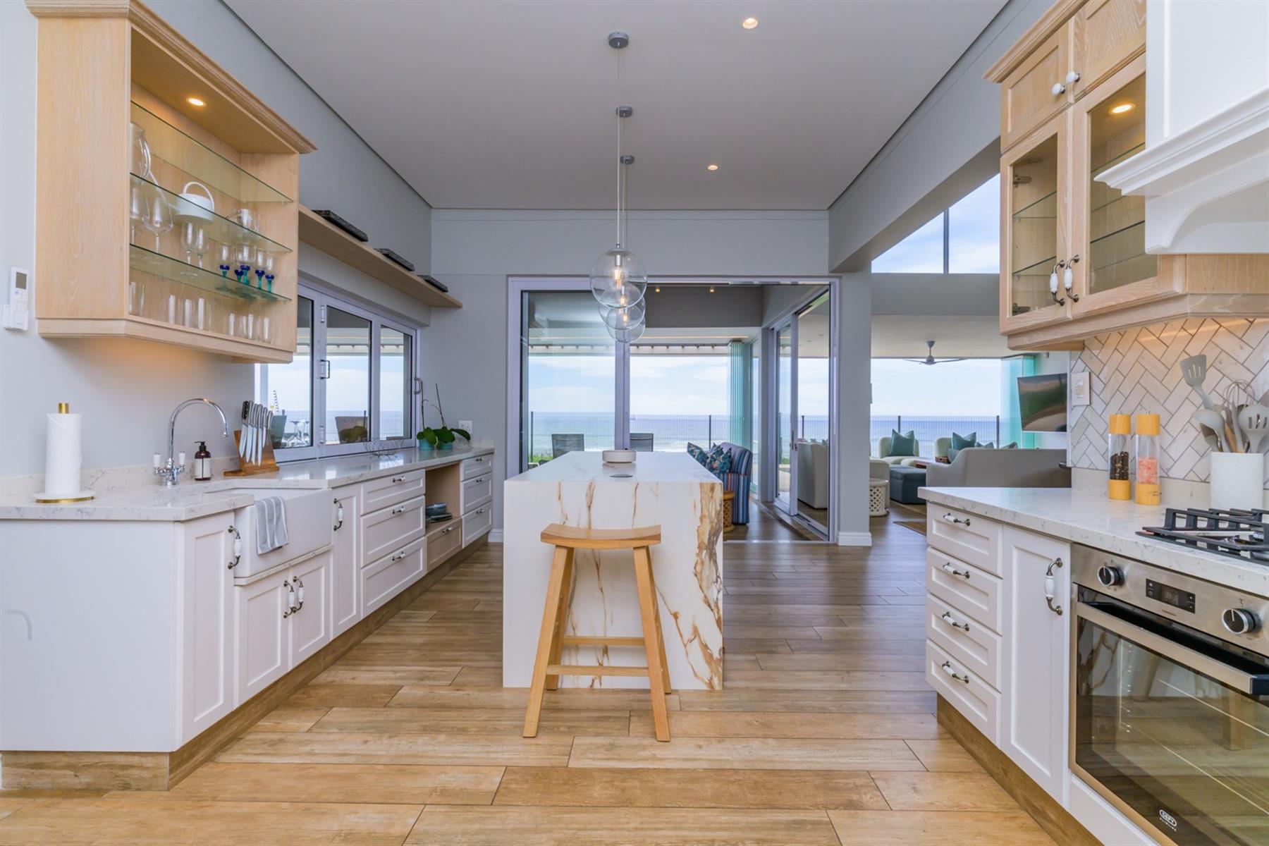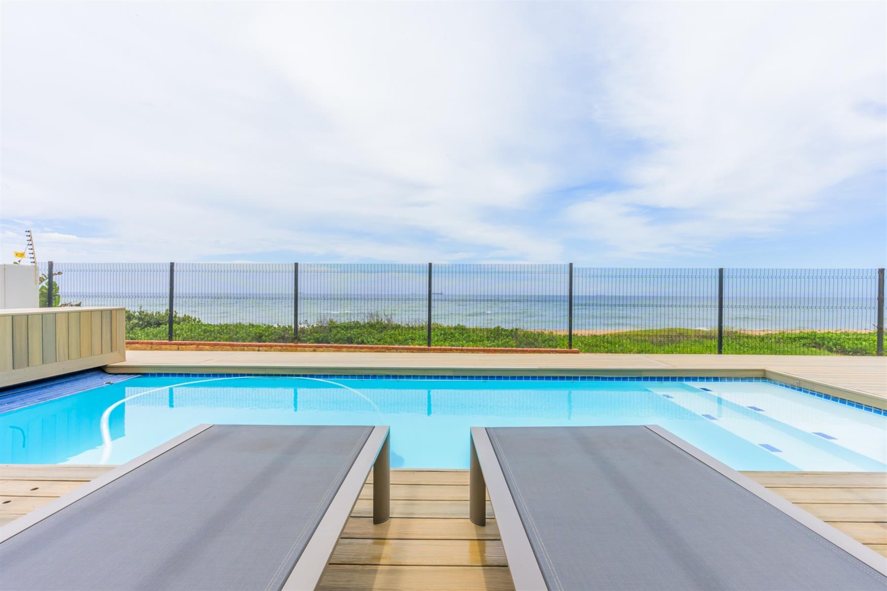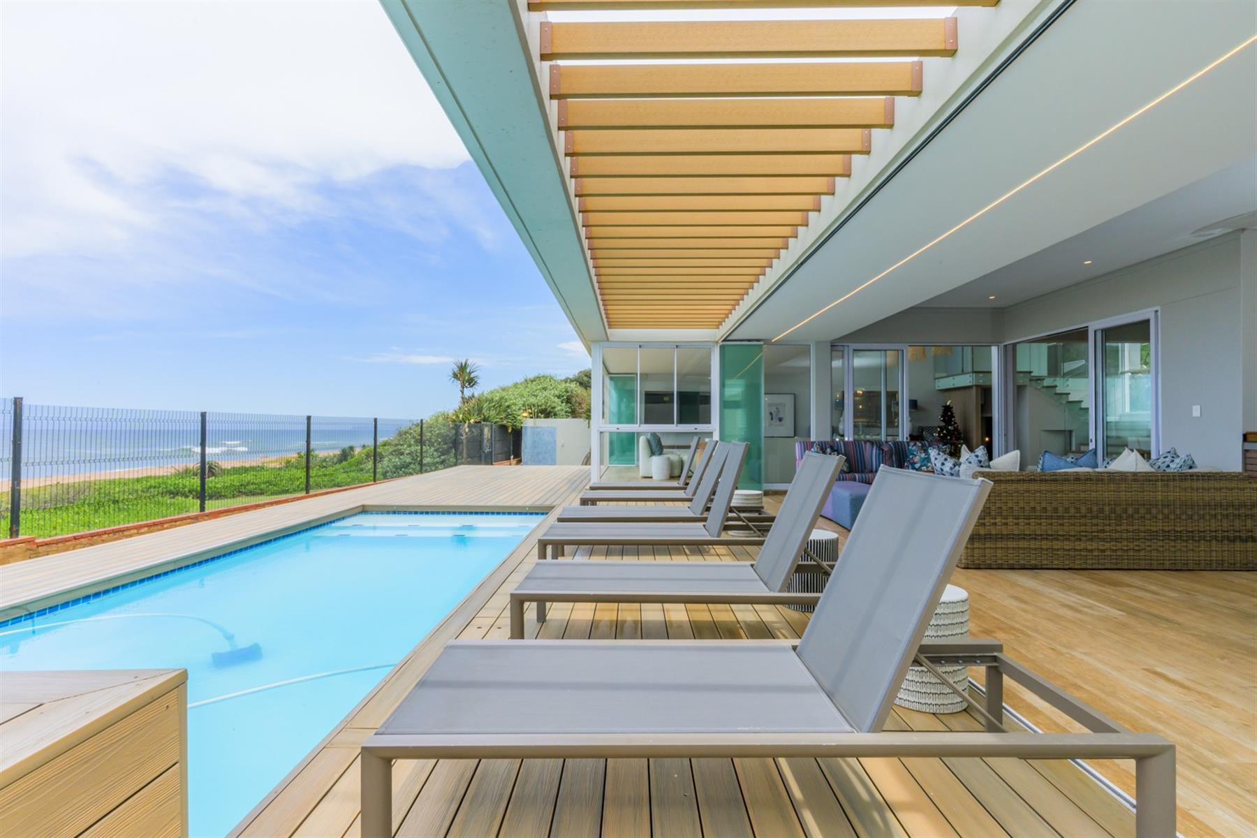 Custom glass stacking doors transform the living area into an extraordinary indoor–outdoor sanctuary. The entertainment pavilion—complete with a built-in braai, integrated fridges, and an elegant 14-seater dining table—creates the perfect setting for unforgettable gatherings. A shimmering pool with a retractable cover is framed by luxurious loungers, offering uninterrupted views of the ocean beyond. A manicured green lawn meets the shoreline, secured by a discreet see-through fence, while an outdoor shower provides a tranquil transition from beach to home.