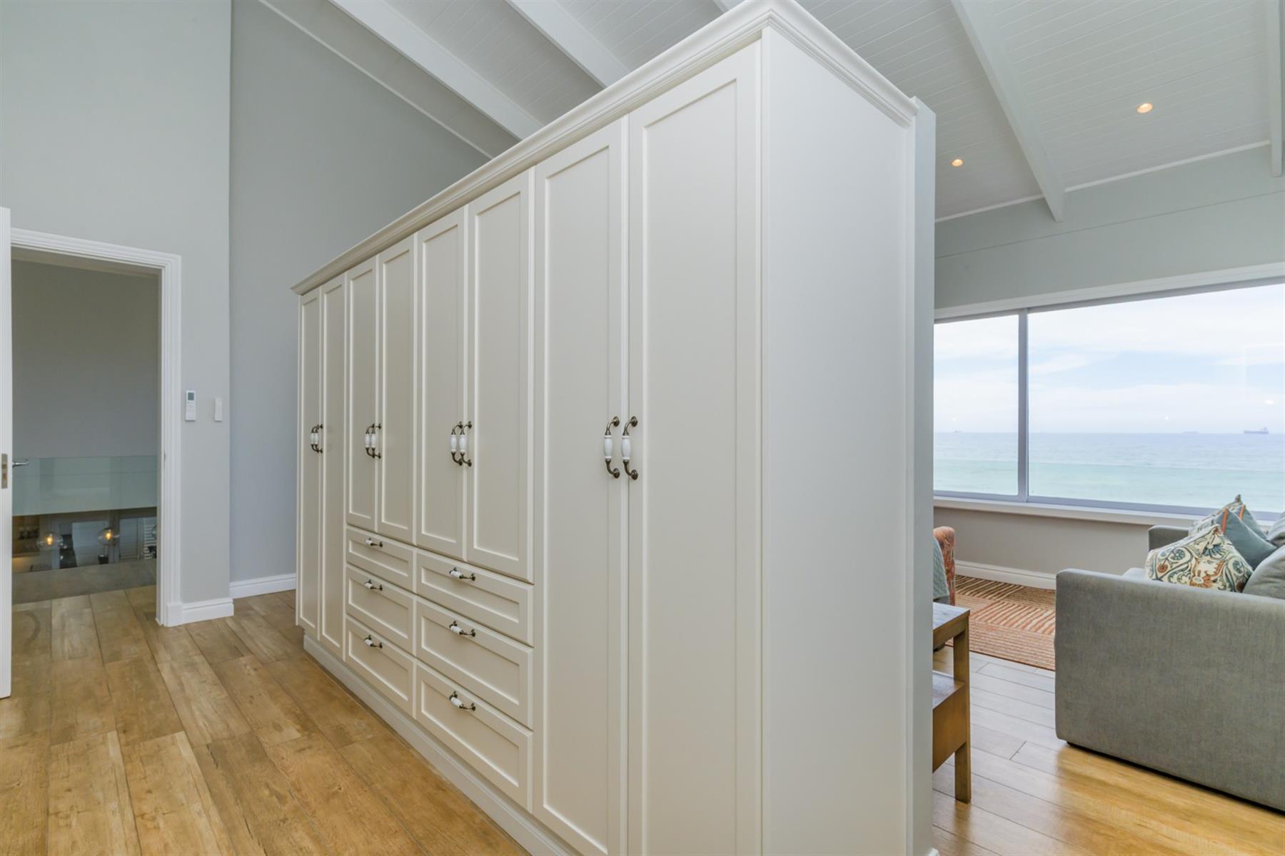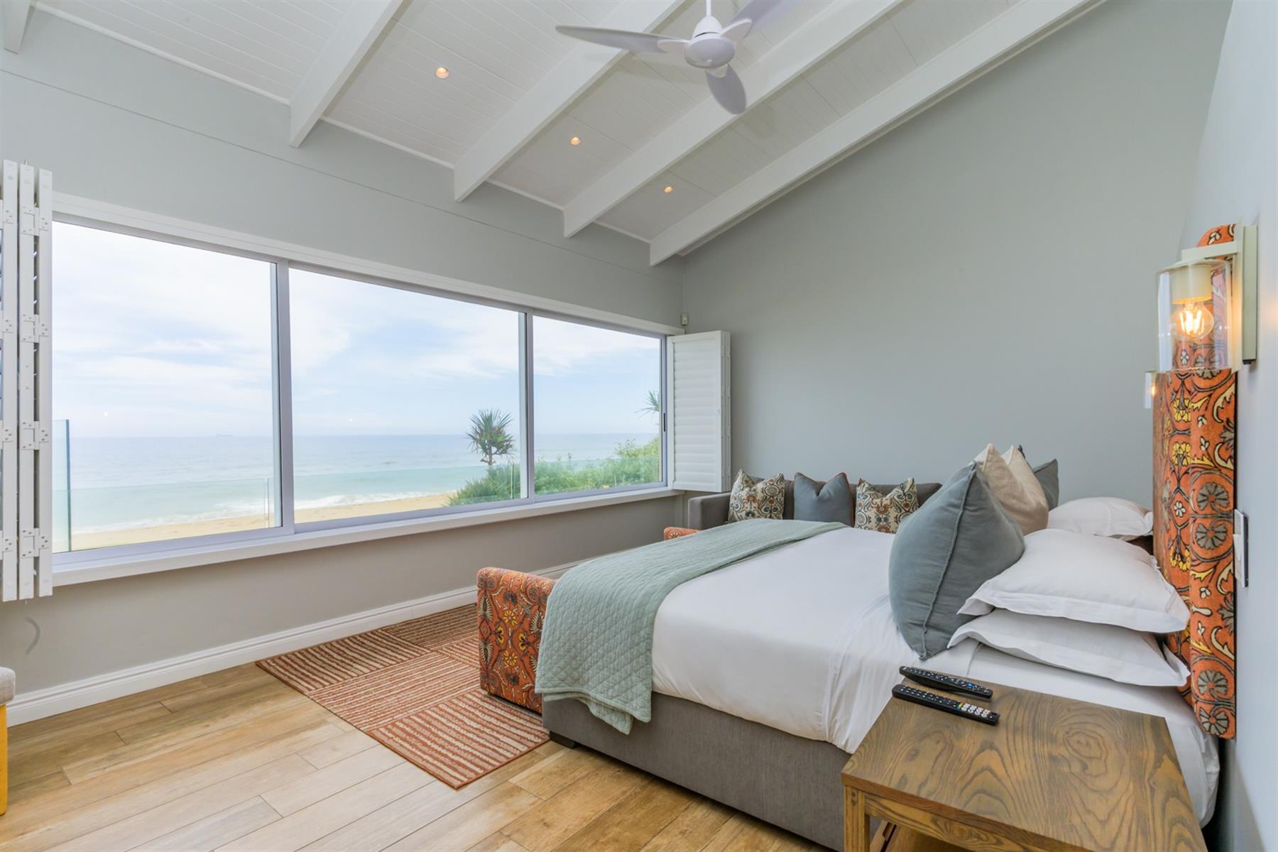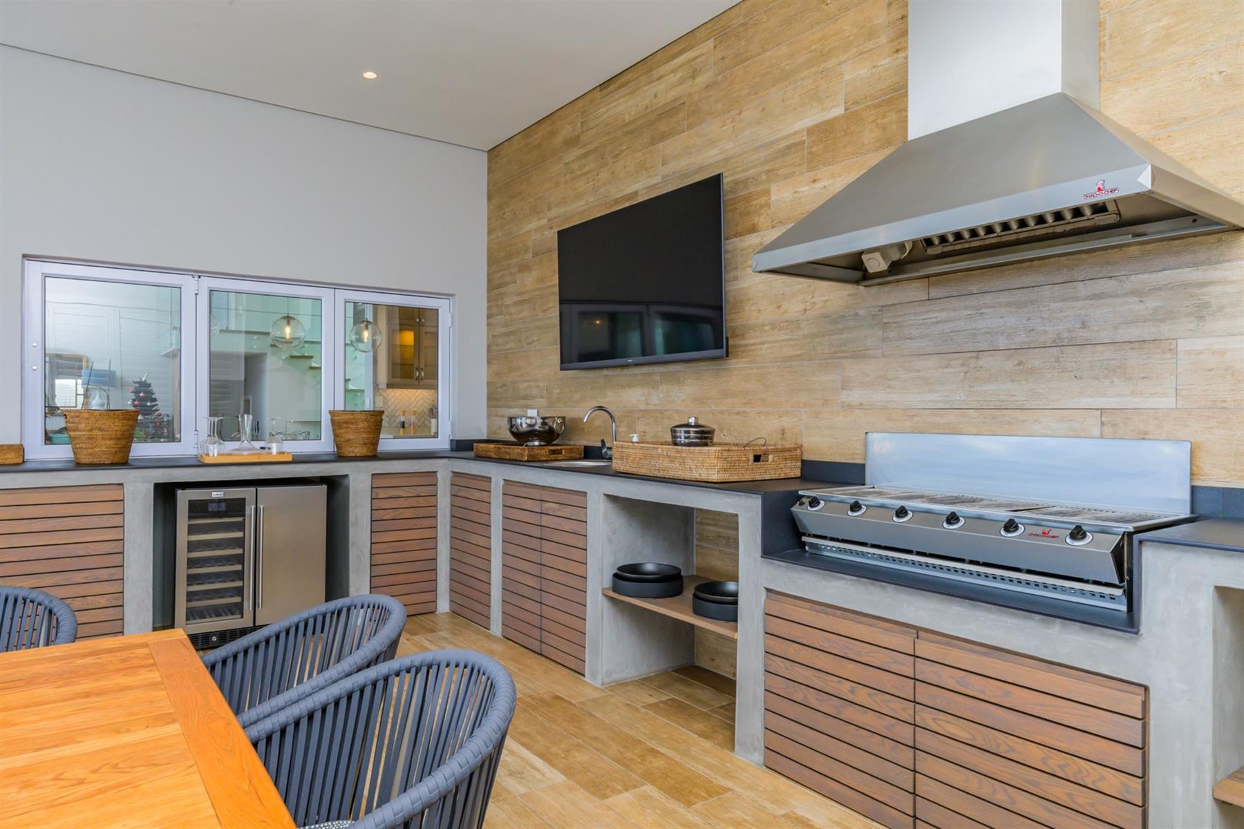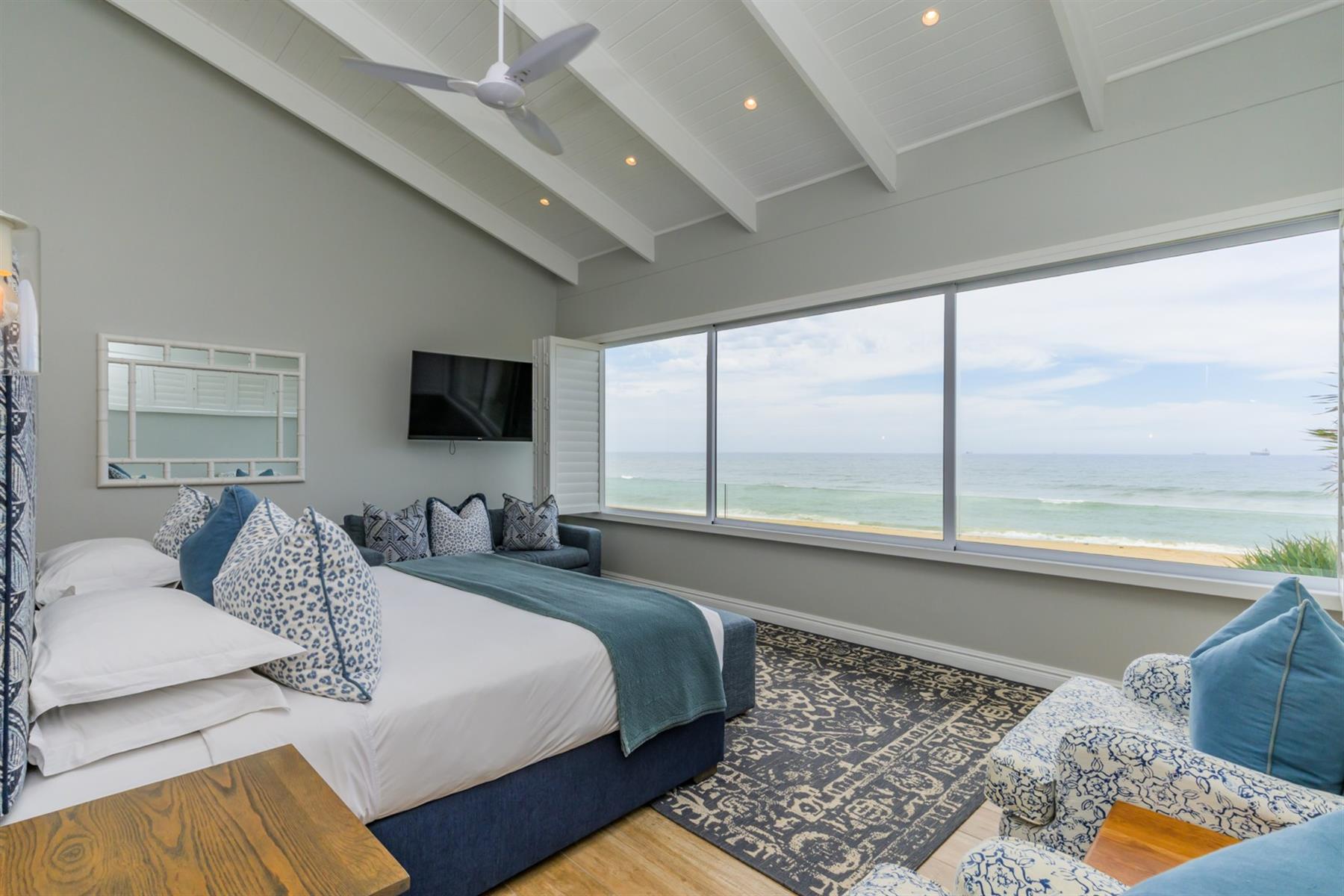 Custom glass stacking doors transform the living area into an extraordinary indoor–outdoor sanctuary. The entertainment pavilion—complete with a built-in braai, integrated fridges, and an elegant 14-seater dining table—creates the perfect setting for unforgettable gatherings. A shimmering pool with a retractable cover is framed by luxurious loungers, offering uninterrupted views of the ocean beyond. A manicured green lawn meets the shoreline, secured by a discreet see-through fence, while an outdoor shower provides a tranquil transition from beach to home.