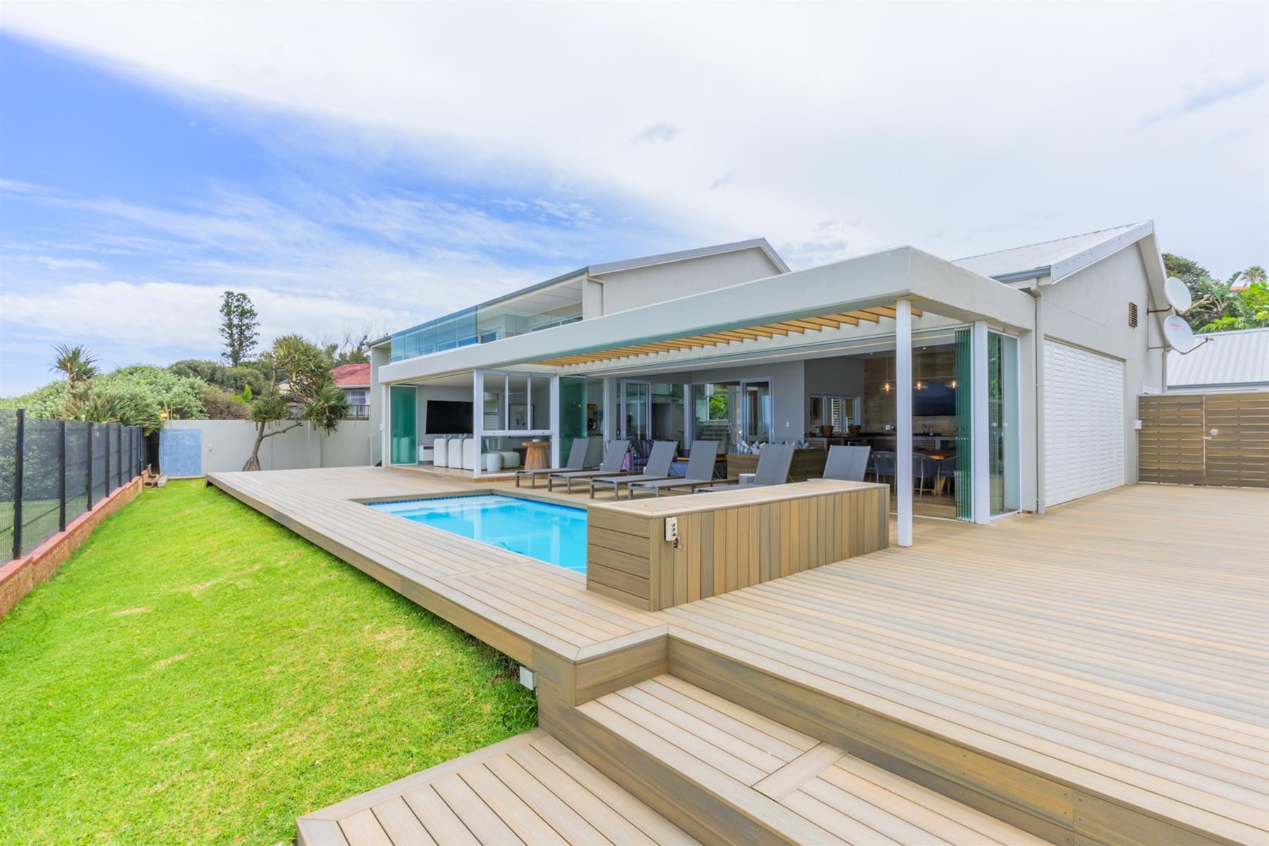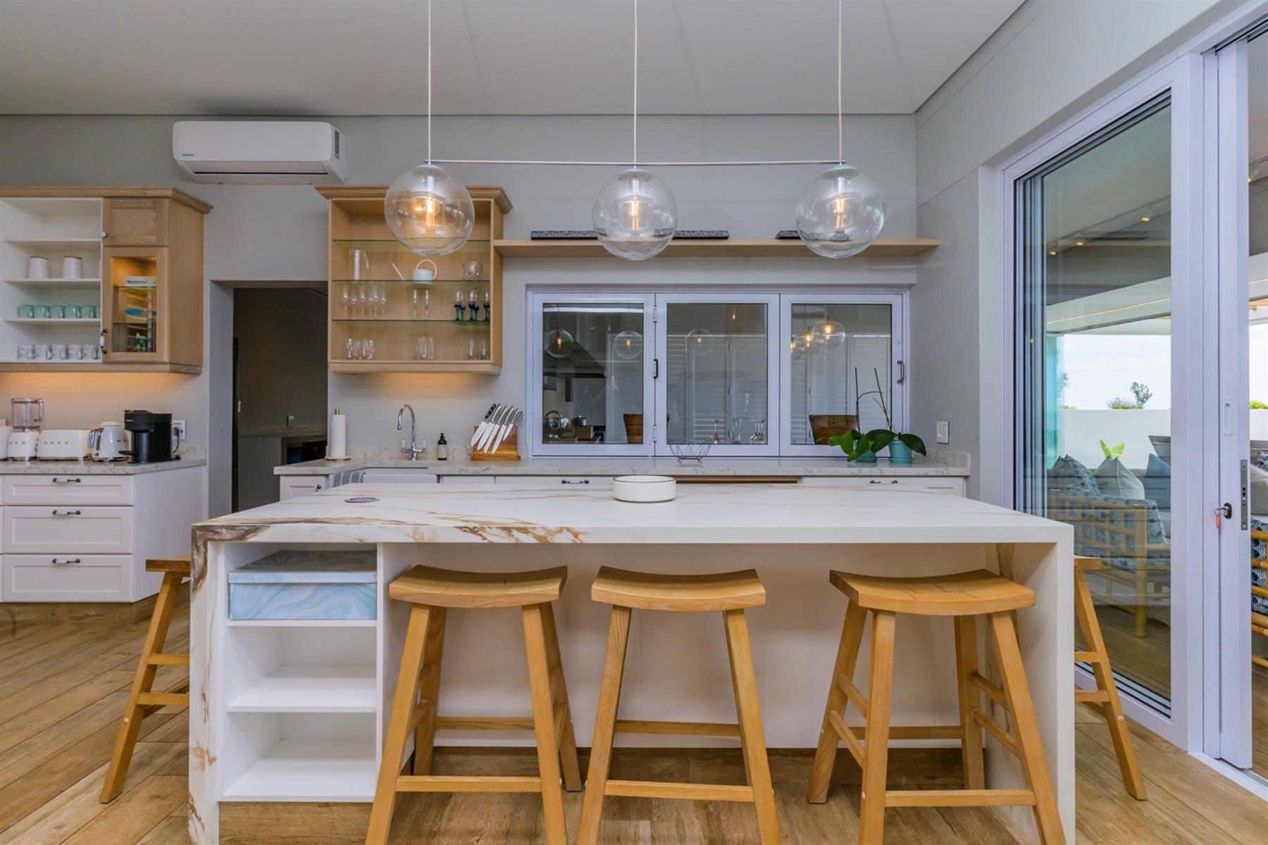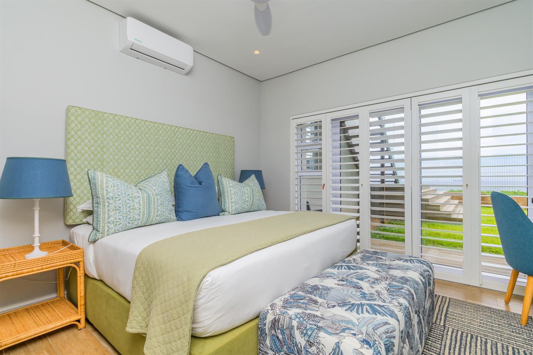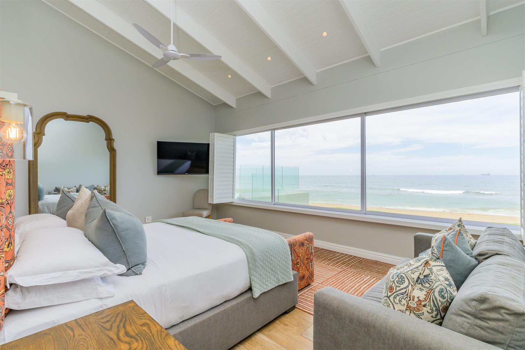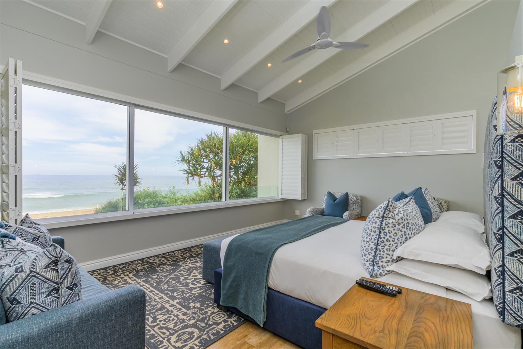 Custom glass stacking doors transform the living area into an extraordinary indoor–outdoor sanctuary. The entertainment pavilion—complete with a built-in braai, integrated fridges, and an elegant 14-seater dining table—creates the perfect setting for unforgettable gatherings. A shimmering pool with a retractable cover is framed by luxurious loungers, offering uninterrupted views of the ocean beyond. A manicured green lawn meets the shoreline, secured by a discreet see-through fence, while an outdoor shower provides a tranquil transition from beach to home.