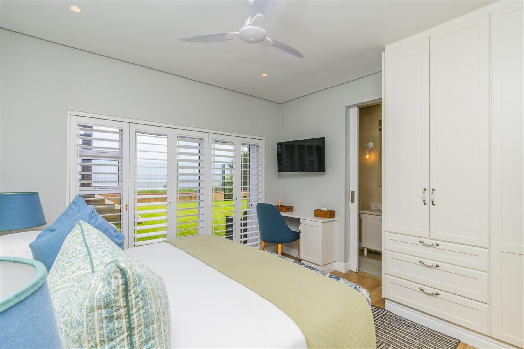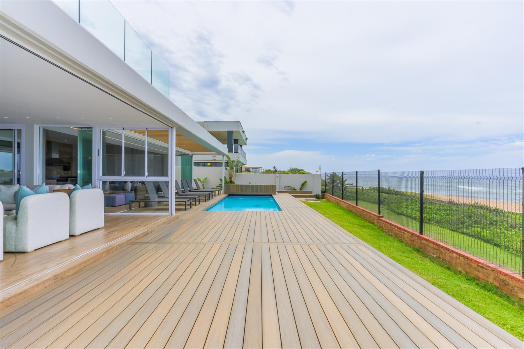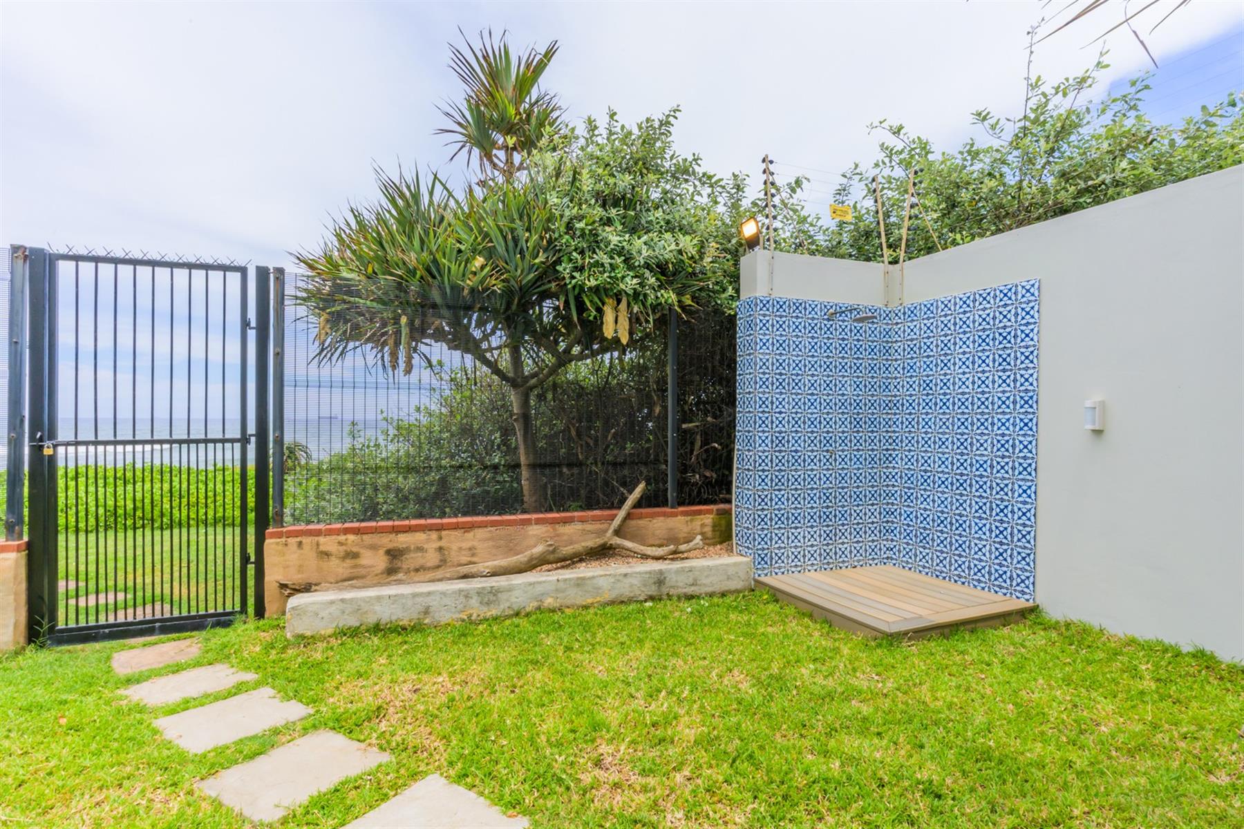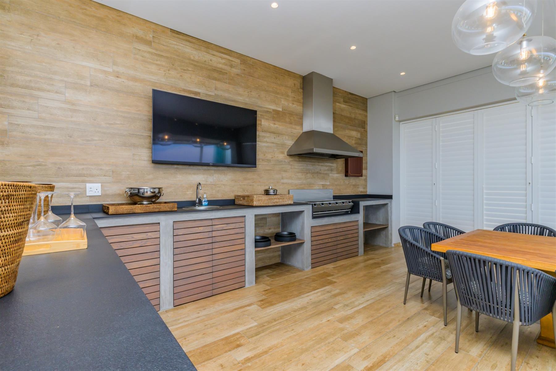 Custom glass stacking doors transform the living area into an extraordinary indoor–outdoor sanctuary. The entertainment pavilion—complete with a built-in braai, integrated fridges, and an elegant 14-seater dining table—creates the perfect setting for unforgettable gatherings. A shimmering pool with a retractable cover is framed by luxurious loungers, offering uninterrupted views of the ocean beyond. A manicured green lawn meets the shoreline, secured by a discreet see-through fence, while an outdoor shower provides a tranquil transition from beach to home.