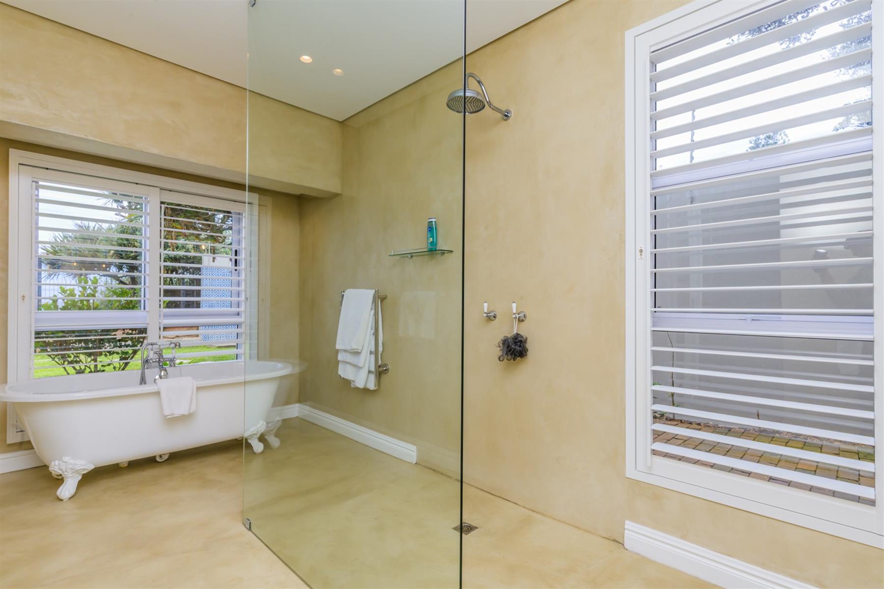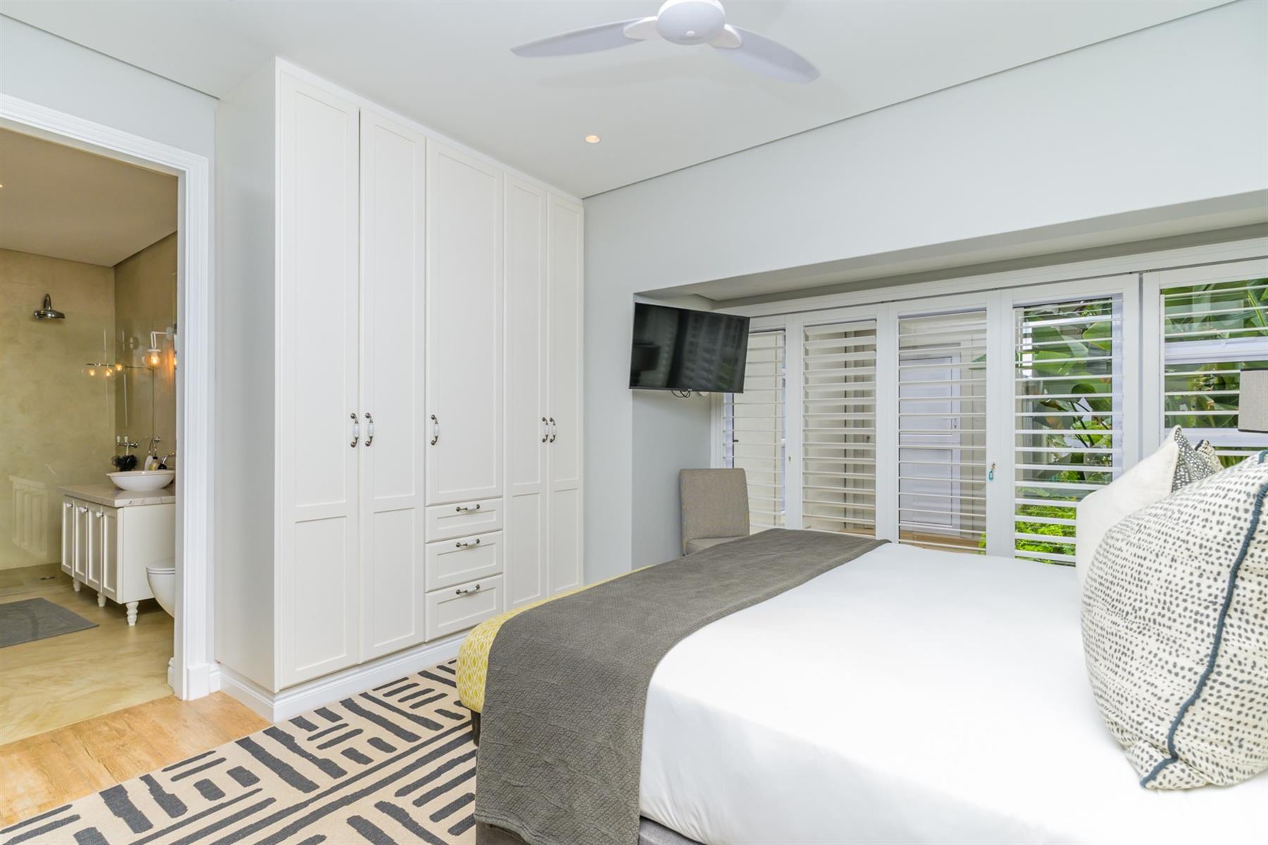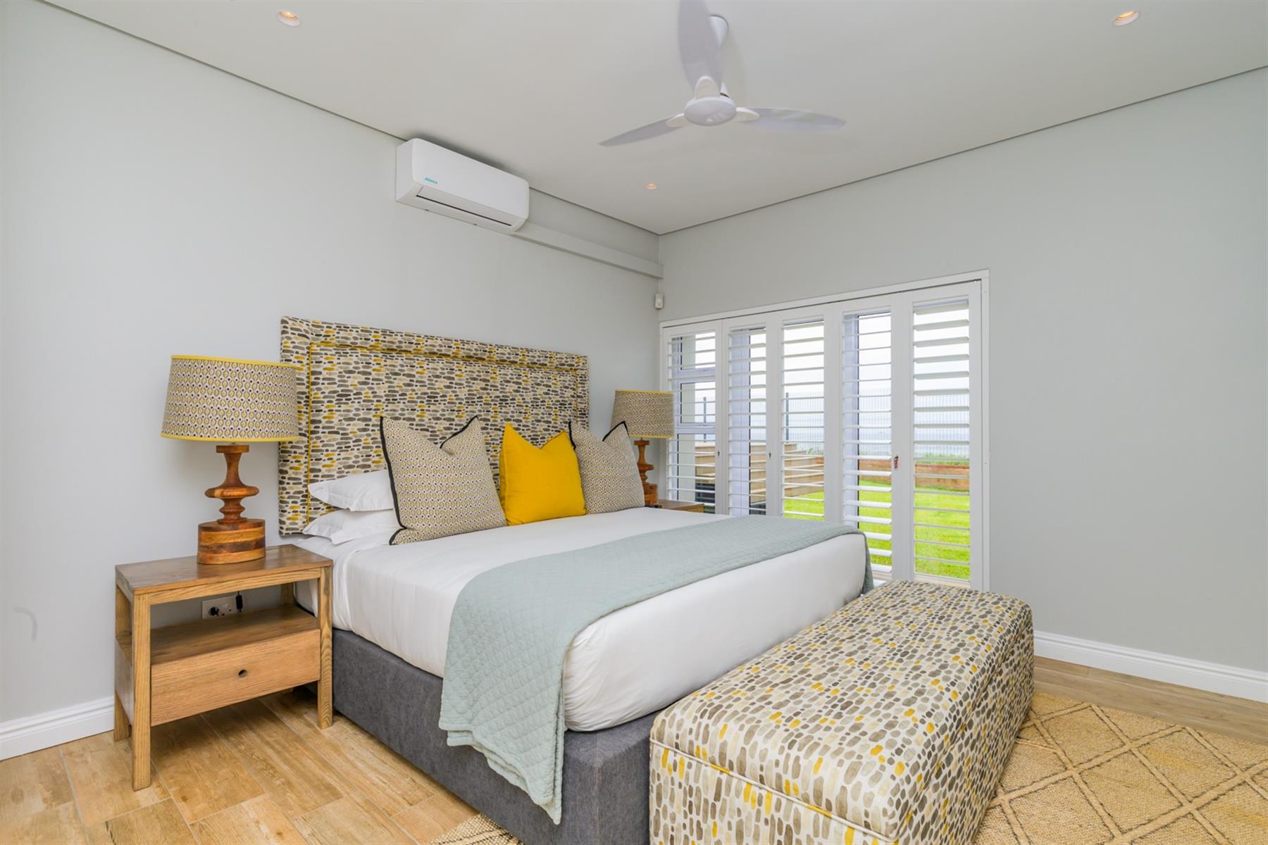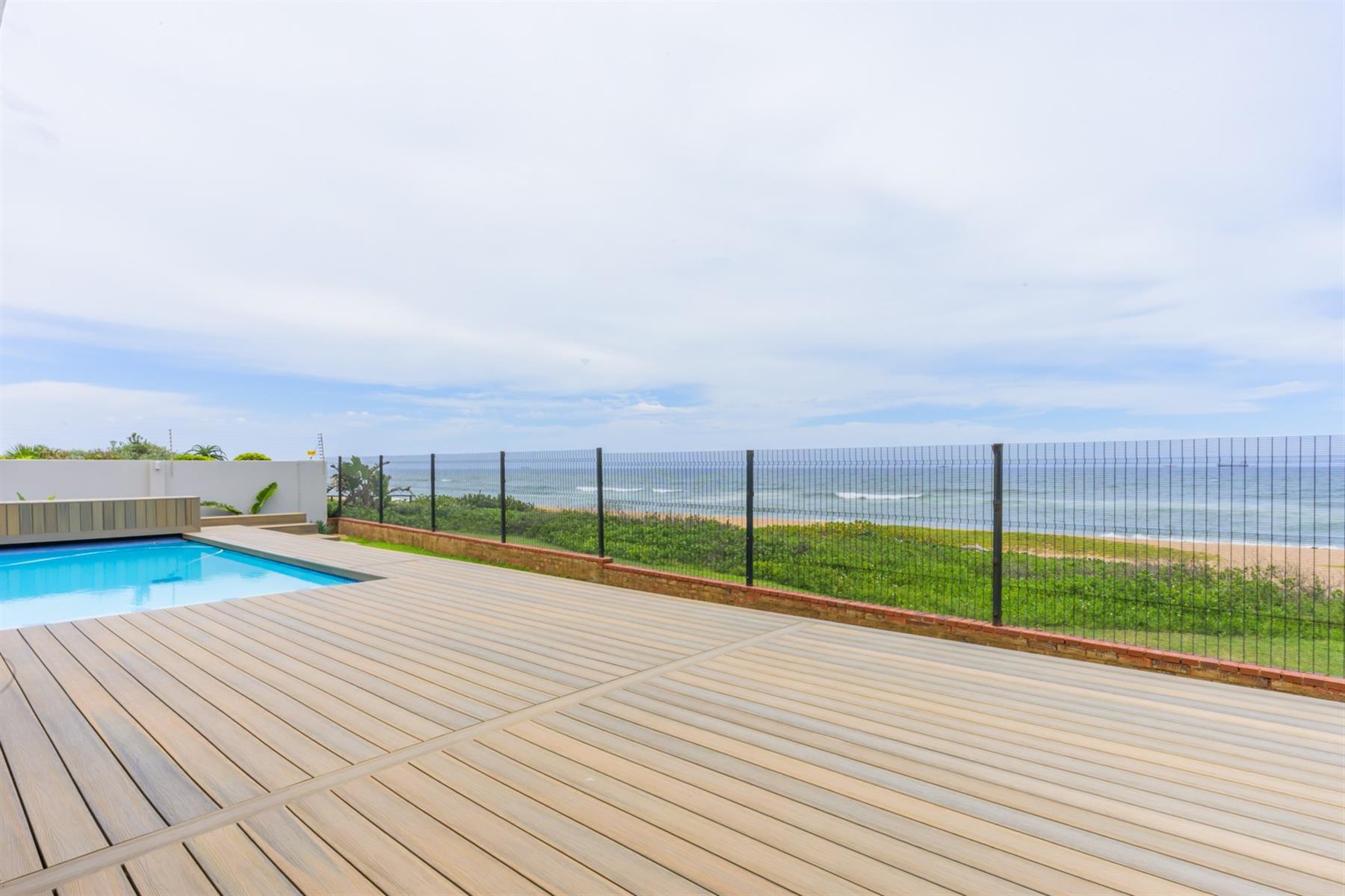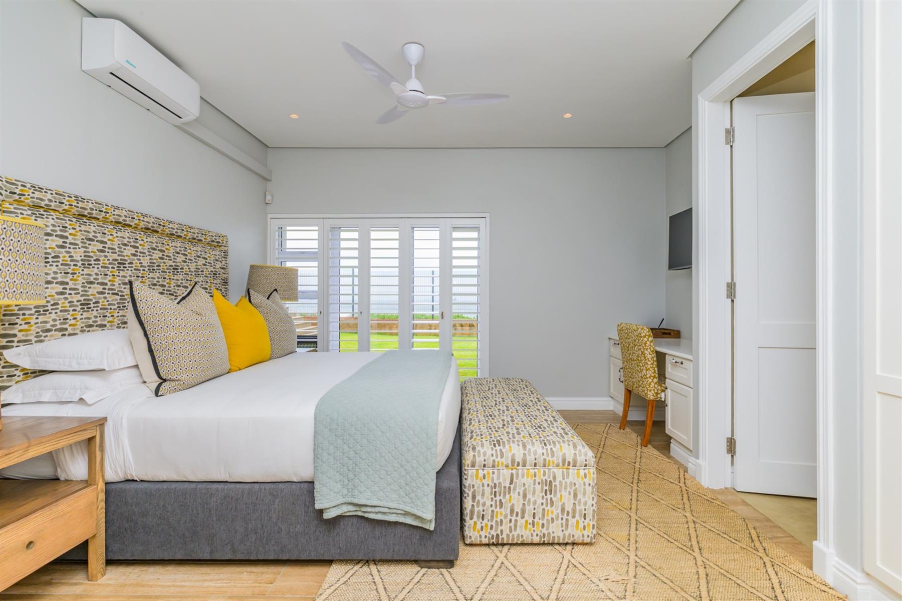 Custom glass stacking doors transform the living area into an extraordinary indoor–outdoor sanctuary. The entertainment pavilion—complete with a built-in braai, integrated fridges, and an elegant 14-seater dining table—creates the perfect setting for unforgettable gatherings. A shimmering pool with a retractable cover is framed by luxurious loungers, offering uninterrupted views of the ocean beyond. A manicured green lawn meets the shoreline, secured by a discreet see-through fence, while an outdoor shower provides a tranquil transition from beach to home.