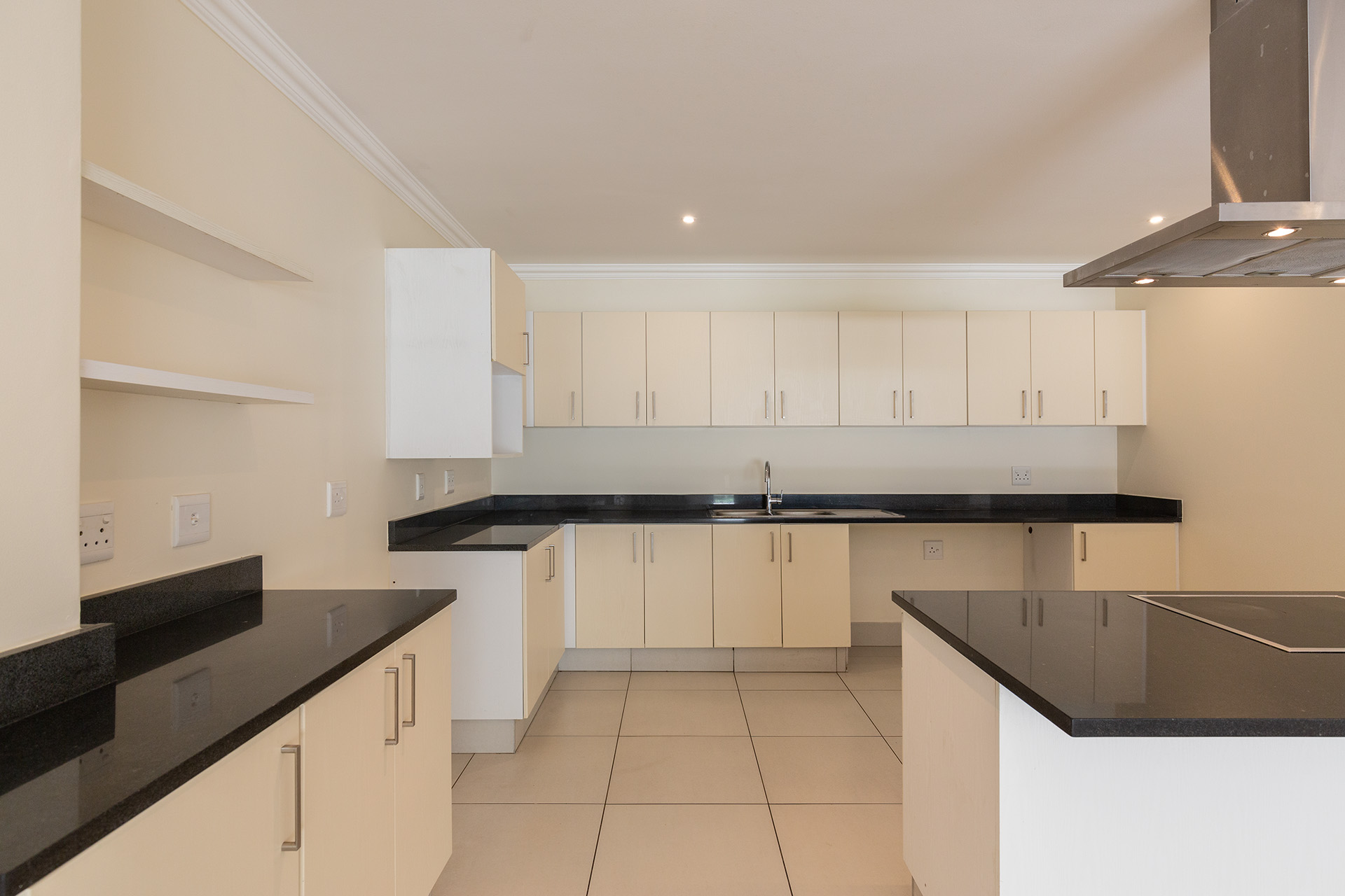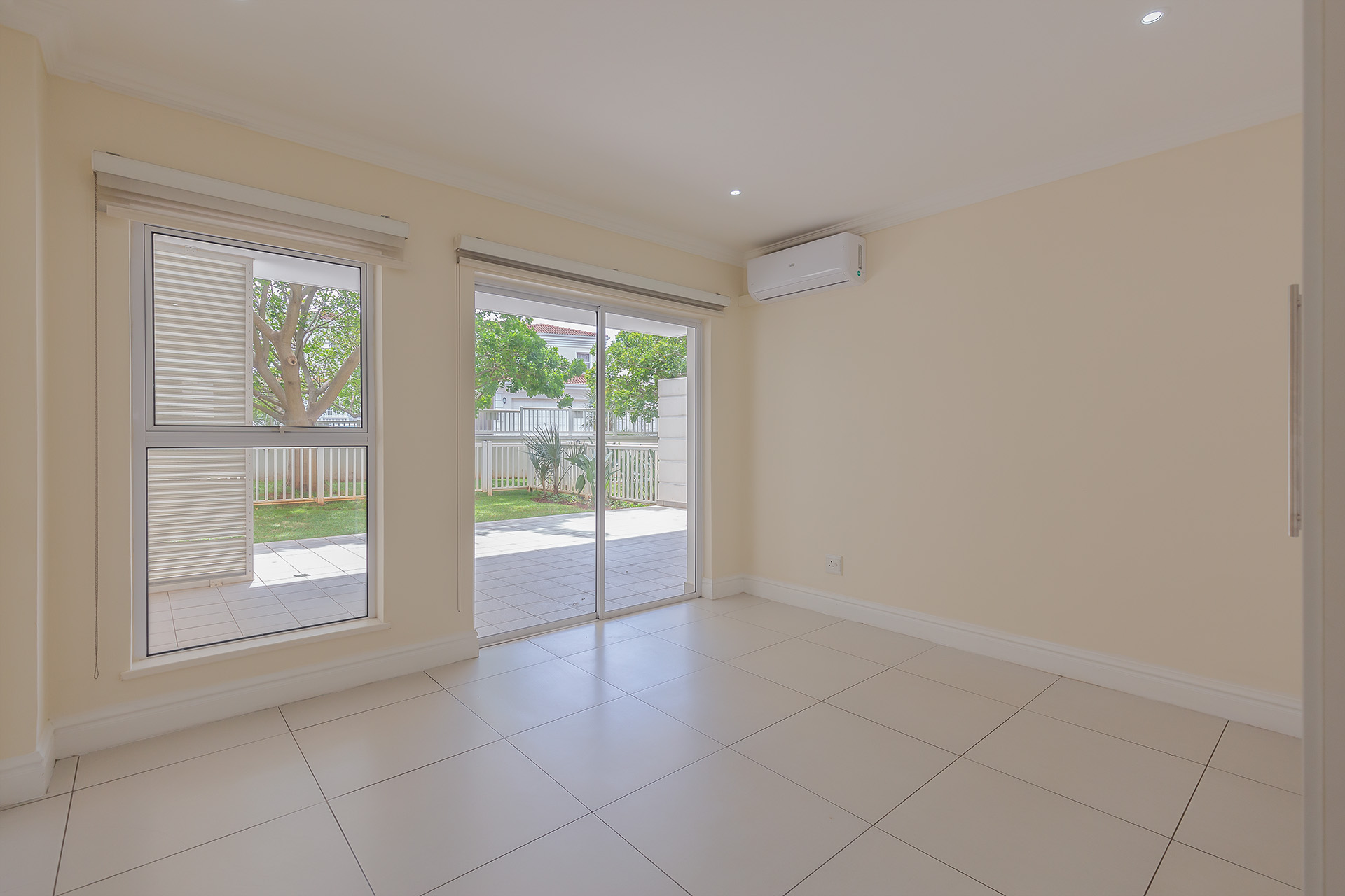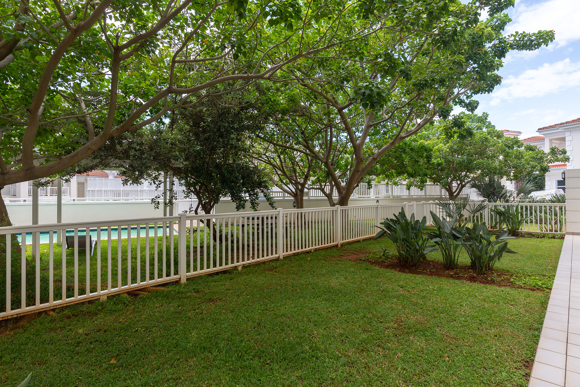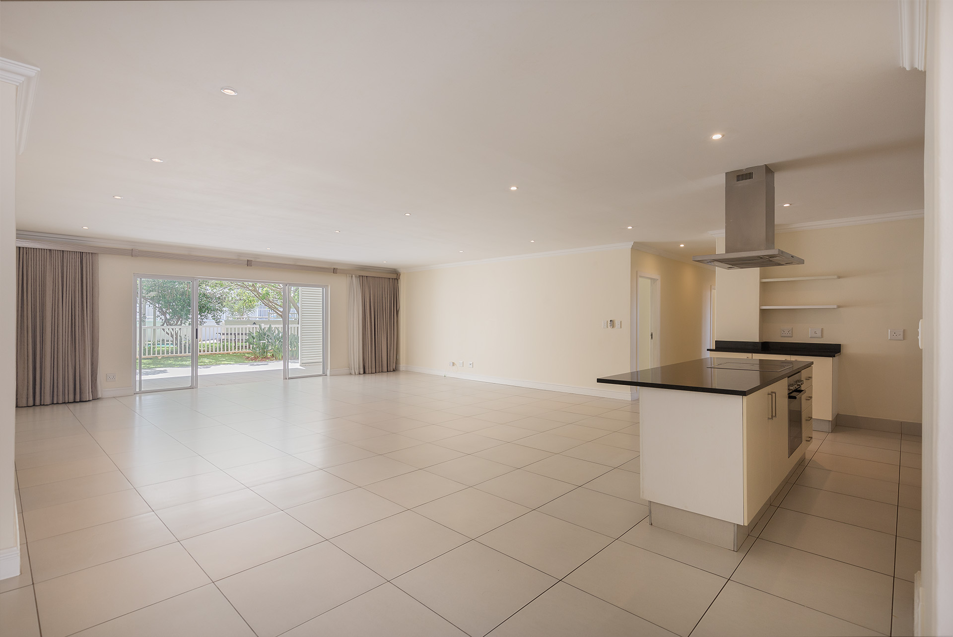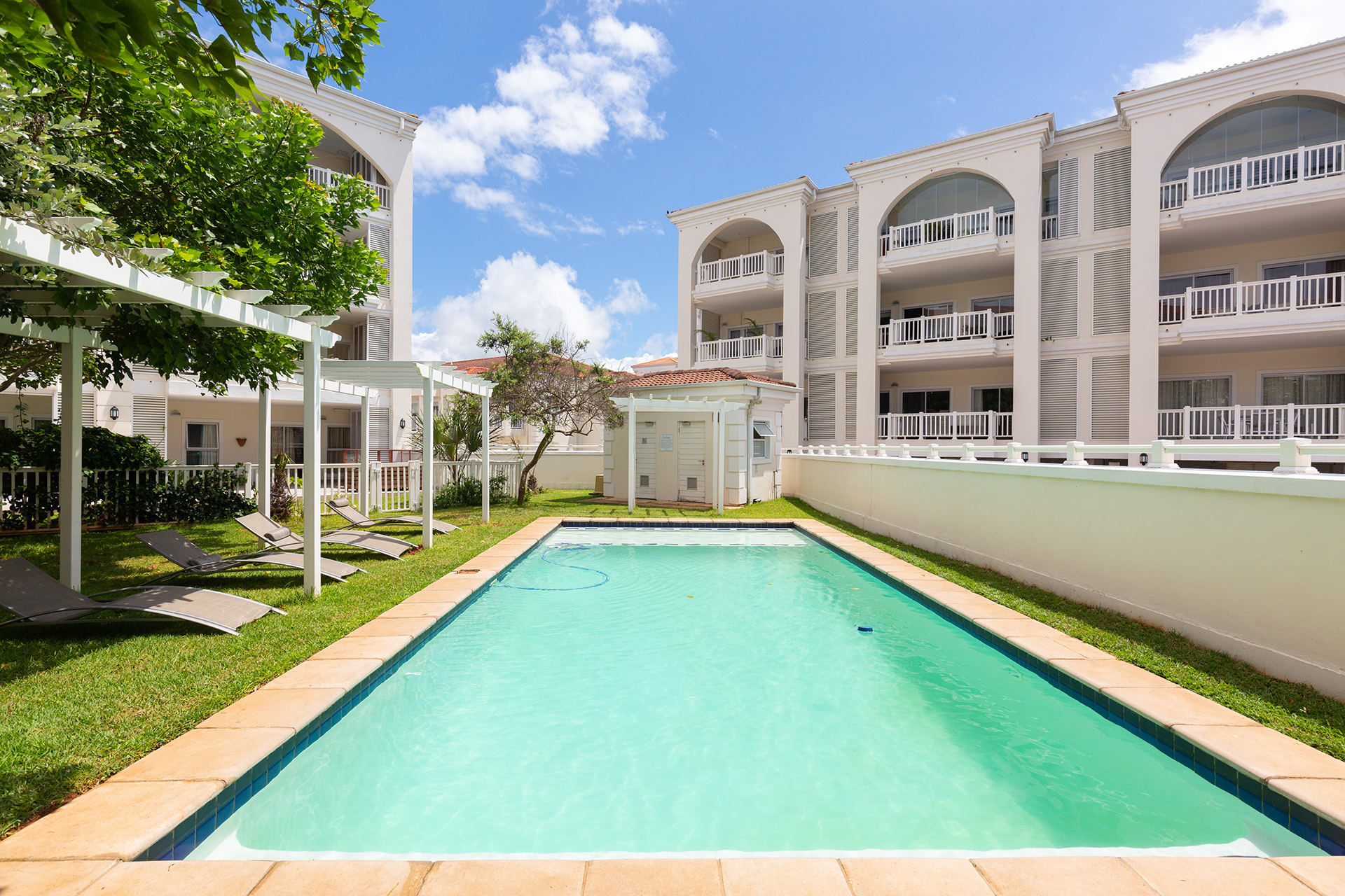 This immaculate ground floor unit offers open plan living spaces with stack back doors that open out to a small neat garden overlooking the communal pool. The large open plan kitchen includes a modern granite kitchen equipped with ample cupboard and cabinet space, connections for washing machine and dish washer and centre island with electric stove and oven. The unit also offers a guest loo for convenience.