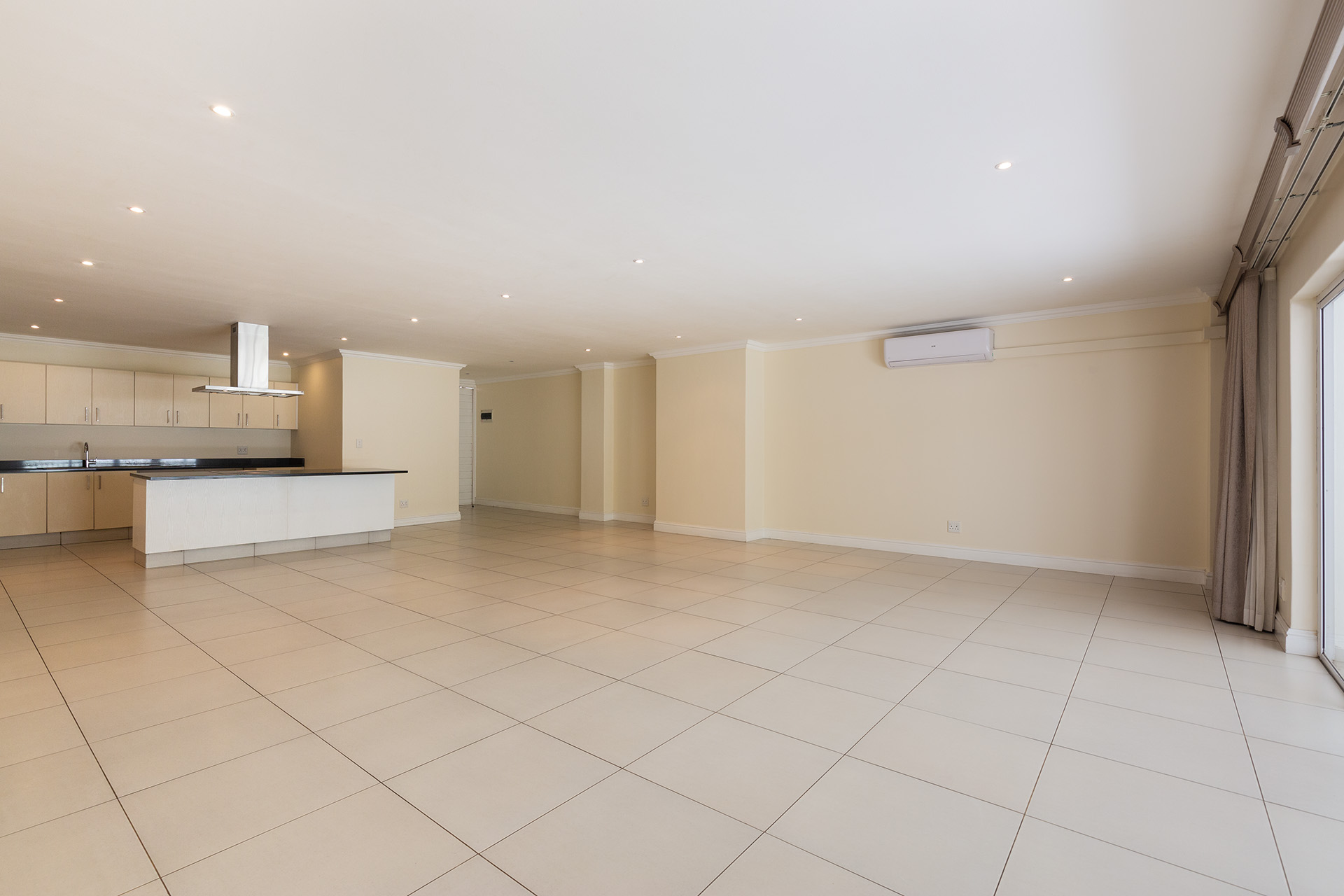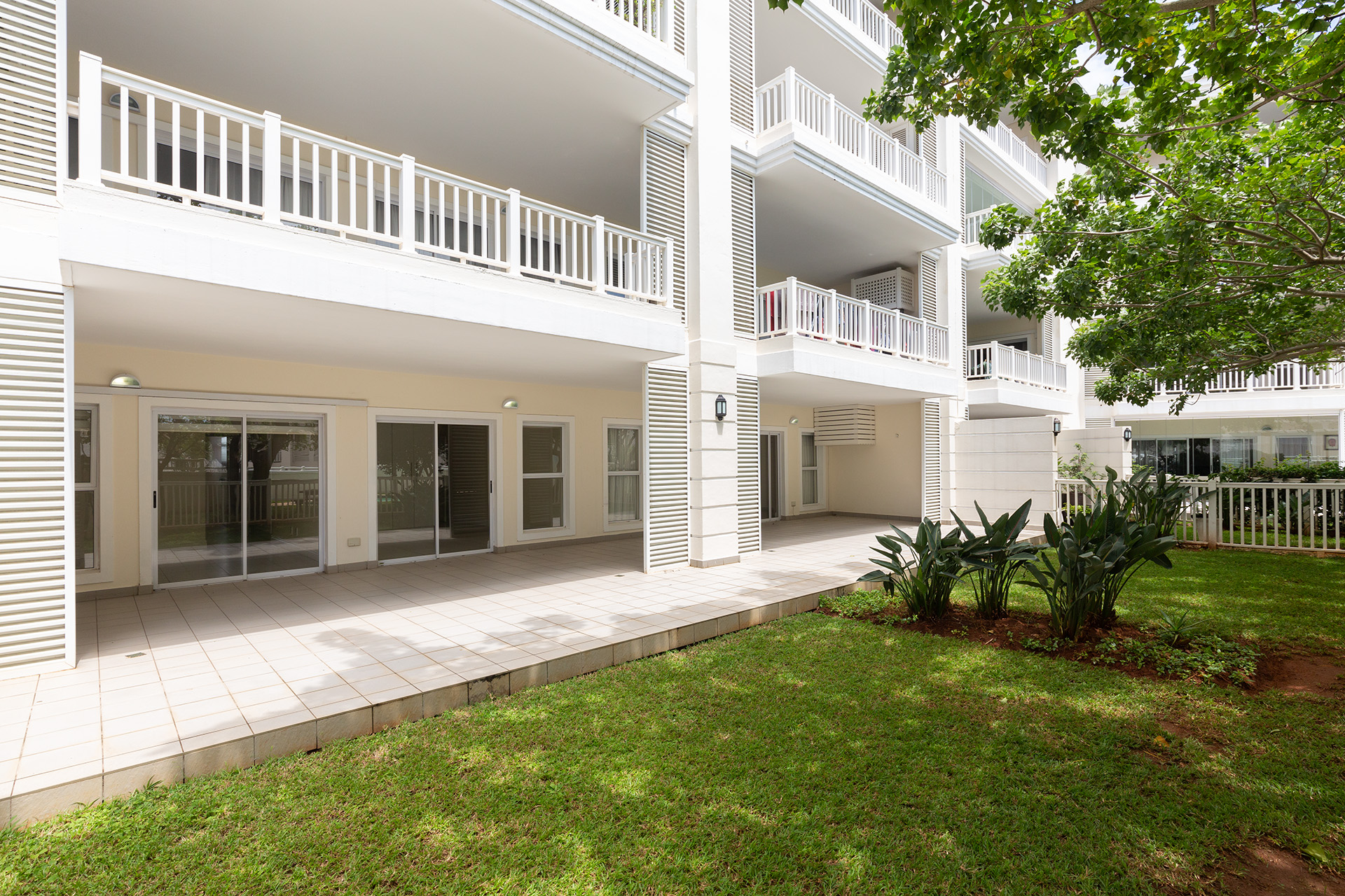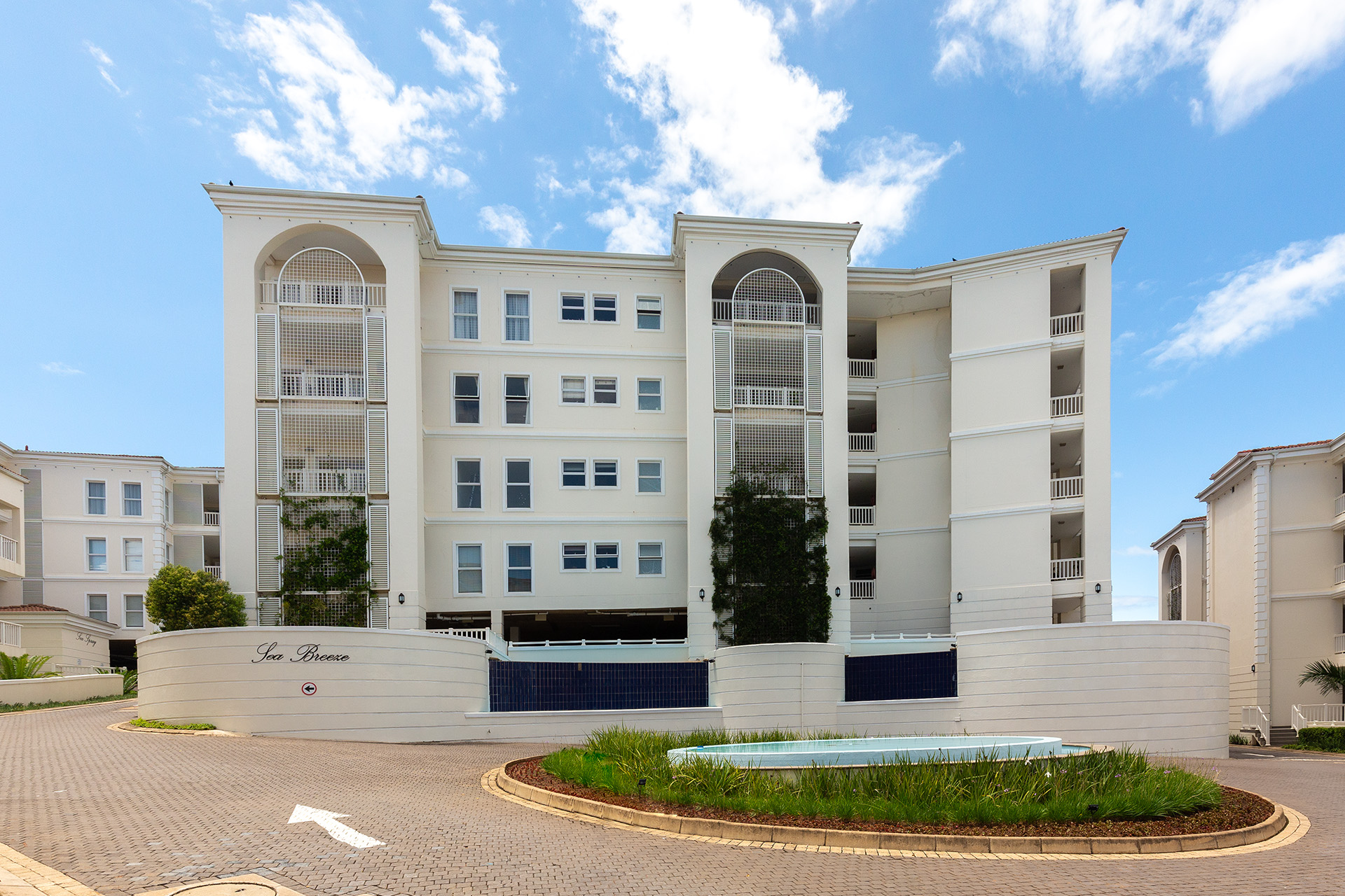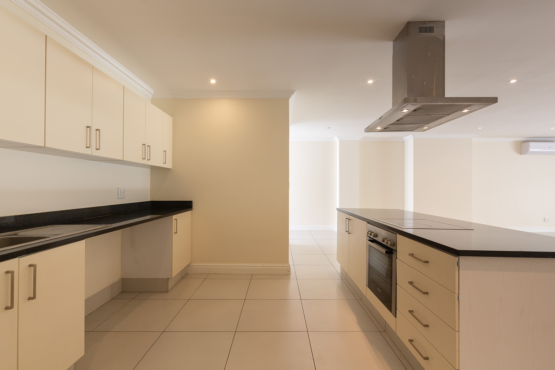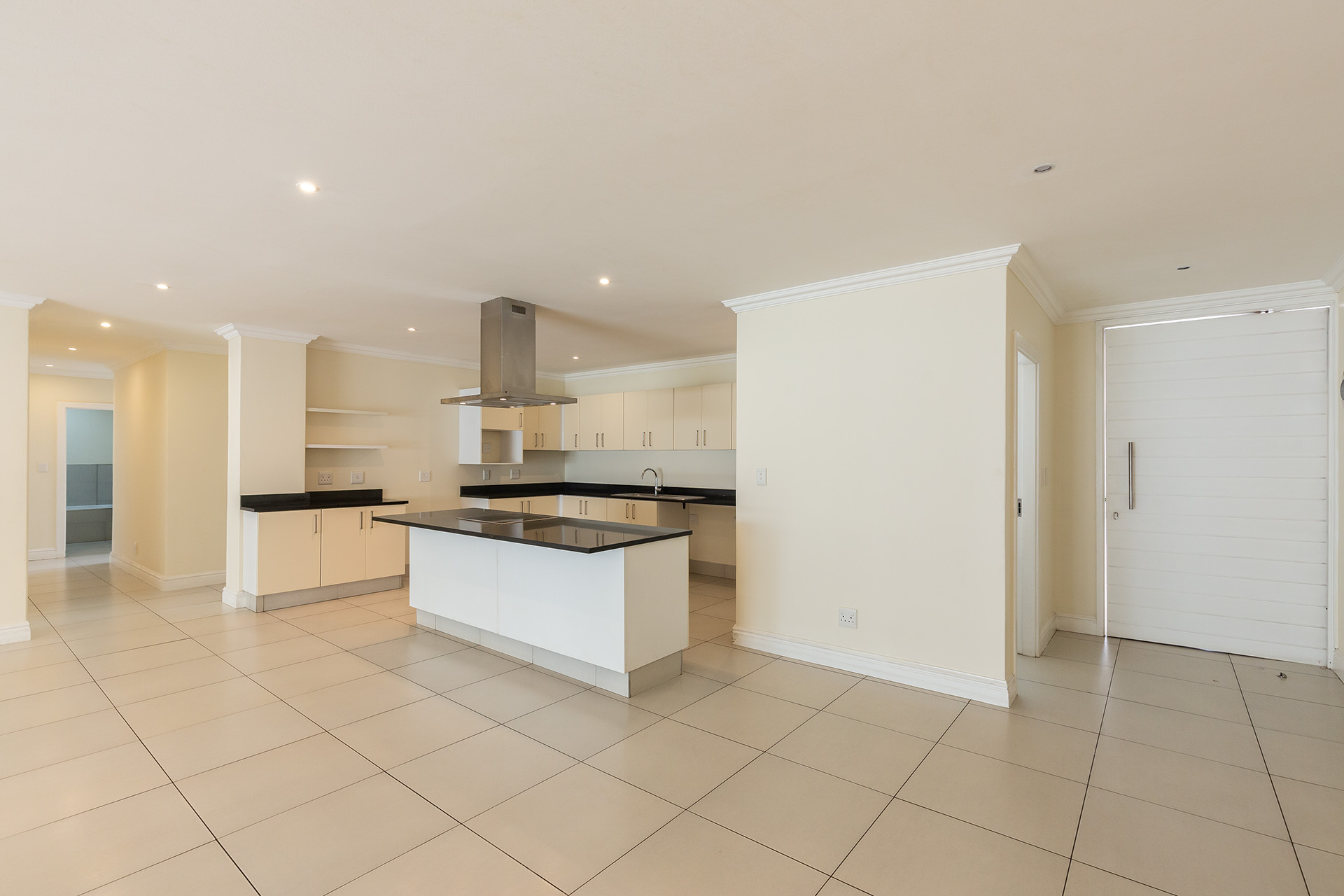 This immaculate ground floor unit offers open plan living spaces with stack back doors that open out to a small neat garden overlooking the communal pool. The large open plan kitchen includes a modern granite kitchen equipped with ample cupboard and cabinet space, connections for washing machine and dish washer and centre island with electric stove and oven. The unit also offers a guest loo for convenience.