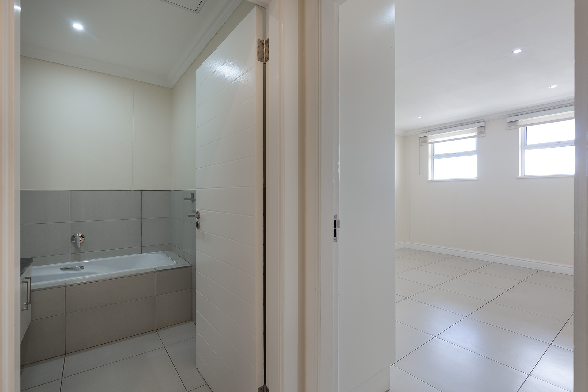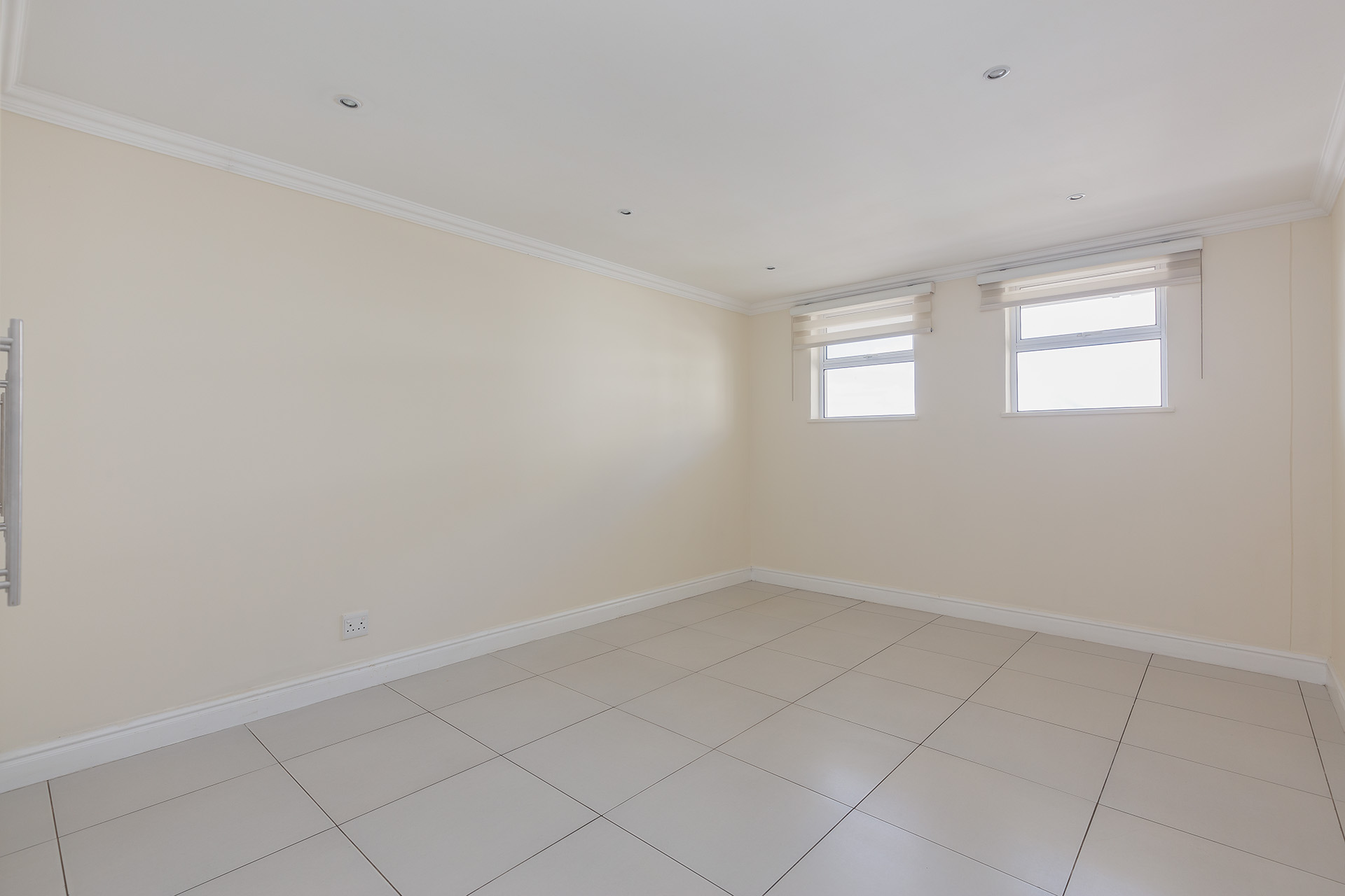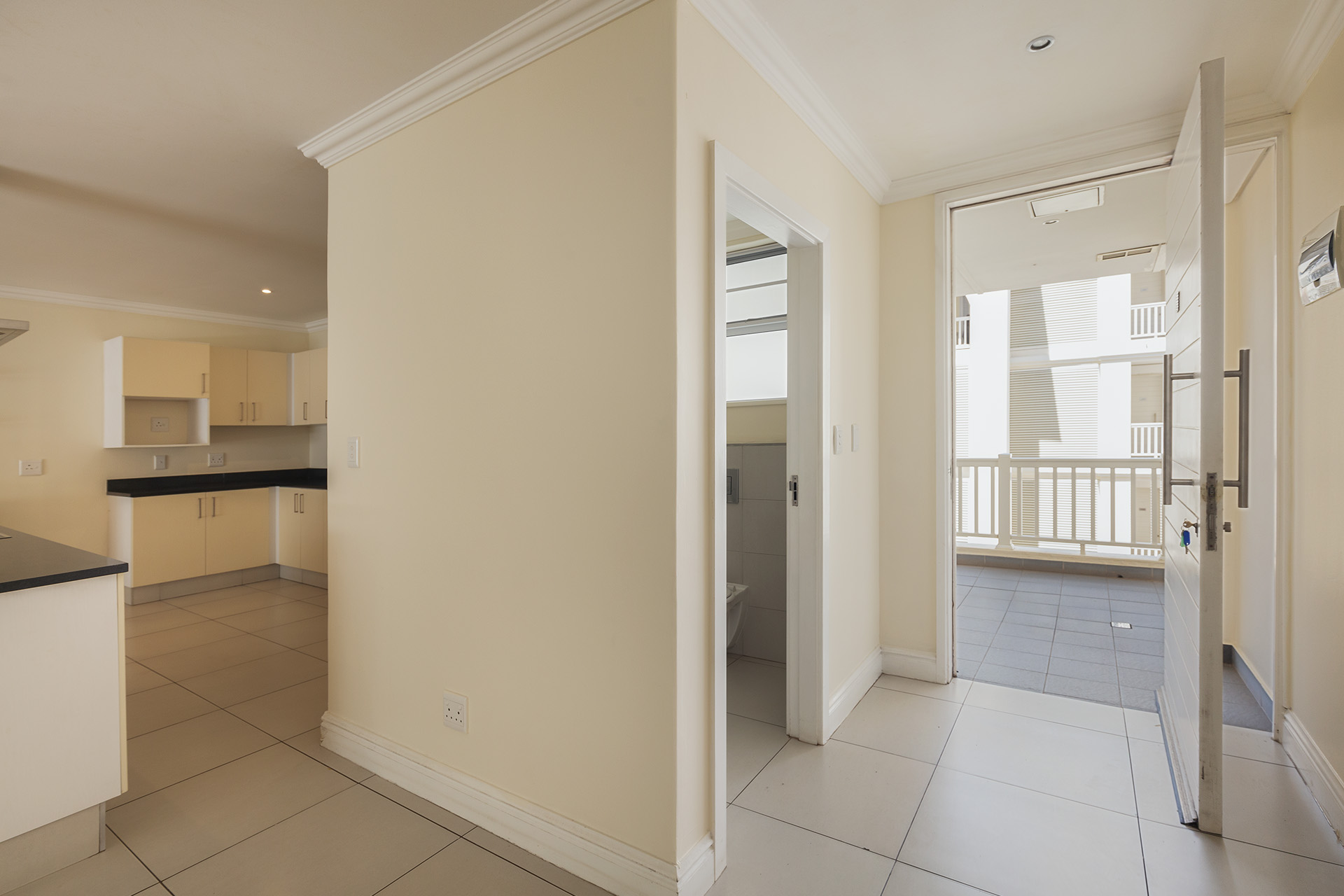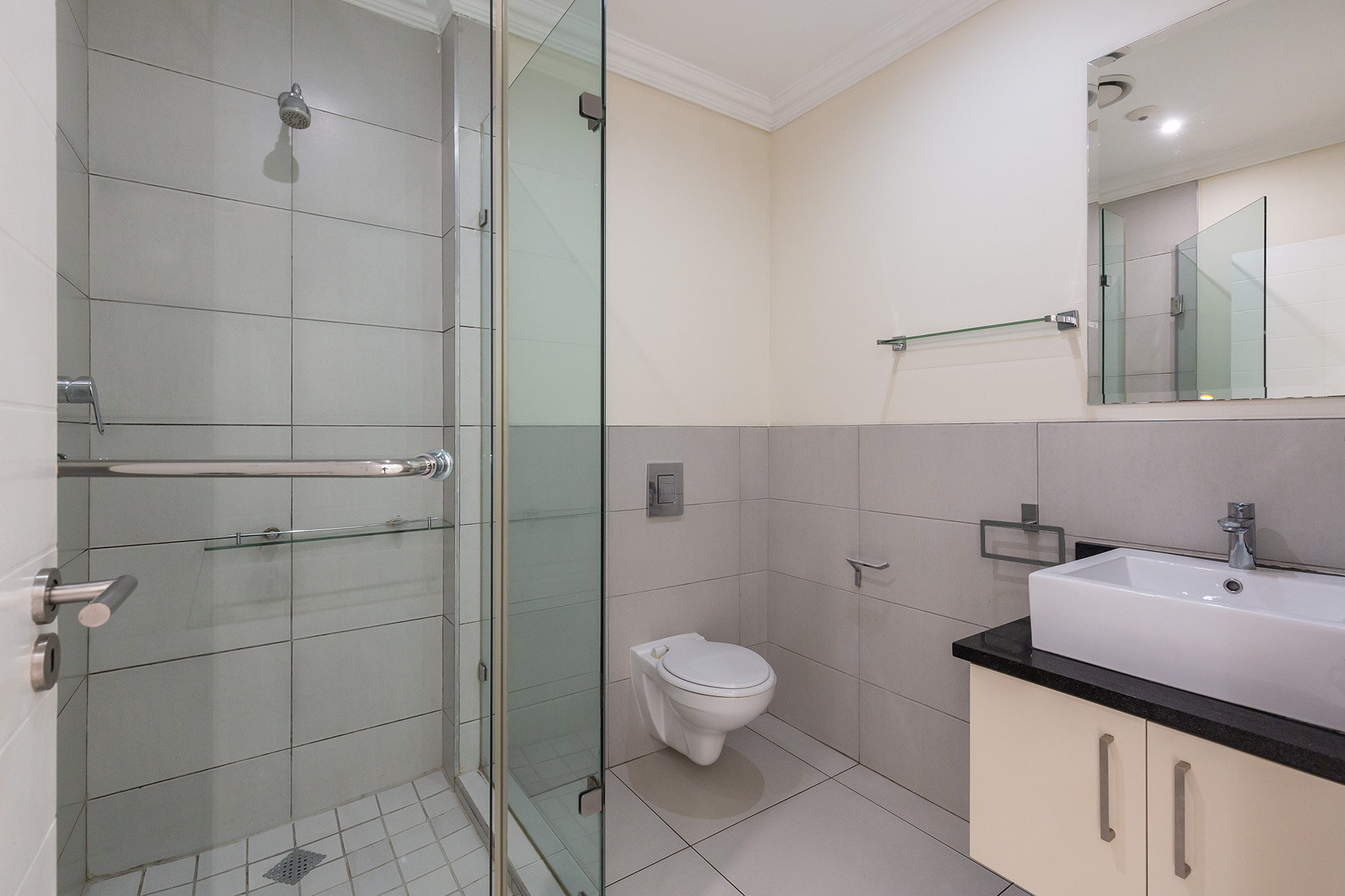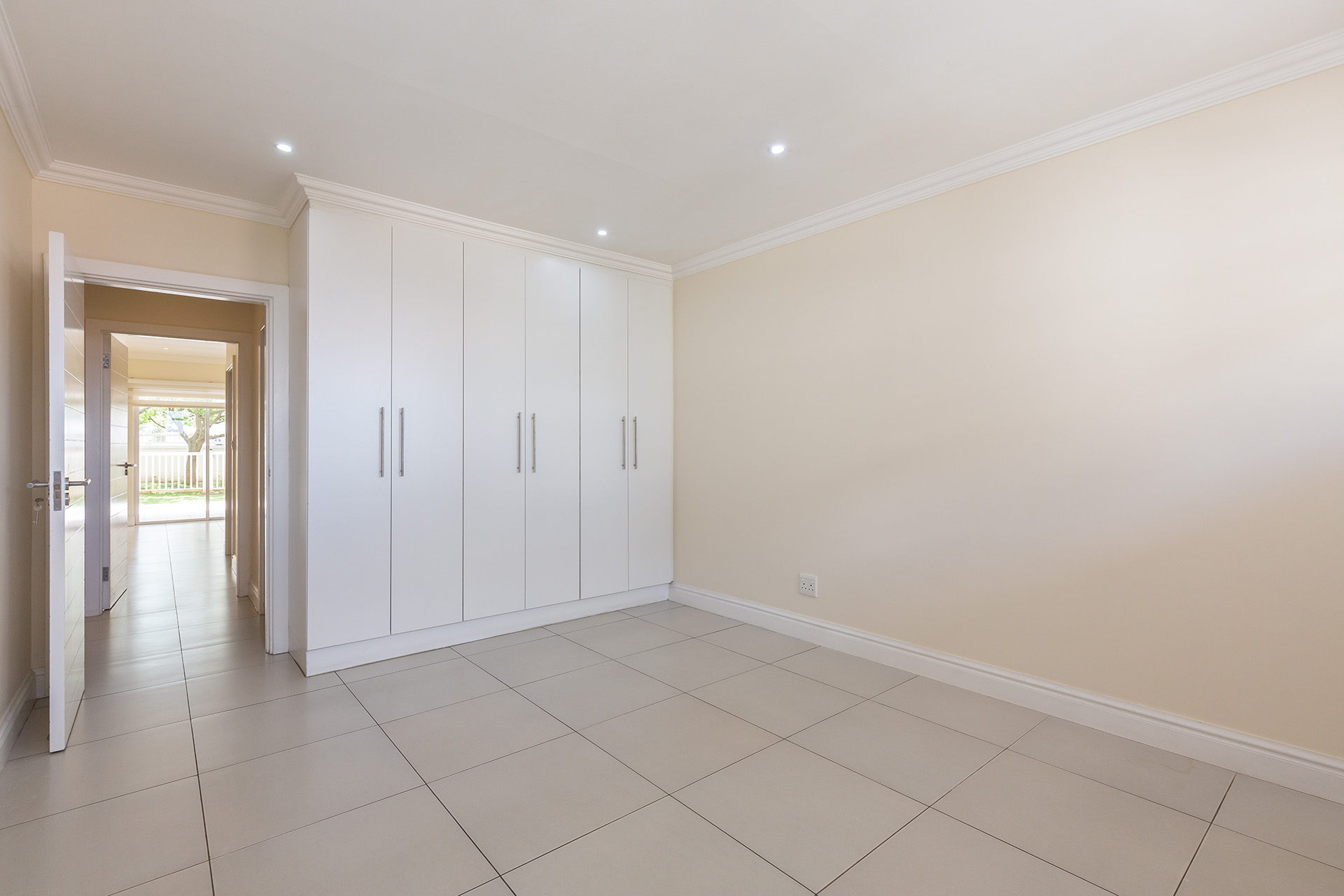This immaculate ground floor unit offers open plan living spaces with stack back doors that open out to a small neat garden overlooking the communal pool. The large open plan kitchen includes a modern granite kitchen equipped with ample cupboard and cabinet space, connections for washing machine and dish washer and centre island with electric stove and oven. The unit also offers a guest loo for convenience.
