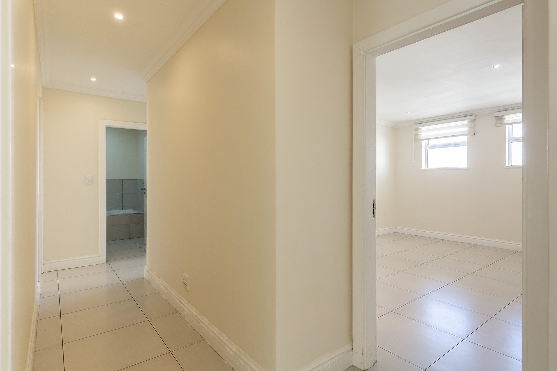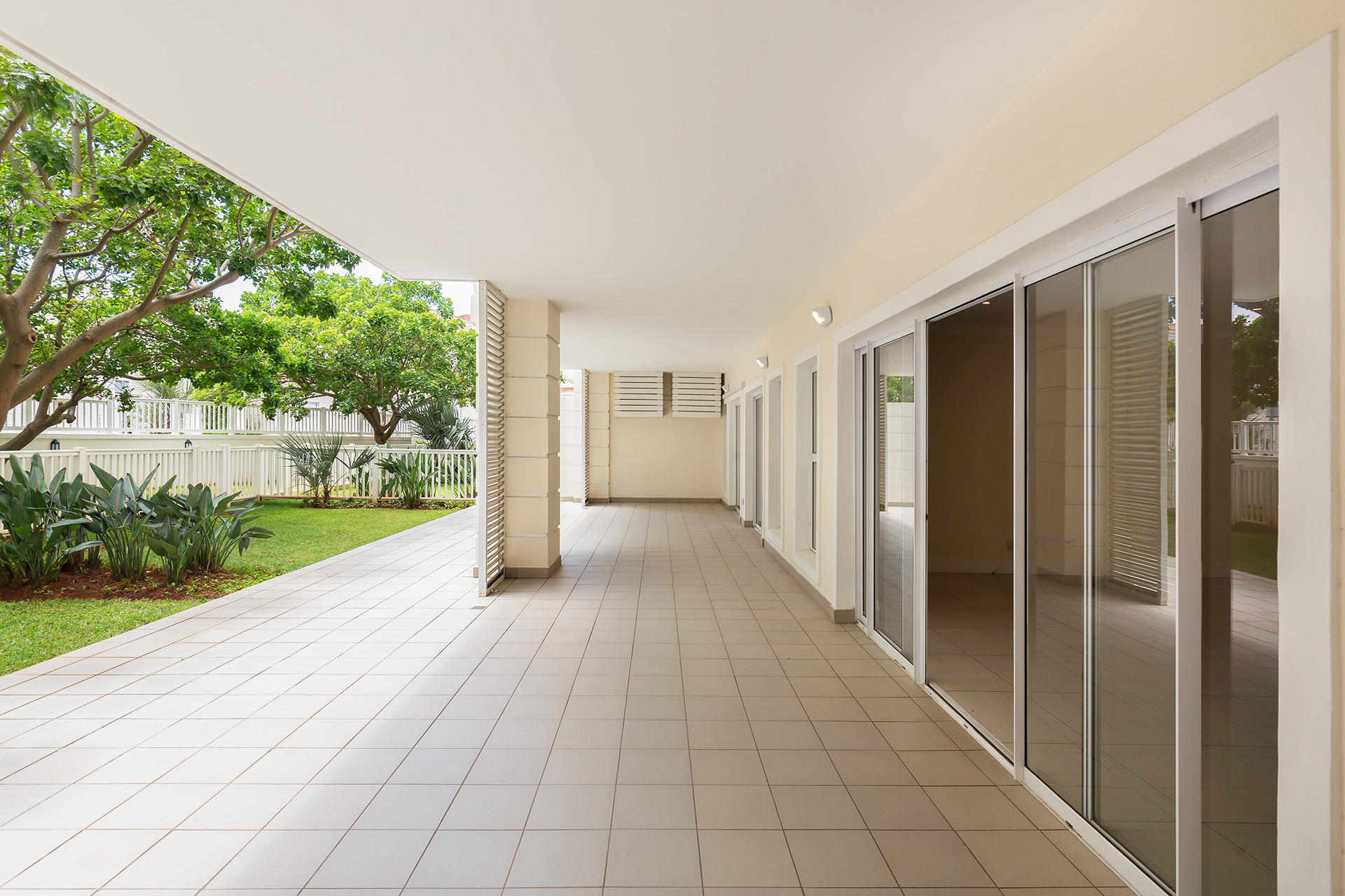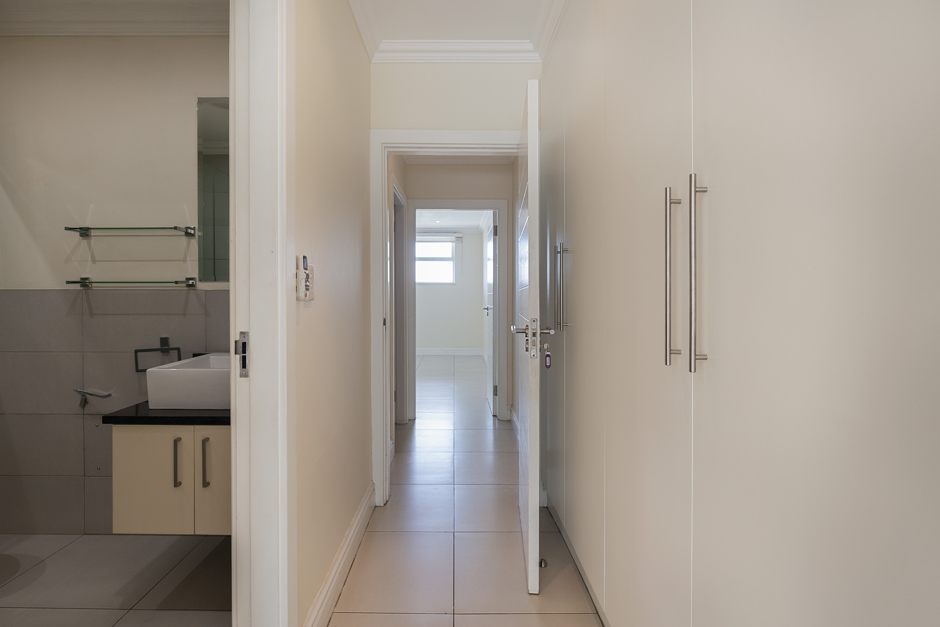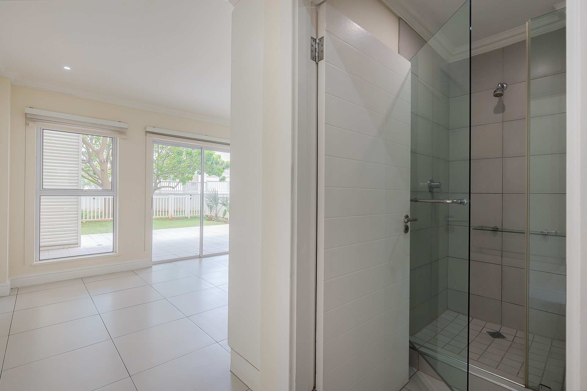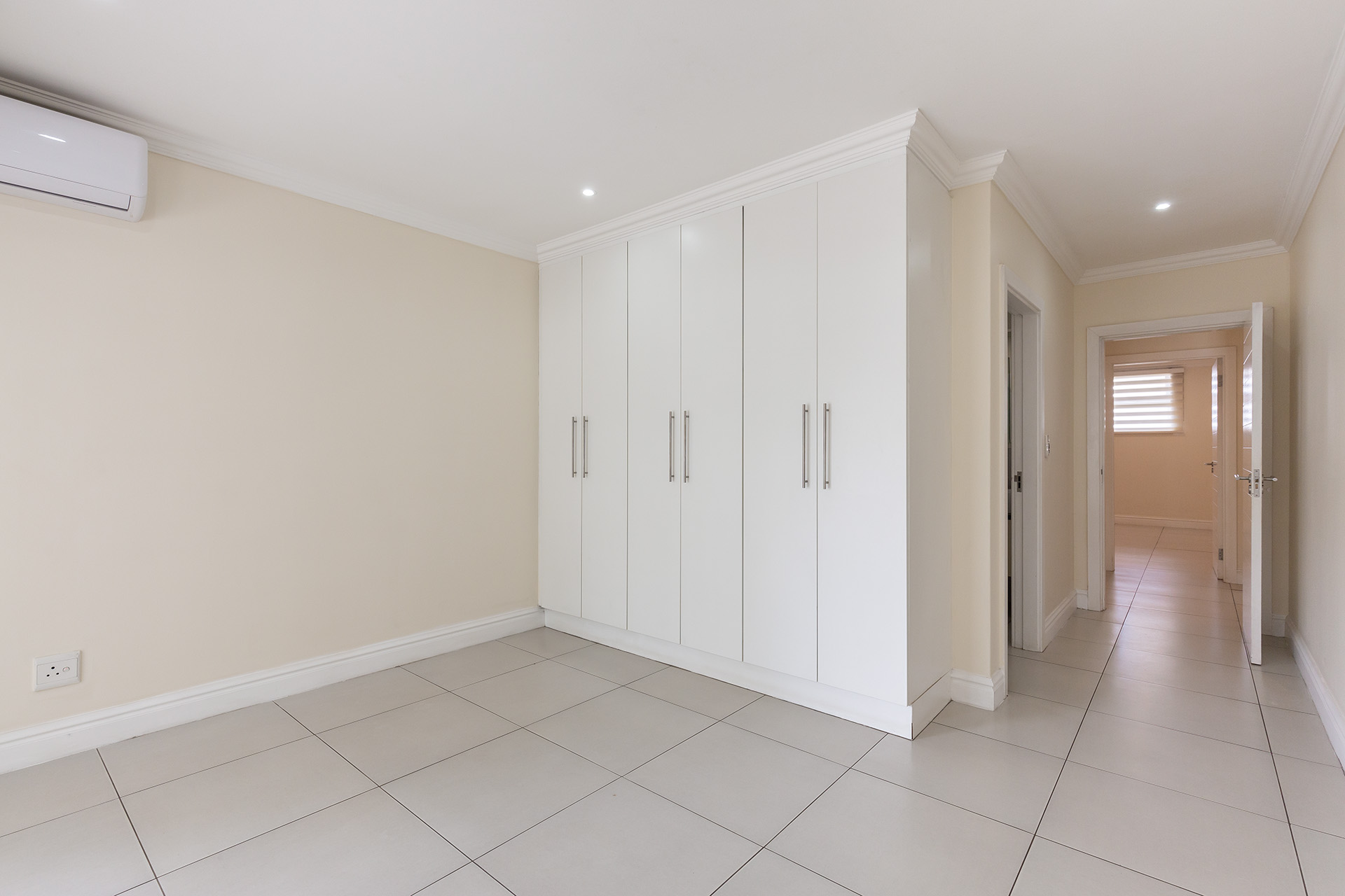 There are four bedrooms with two bedrooms having en suite bathrooms and also lead out to the veranda and garden. Both en suite bathrooms have showers , toilets and basins. The other two bedrooms share the third bathroom with a bath , toilet and basin. All bedrooms are fitted with Built in cupboards and blinds and two are fitted with aircon for those hot humid days.