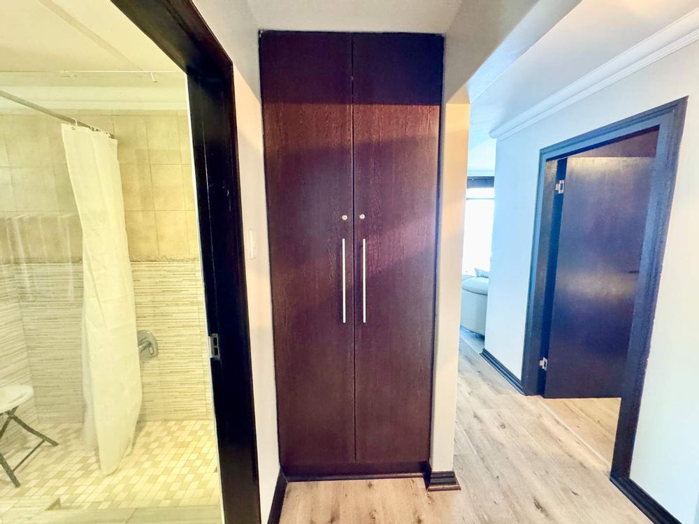 The apartment features three well-appointed bedrooms, each equipped with built-in cupboards and ceiling fans. The master bedroom boasts a full en-suite bathroom, while the other two bedrooms share a tastefully designed family bathroom with a large shower.