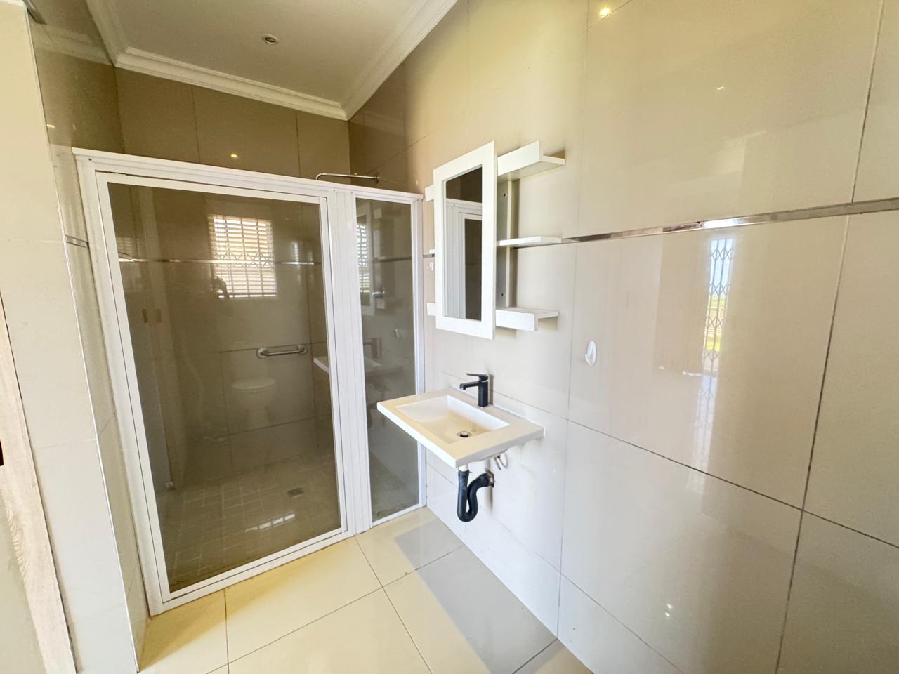 The two bathroom features a spacious, modern shower with neat, stylish tiles that give the space a clean and contemporary feel.