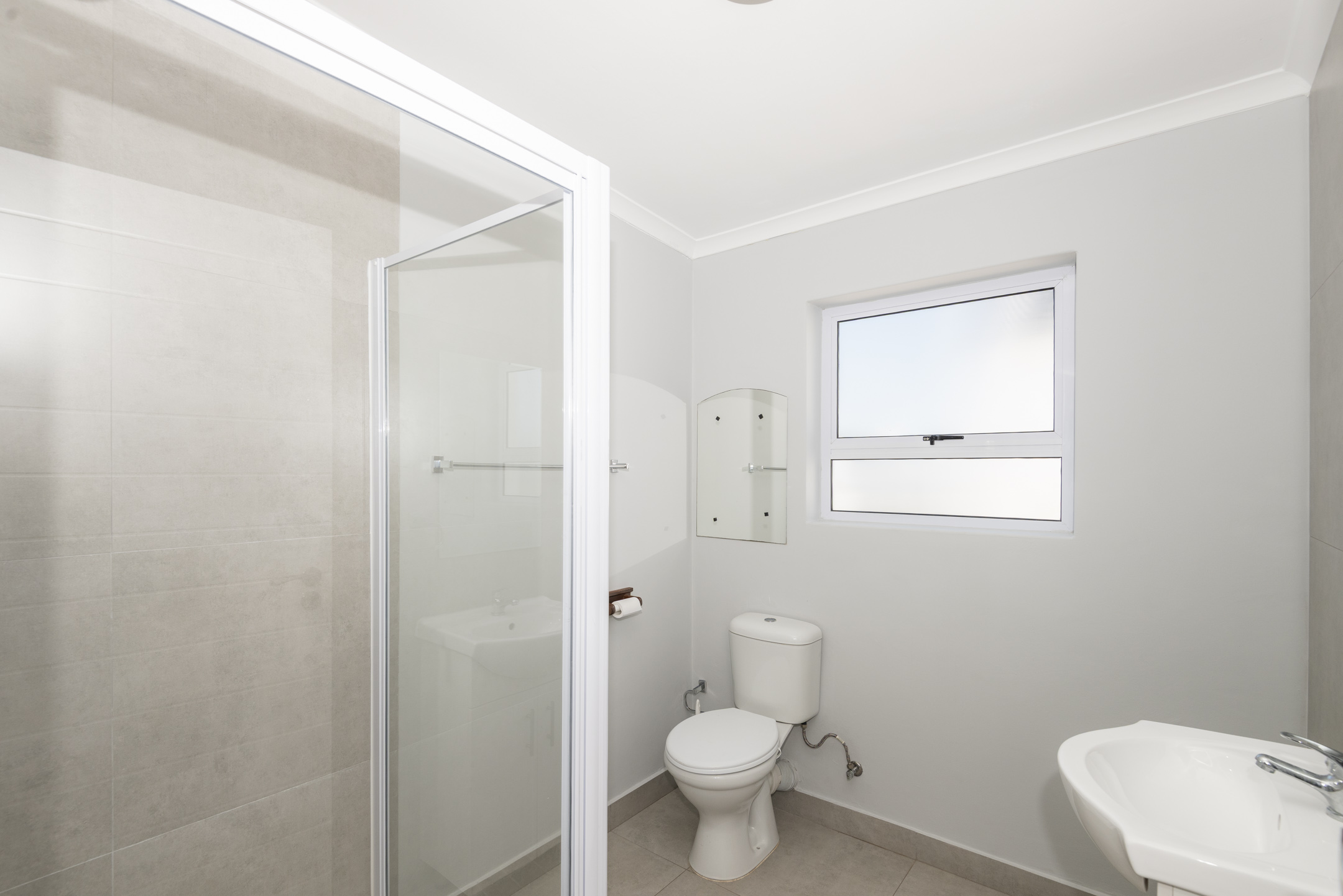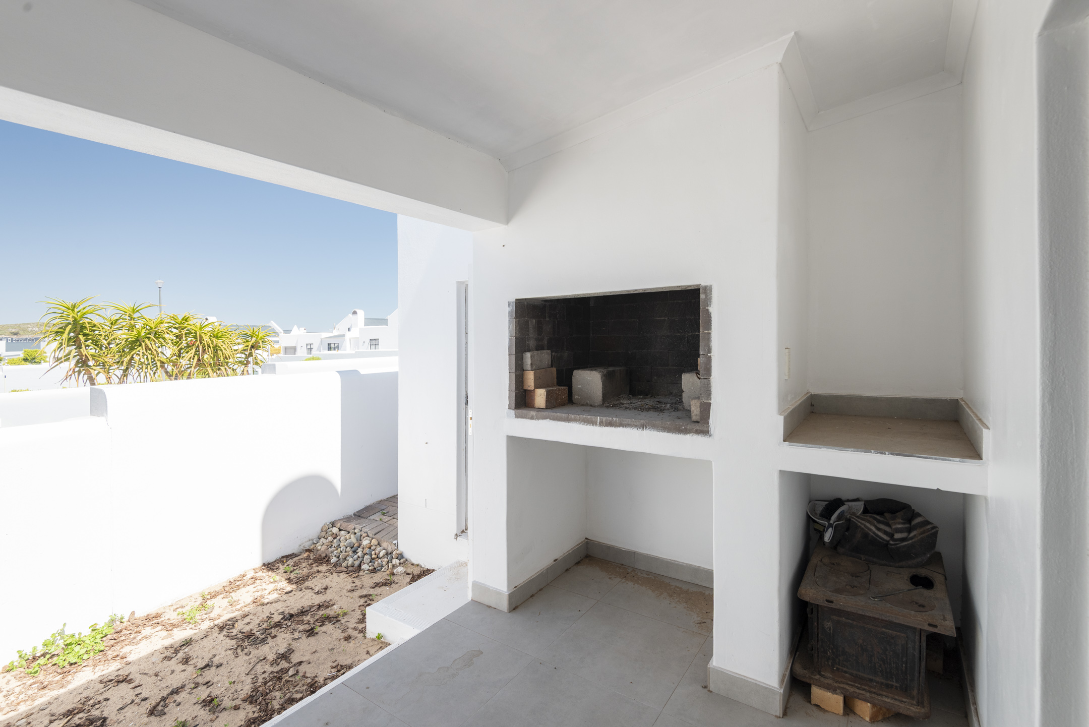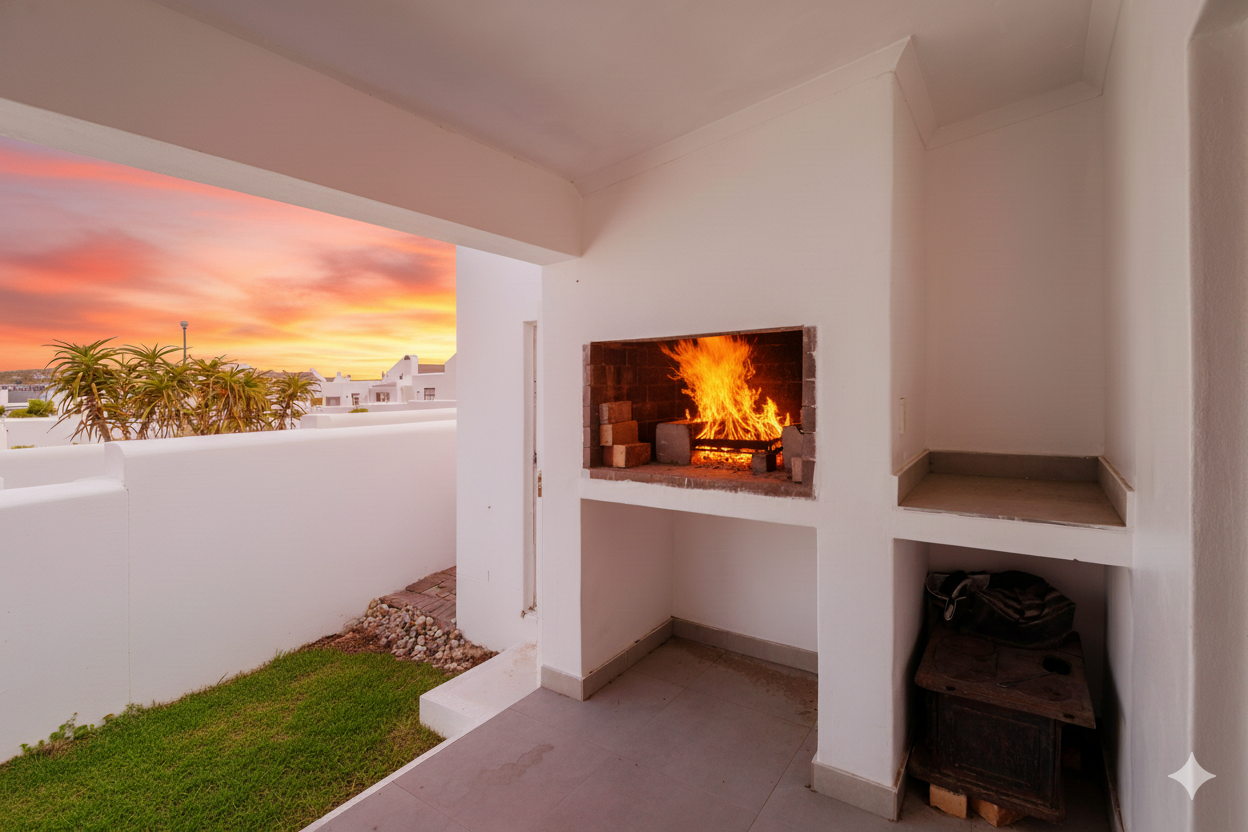 A sliding door opens to a covered patio with a built-in braai, ideal for relaxed evenings or weekend gatherings. The low-maintenance garden ensures you can enjoy outdoor living without the upkeep.