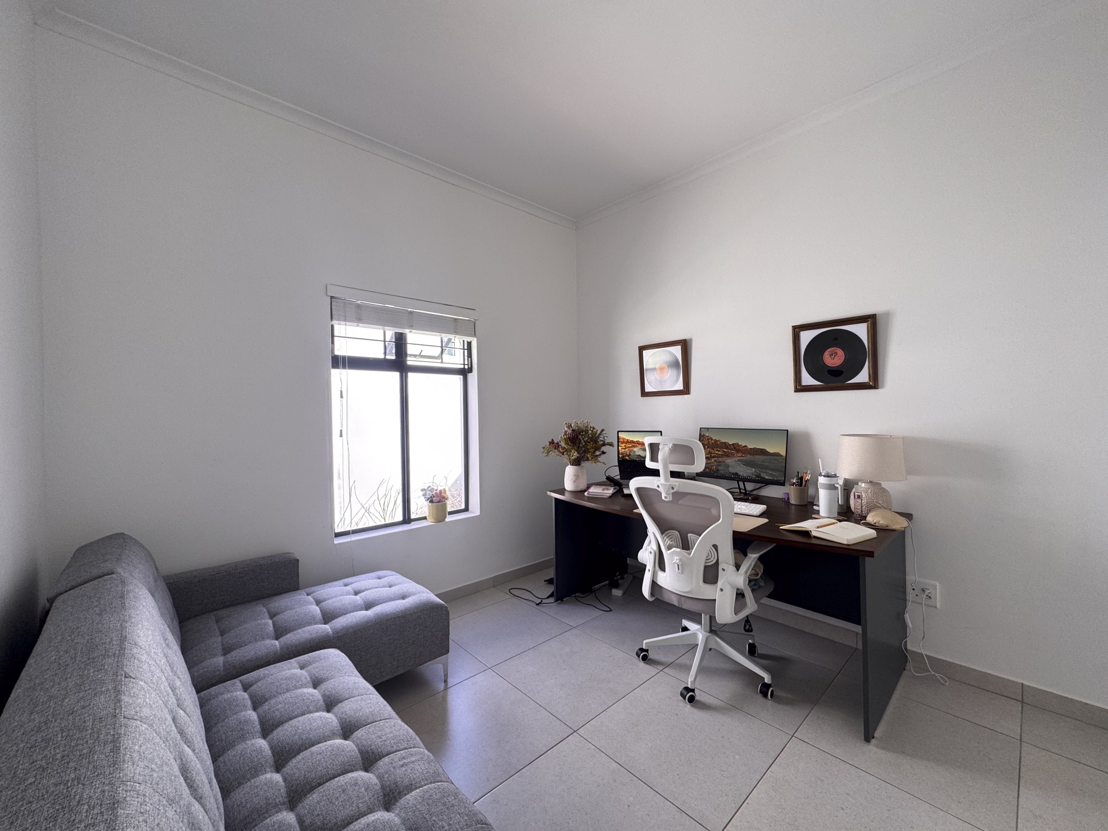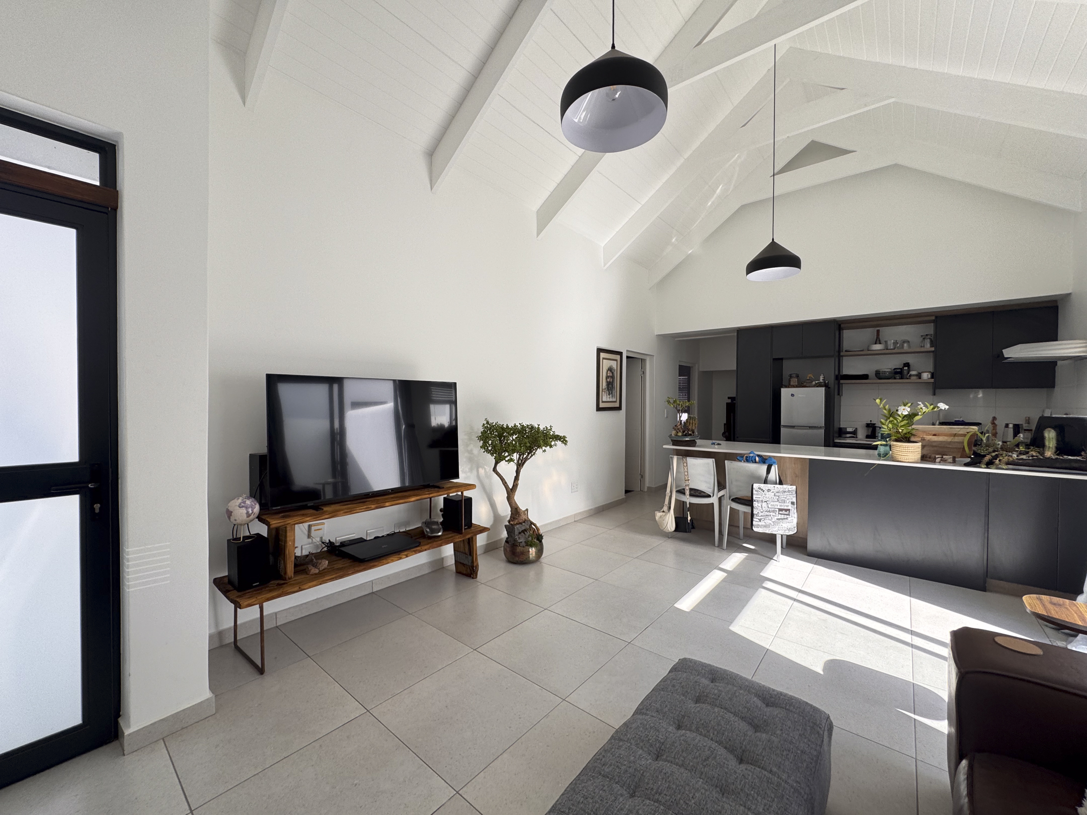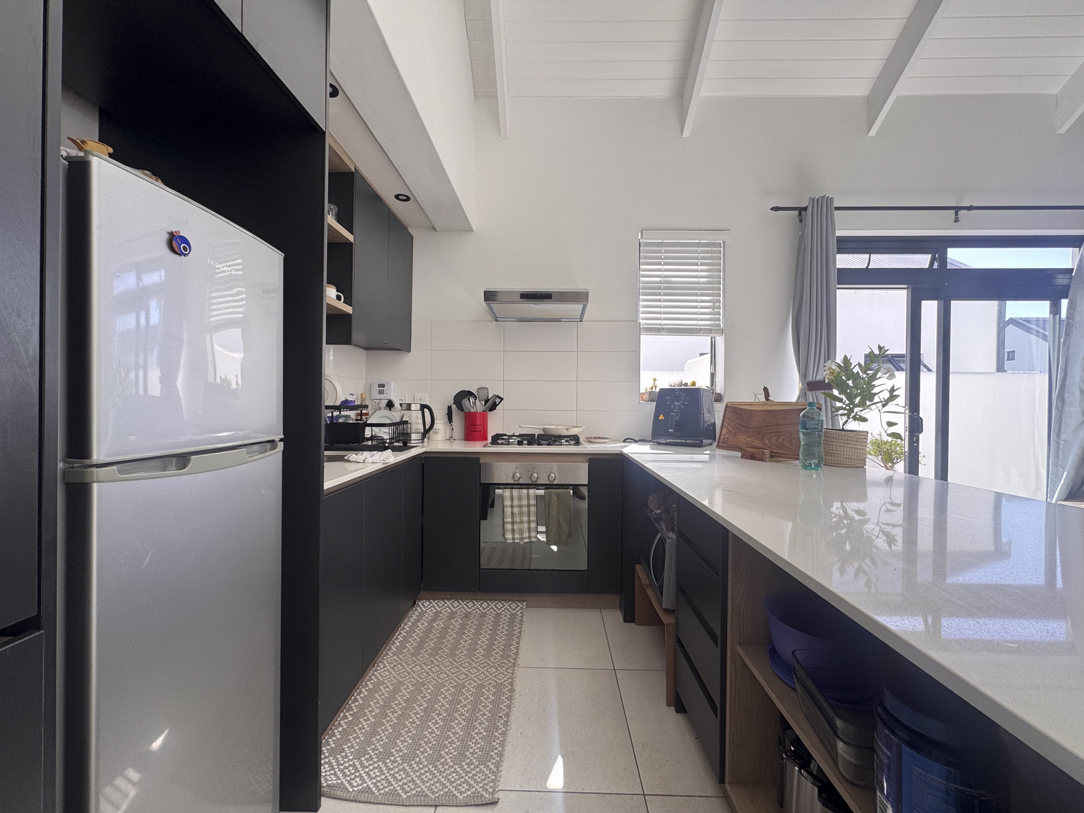 The home is bright and welcoming, with two comfortable bedrooms featuring built-in cupboards, tiled floors and blinds. A full bathroom and a neat open-plan layout make day-to-day living effortless. The modern kitchen includes a centre island, gas hob, gas geyser and space for a dishwasher — practical and easy to maintain.