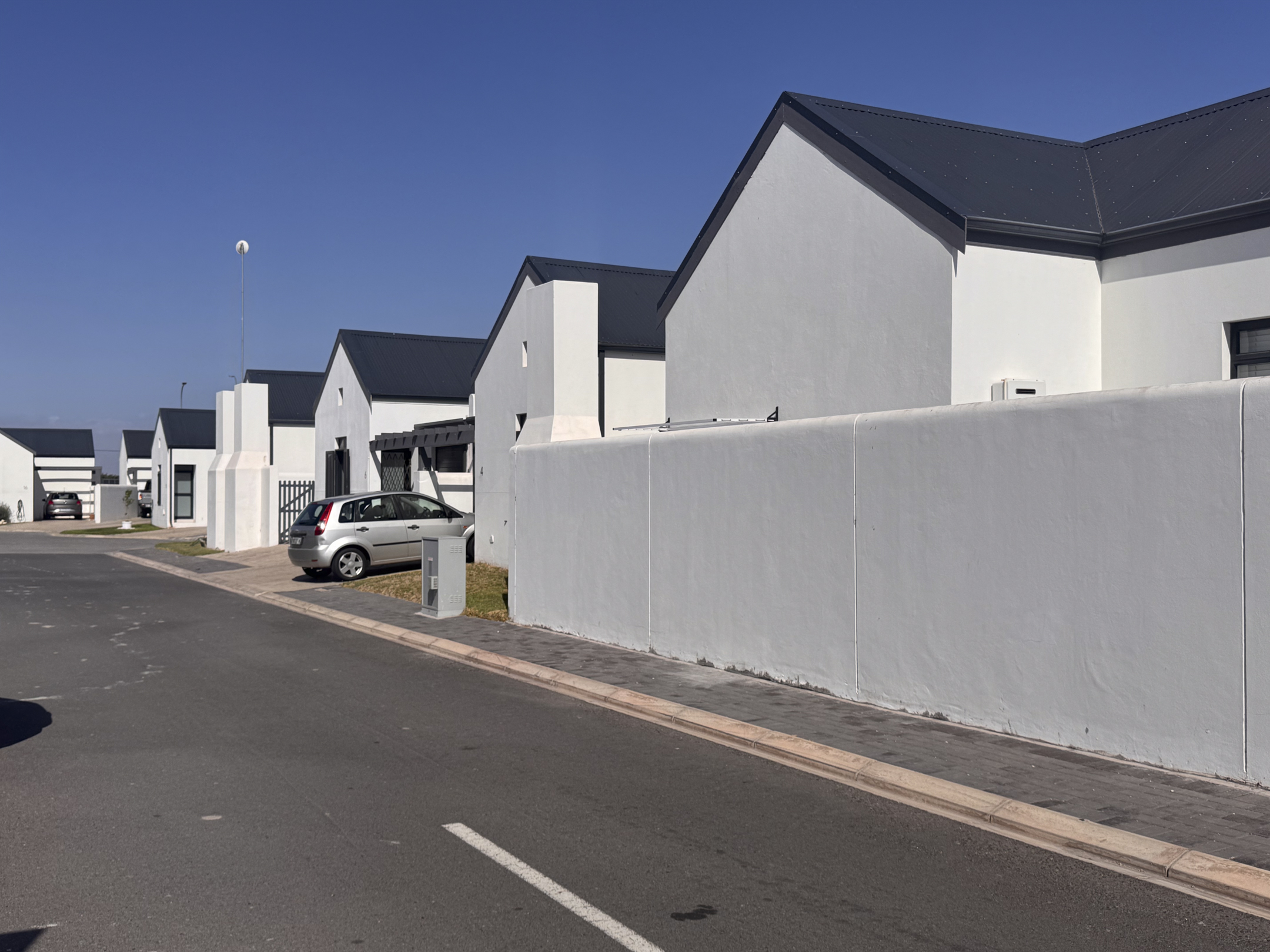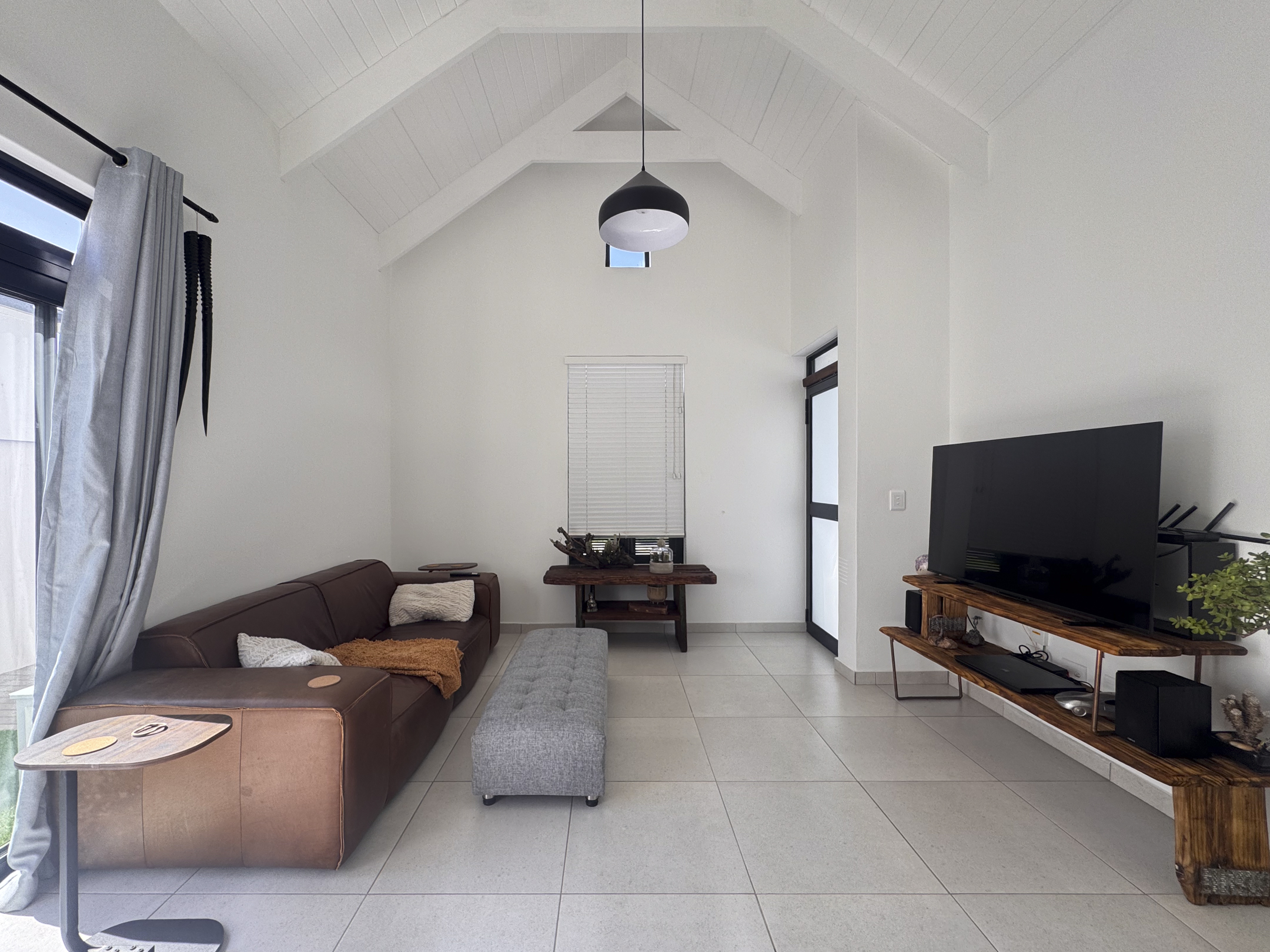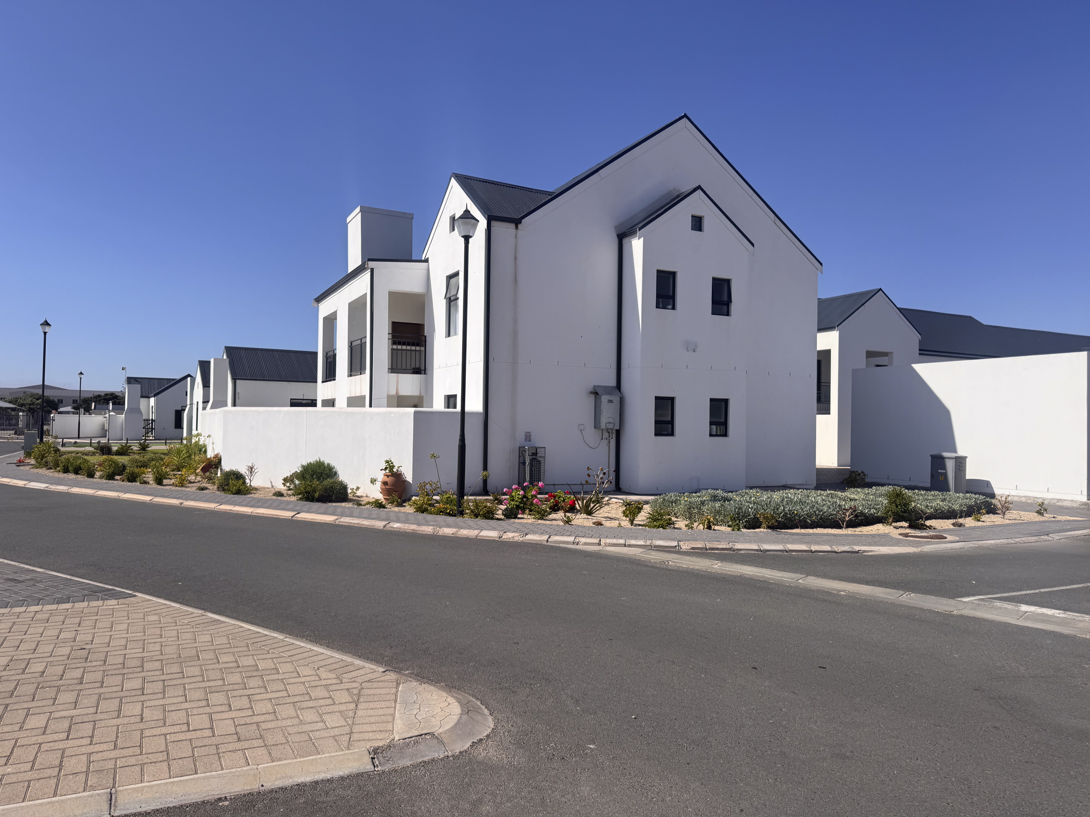 The home is bright and welcoming, with two comfortable bedrooms featuring built-in cupboards, tiled floors and blinds. A full bathroom and a neat open-plan layout make day-to-day living effortless. The modern kitchen includes a centre island, gas hob, gas geyser and space for a dishwasher — practical and easy to maintain.